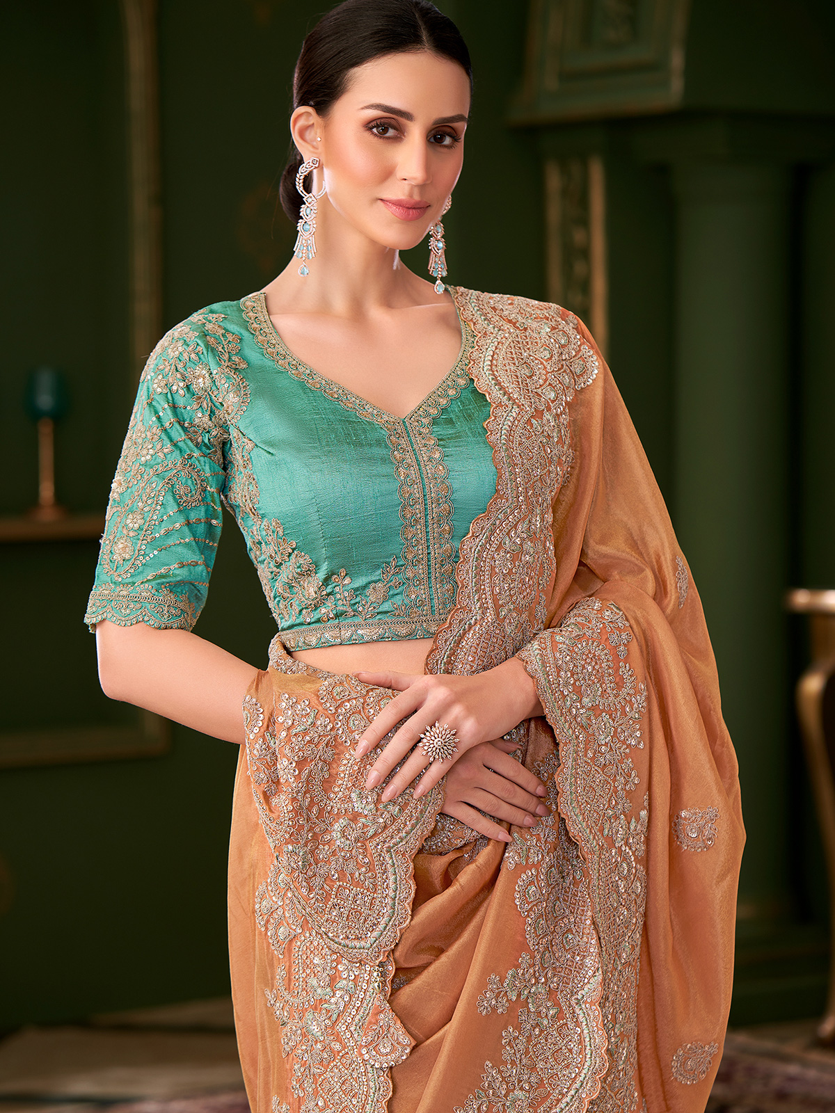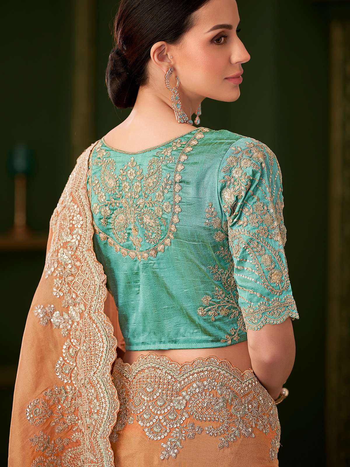 Soft peach viscose georgette silk gives this saree a graceful finish, adorned with refined embroidery enhanced by sequins, zardosi and thread detailing. Complemented by a contrast unstitched blouse piece, it offers effortless elegance for weddings and festive celebrations.