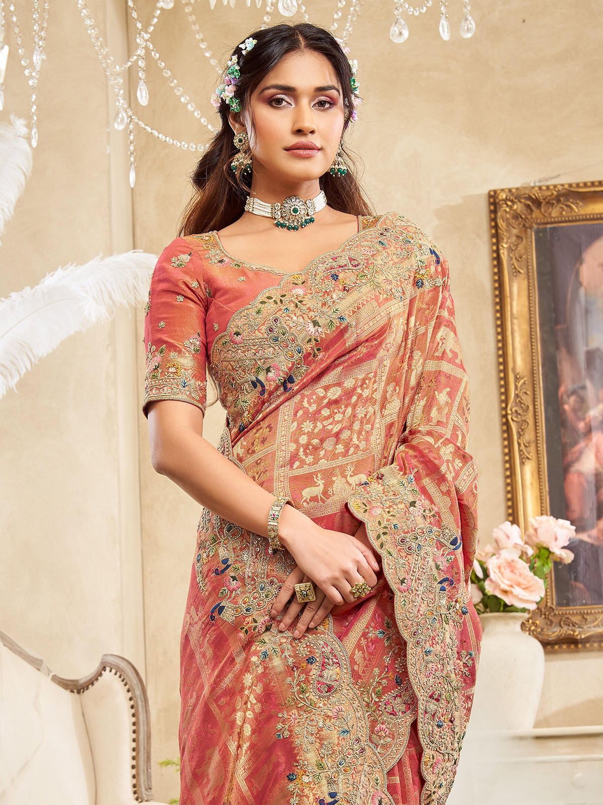 Step into festive sophistication with this elegant peach giraffe viscose silk saree crafted for special occasions. The saree is adorned with intricate resham, sequins, zari, and thread embroidery, adding rich texture and brilliance to the design. Paired with a coordinated unstitched blouse piece, it is perfect for festivals, weddings, and grand celebrations.
