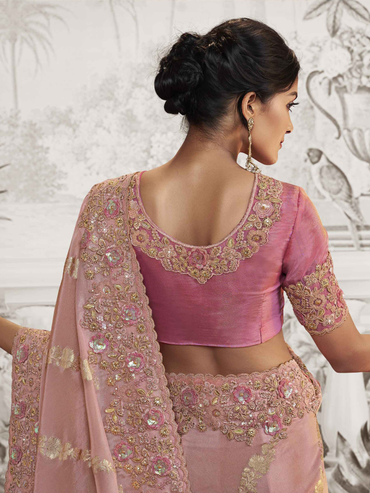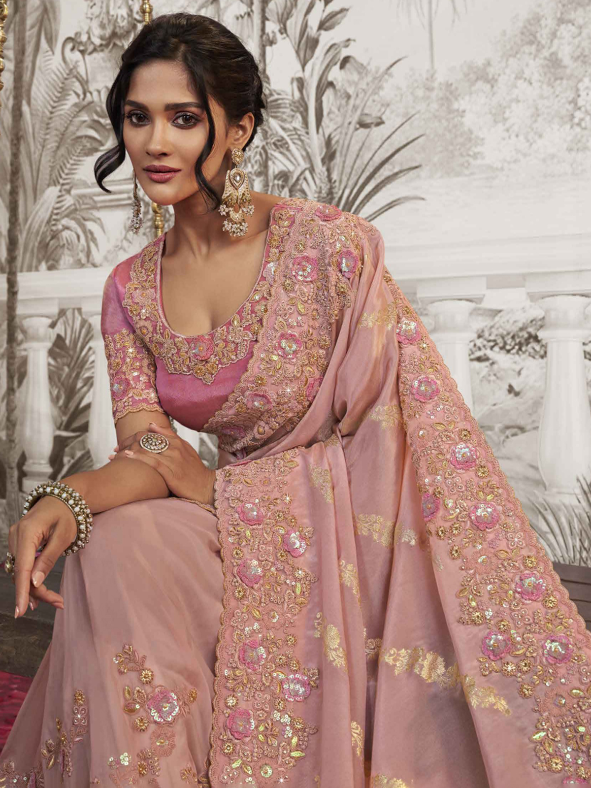 Flaunt traditional beauty in this peach silk saree shimmering with zari highlights. The eye-catching border sparkles with mirror, embroidery, resham, sequins, and stone embellishments. A similarly ornate unstitched blouse completes the look for weddings or celebratory occasions.