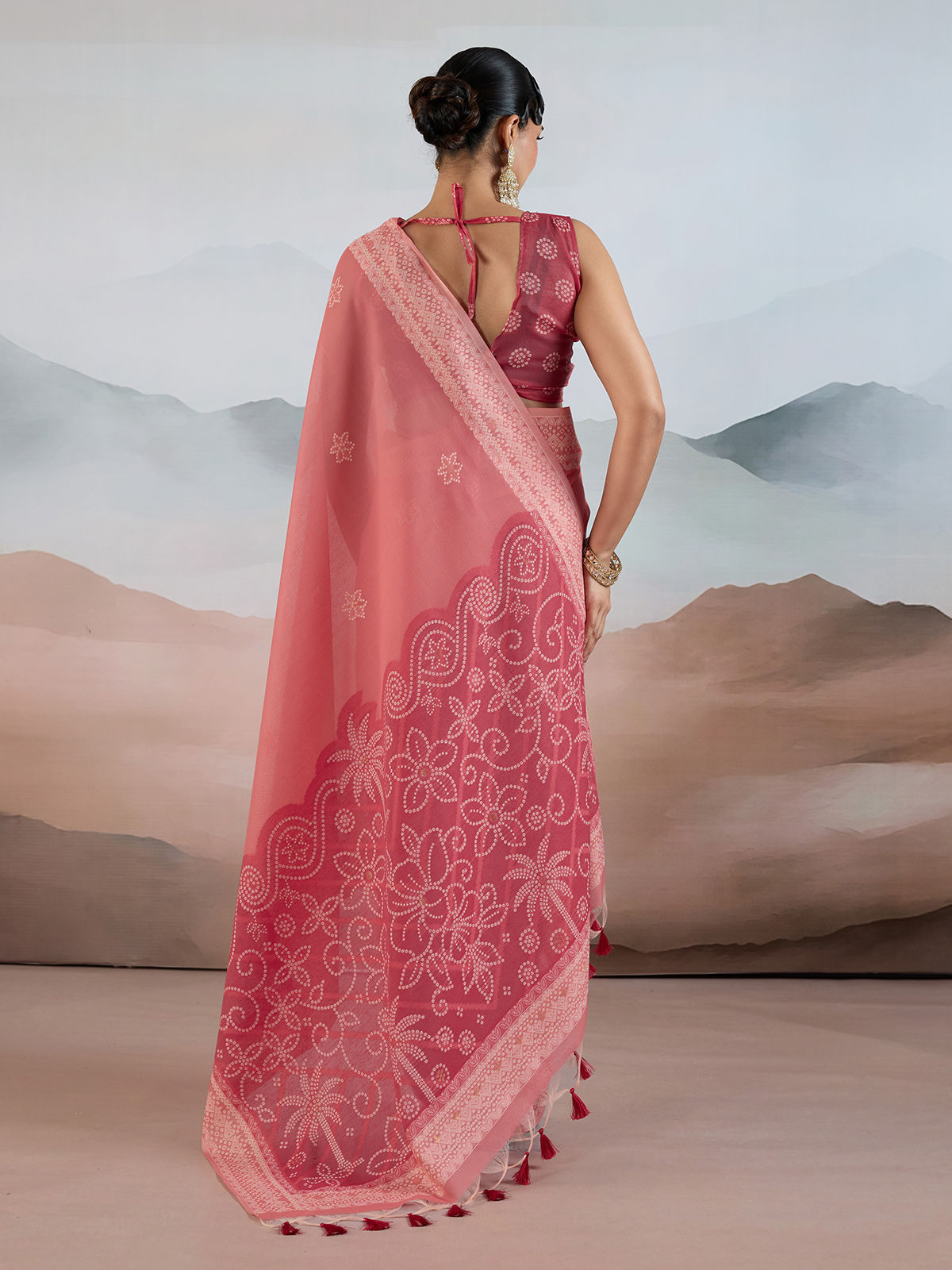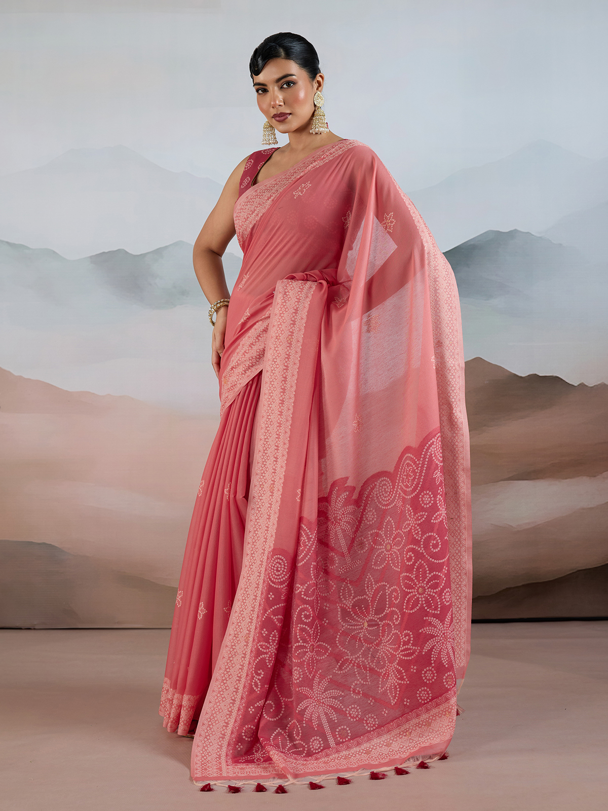 Elevate your ethnic wardrobe with this elegant pink bandhej inspired saree crafted from premium viscose cotton. Lightweight, breathable, and perfect for summer wear, it features delicate tassels for added charm. Ideal for casual outings, festive gatherings, and puja occasions, this saree blends traditional artistry with modern comfort beautifully.
