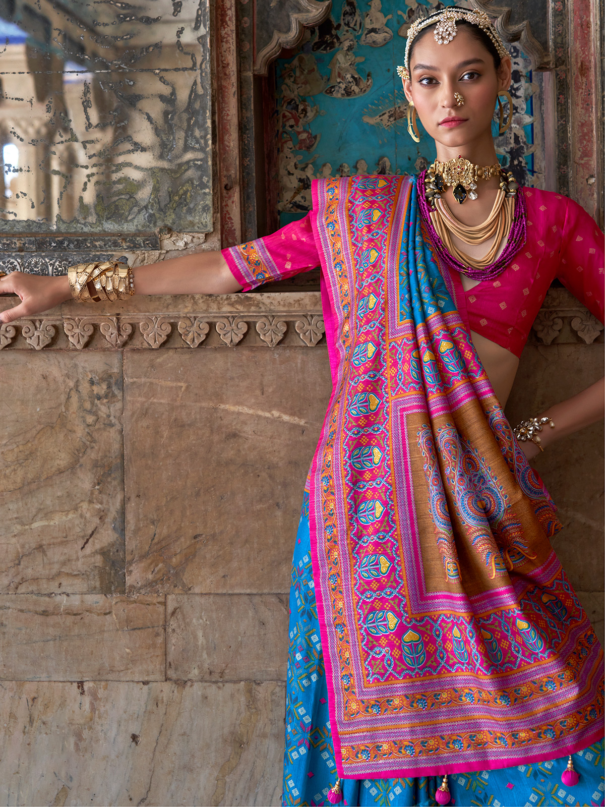 A charming blend of pink and blue, this silk saree boasts a graceful glory finish print that elevates festive dressing. Ideal for weddings, receptions, and sangeet nights, it offers a luxurious drape and stylish presence. Comes with an unstitched blouse for easy custom tailoring.