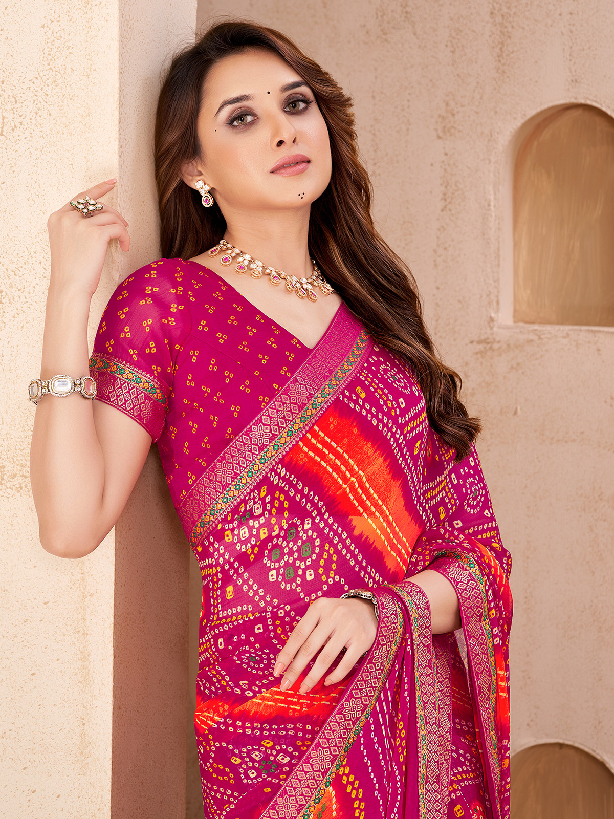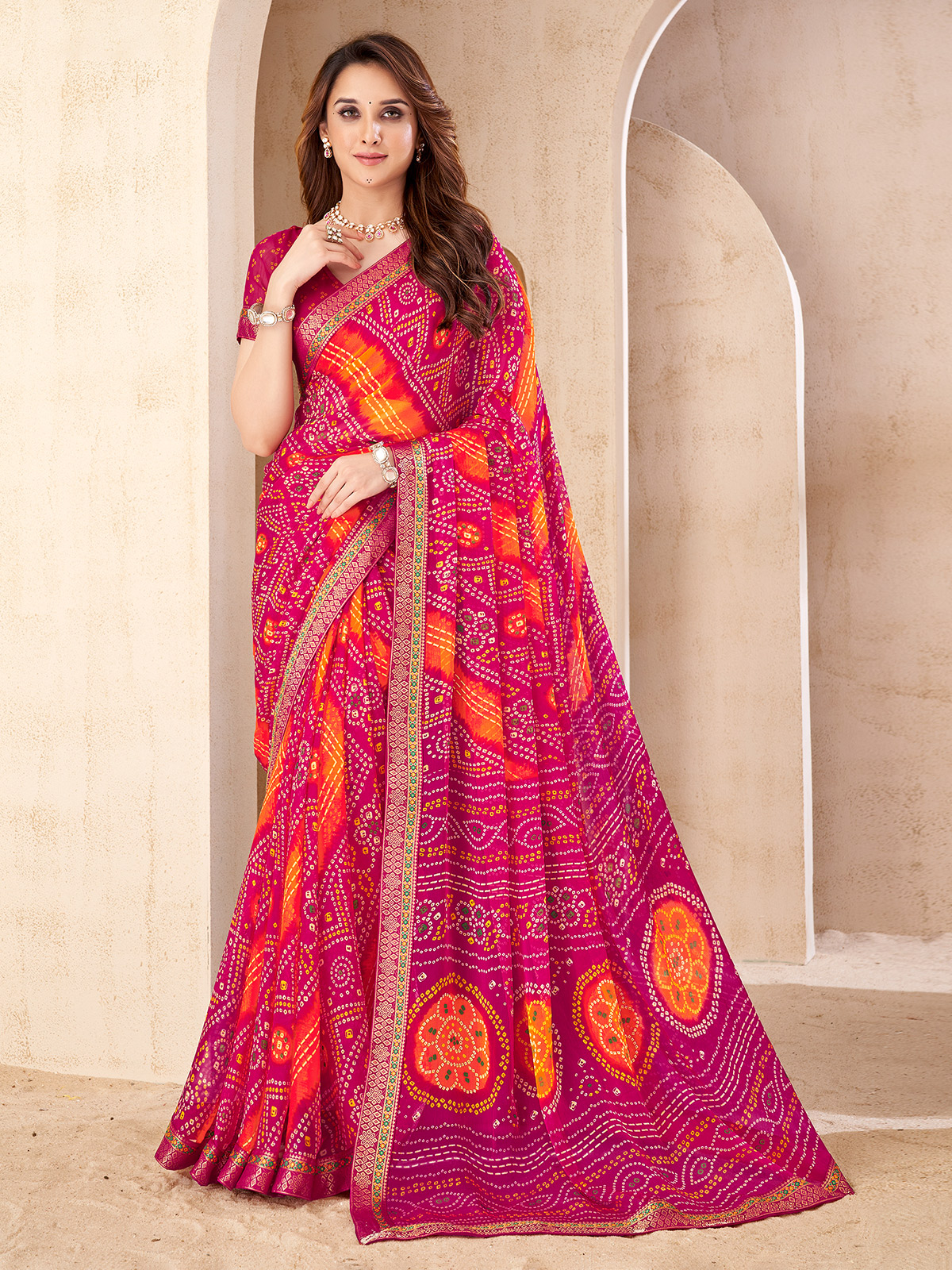 Radiate soft sophistication in this pink chiffon saree, beautifully enriched with an elegant bandhani print for festive appeal. Its airy drape and charming colour make it ideal for celebrations and formal occasions. Includes an unstitched blouse piece to tailor your perfect look.