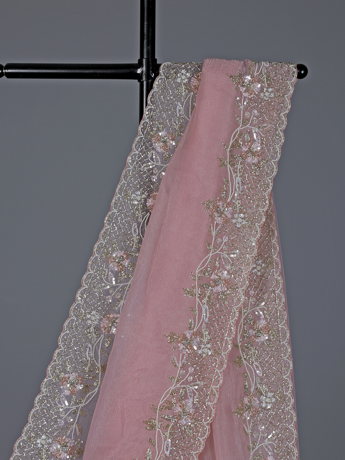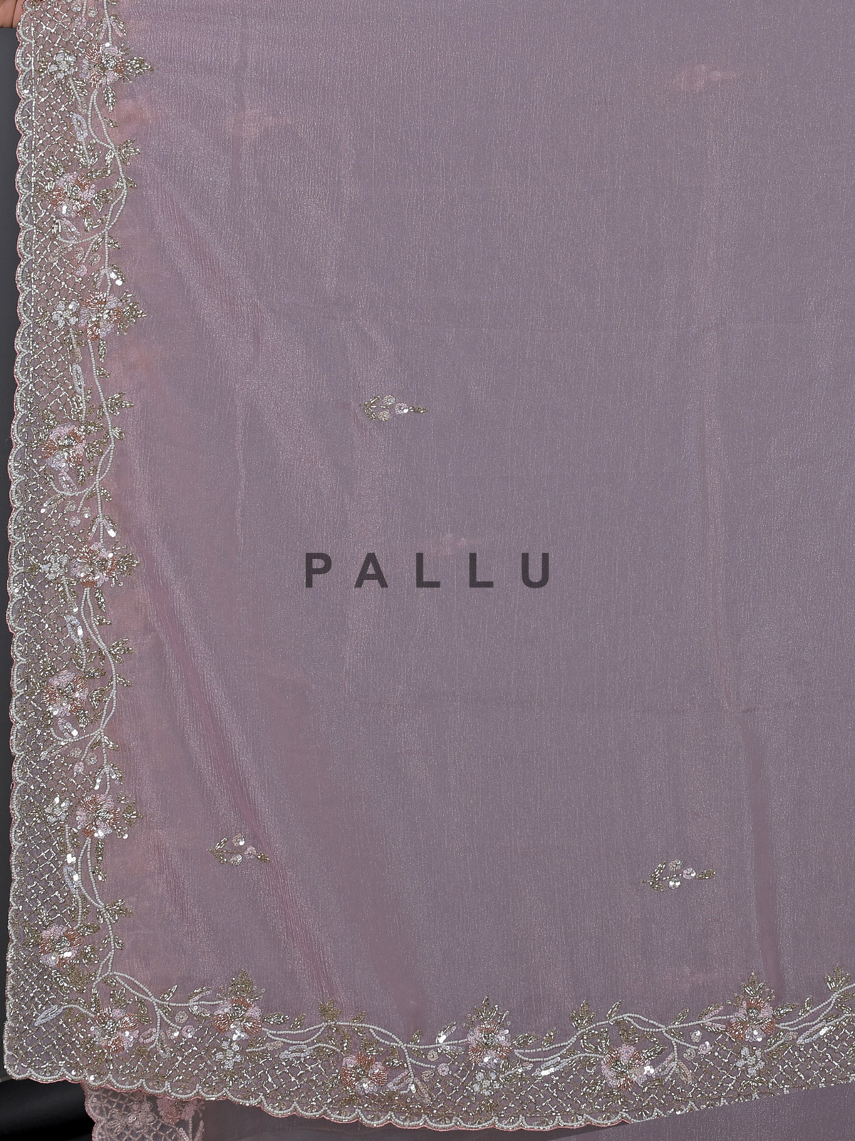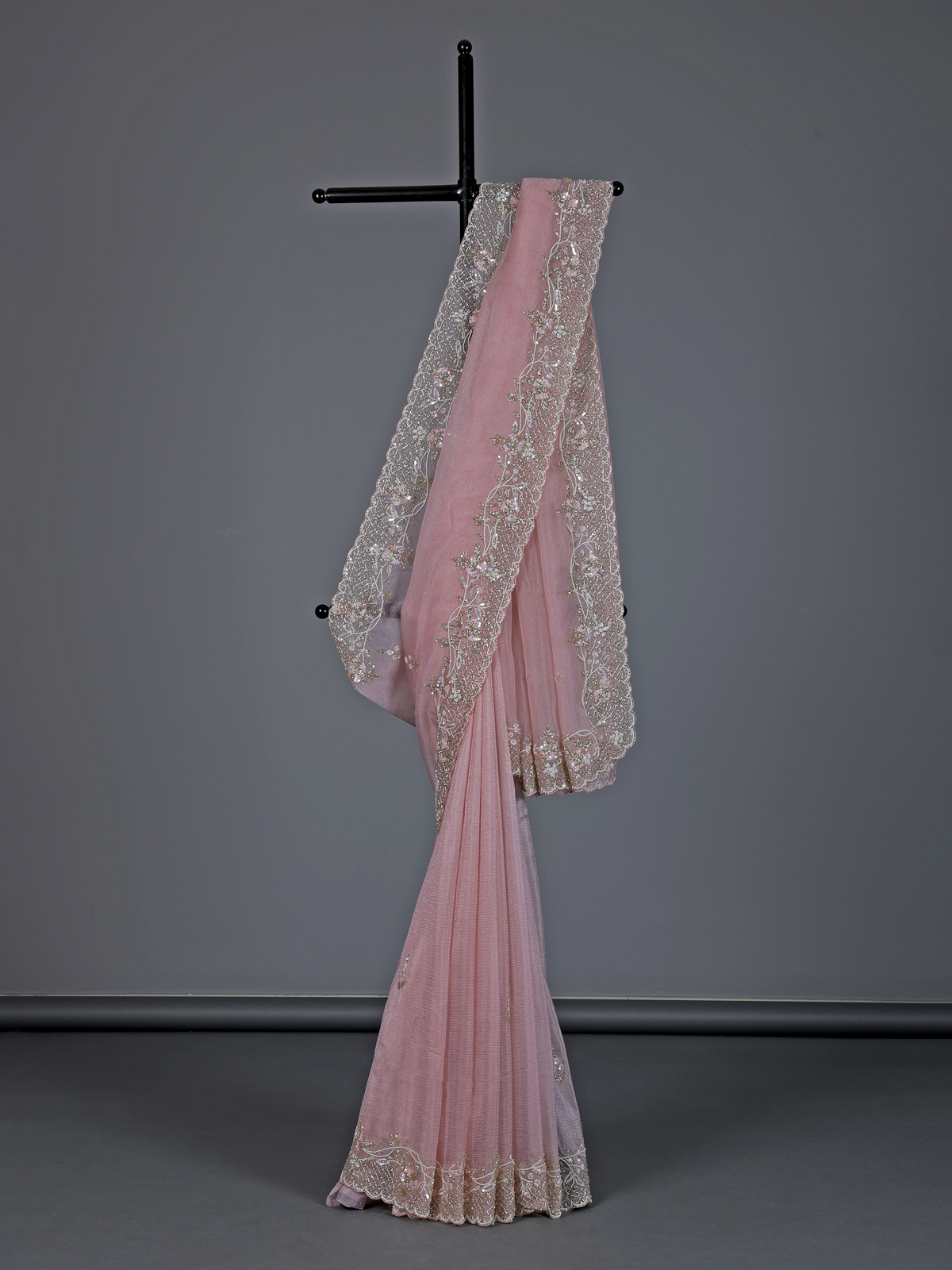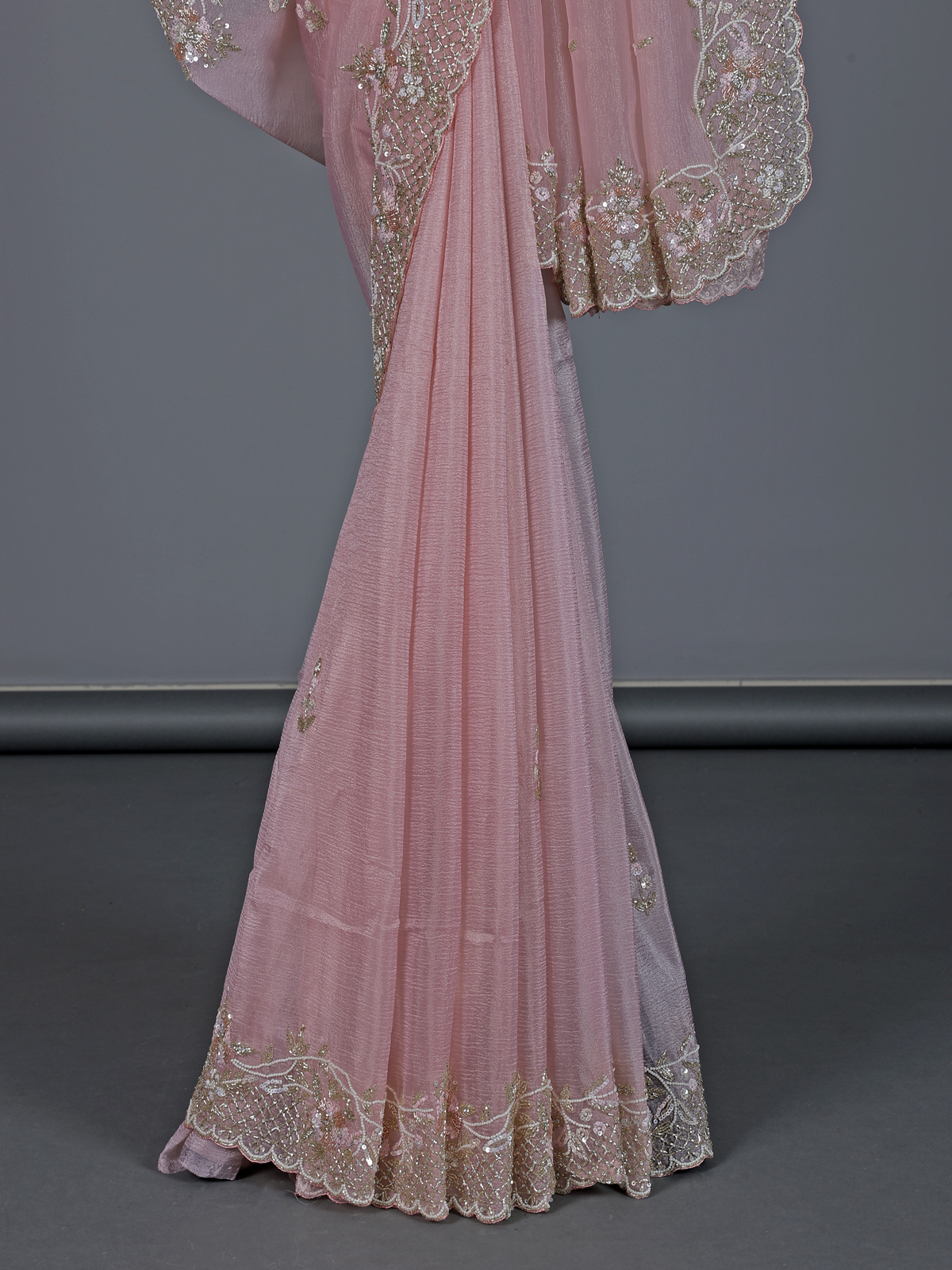 Delicate and stylish pink chiffon saree brings a graceful festive vibe. Highlighted with cutdana, beads, sequins and diamond work, it adds a soft sparkle. The smooth drape flatters every look beautifully. Paired with an unstitched blouse piece, it creates a charming outfit for receptions and festive gatherings.