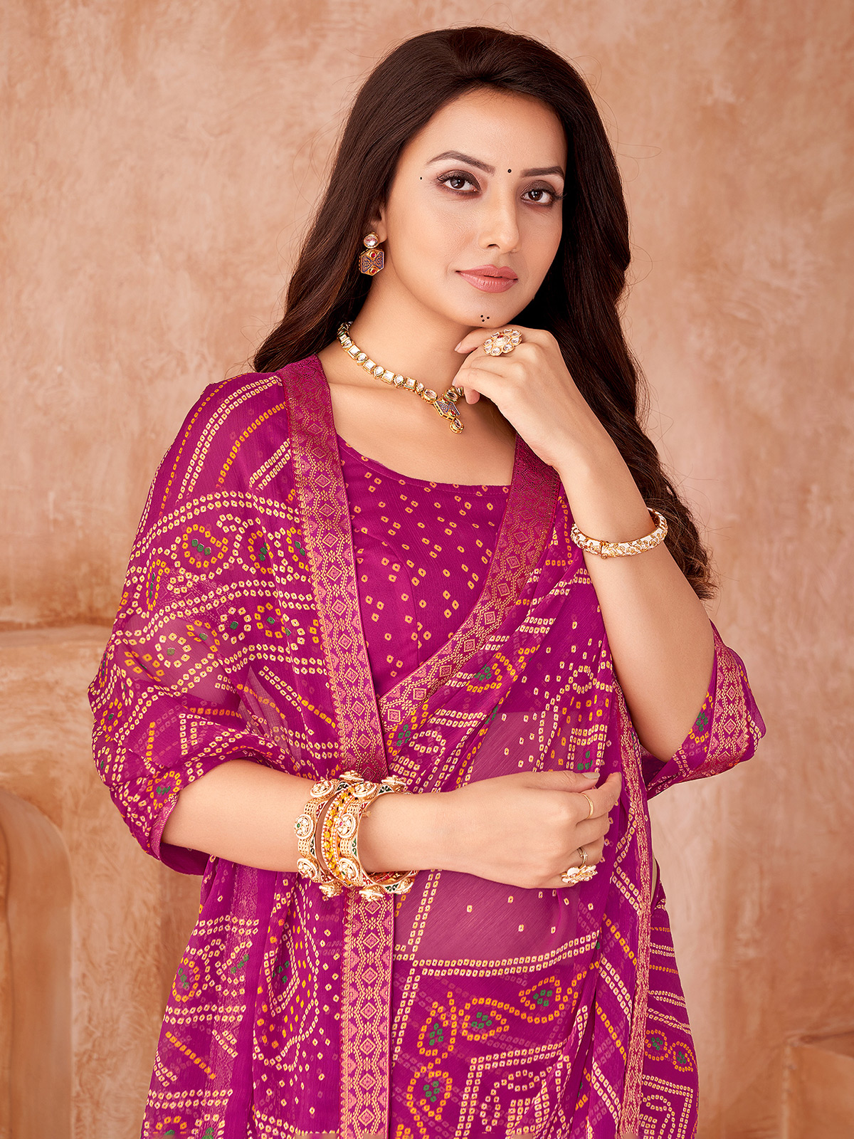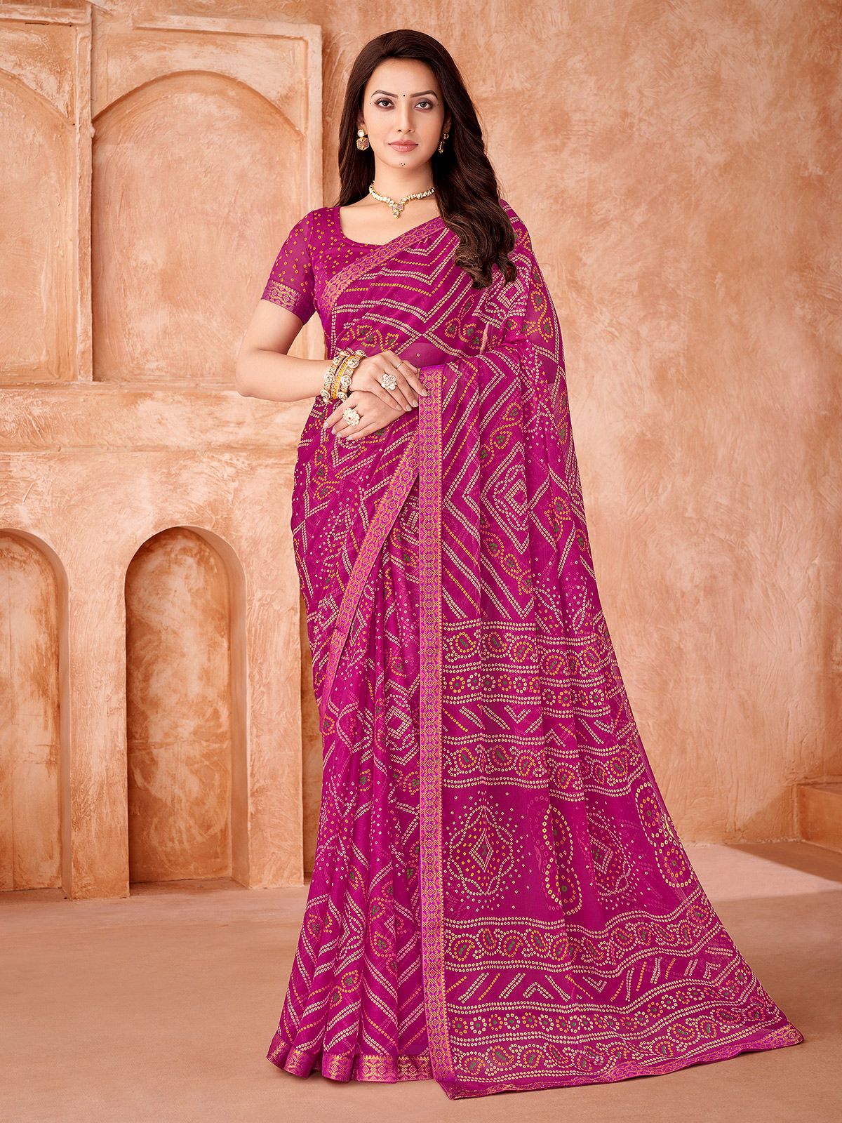 Bold and festive, this pink chiffon saree stands out with its vibrant bandhani print. A striking fusion of color and craftsmanship, perfect for weddings and joyous occasions. Includes an unstitched blouse piece.