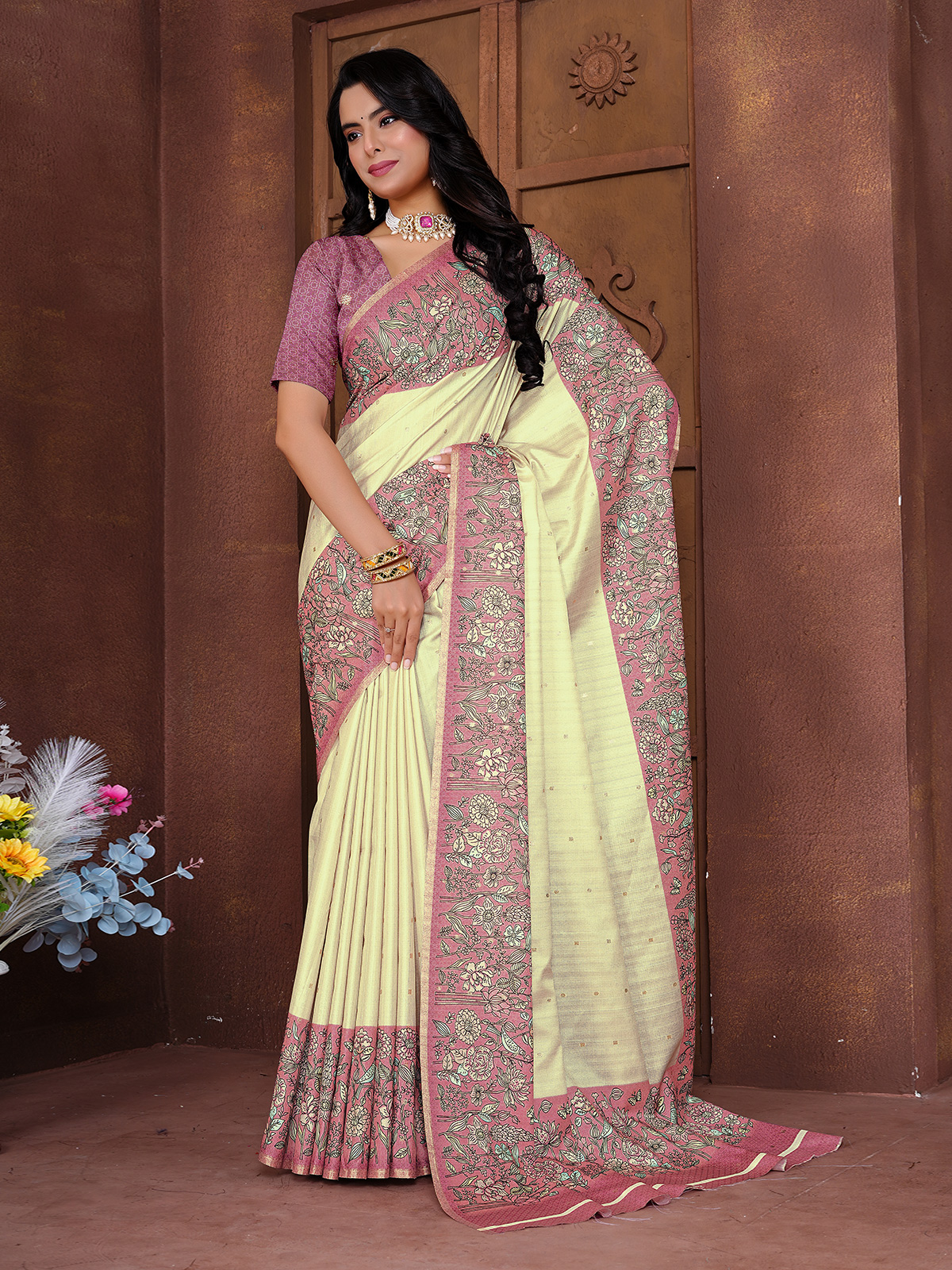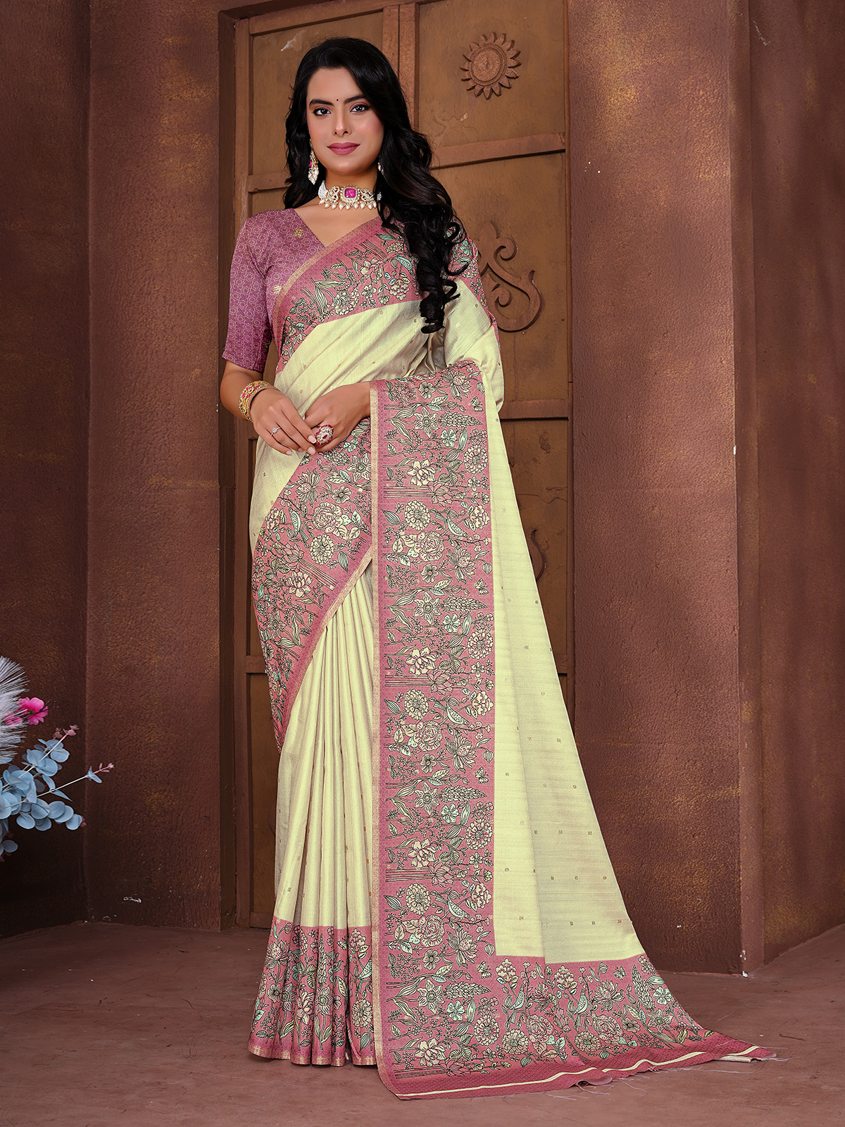 Rendered in charming pink and cream tones, this soft silk saree features refined zari work paired with floral printed accents on a contrast border. Teamed with an unstitched blouse piece, it offers a feminine drape and timeless appeal for festive and casual ethnic wear.