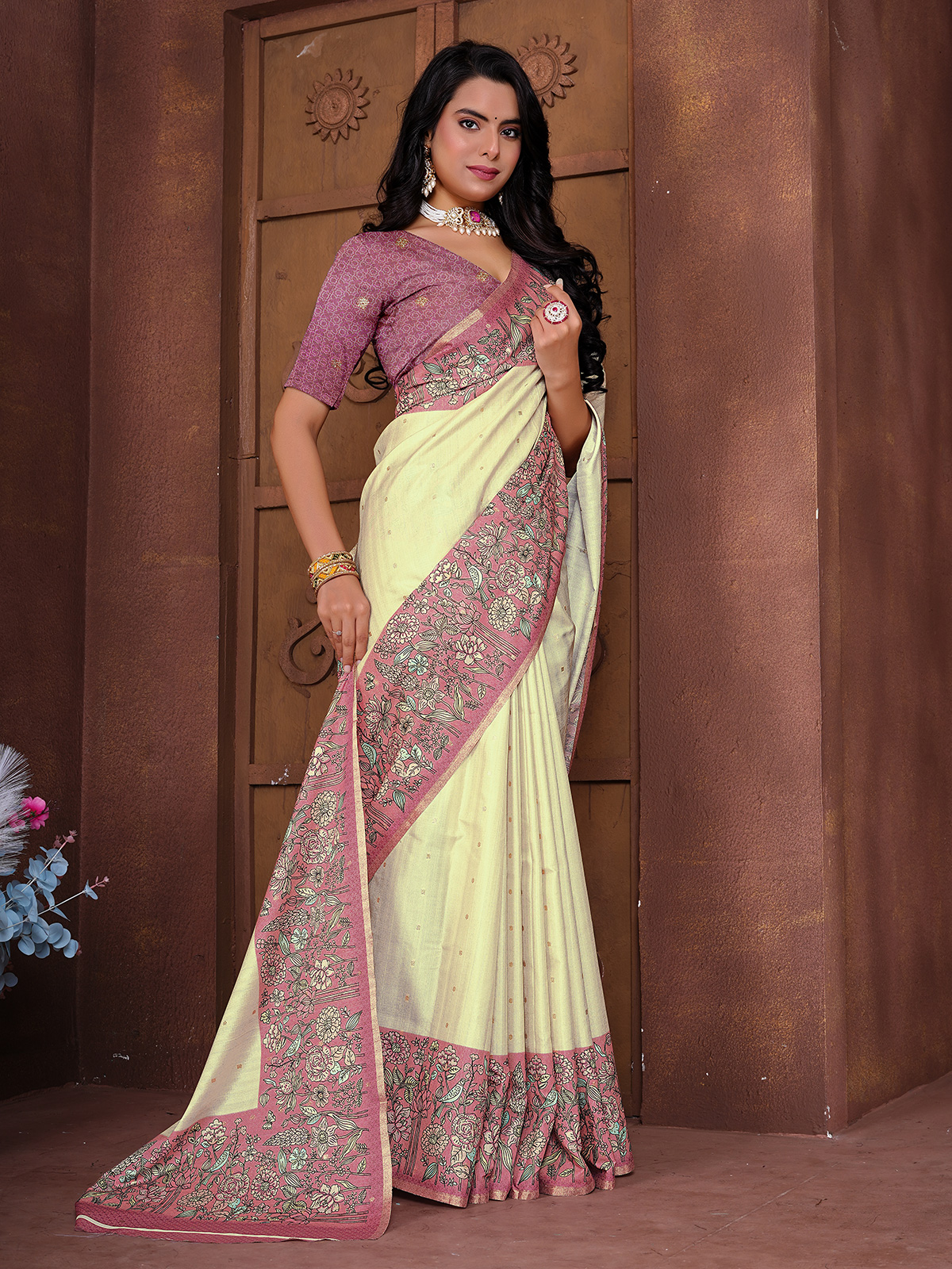 Pink Cream Soft Silk Floral Printed Zari Saree