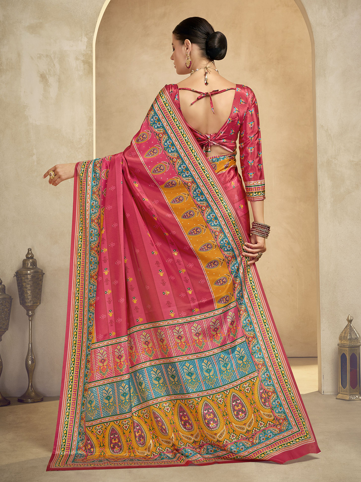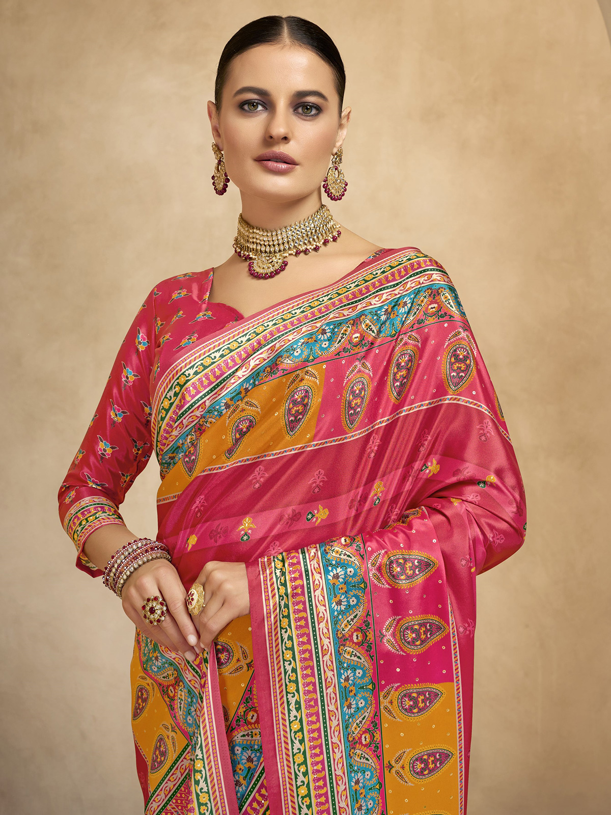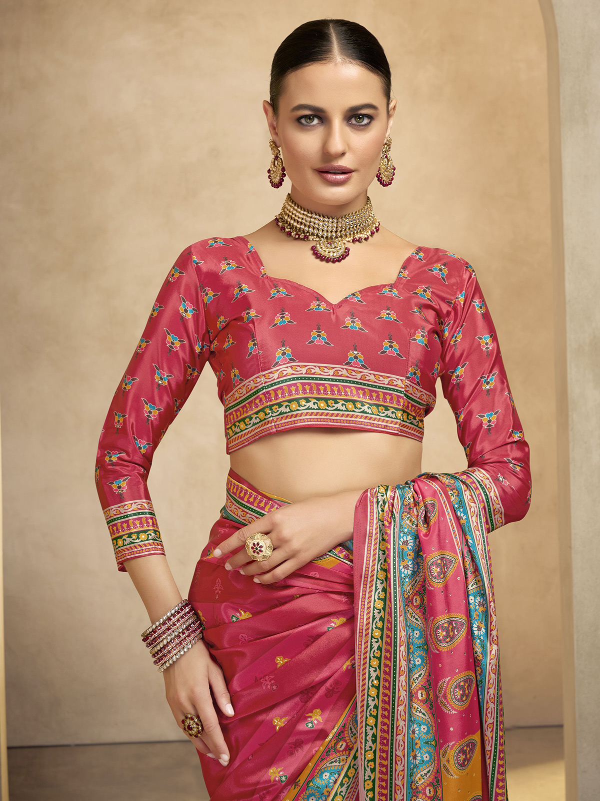 This soft pink crepe silk saree is styled with refined digital prints that lend a fresh festive charm. Smooth to drape and lightweight in feel, it is paired with an unstitched blouse piece, making it suitable for casual celebrations, daytime functions and relaxed traditional wear.