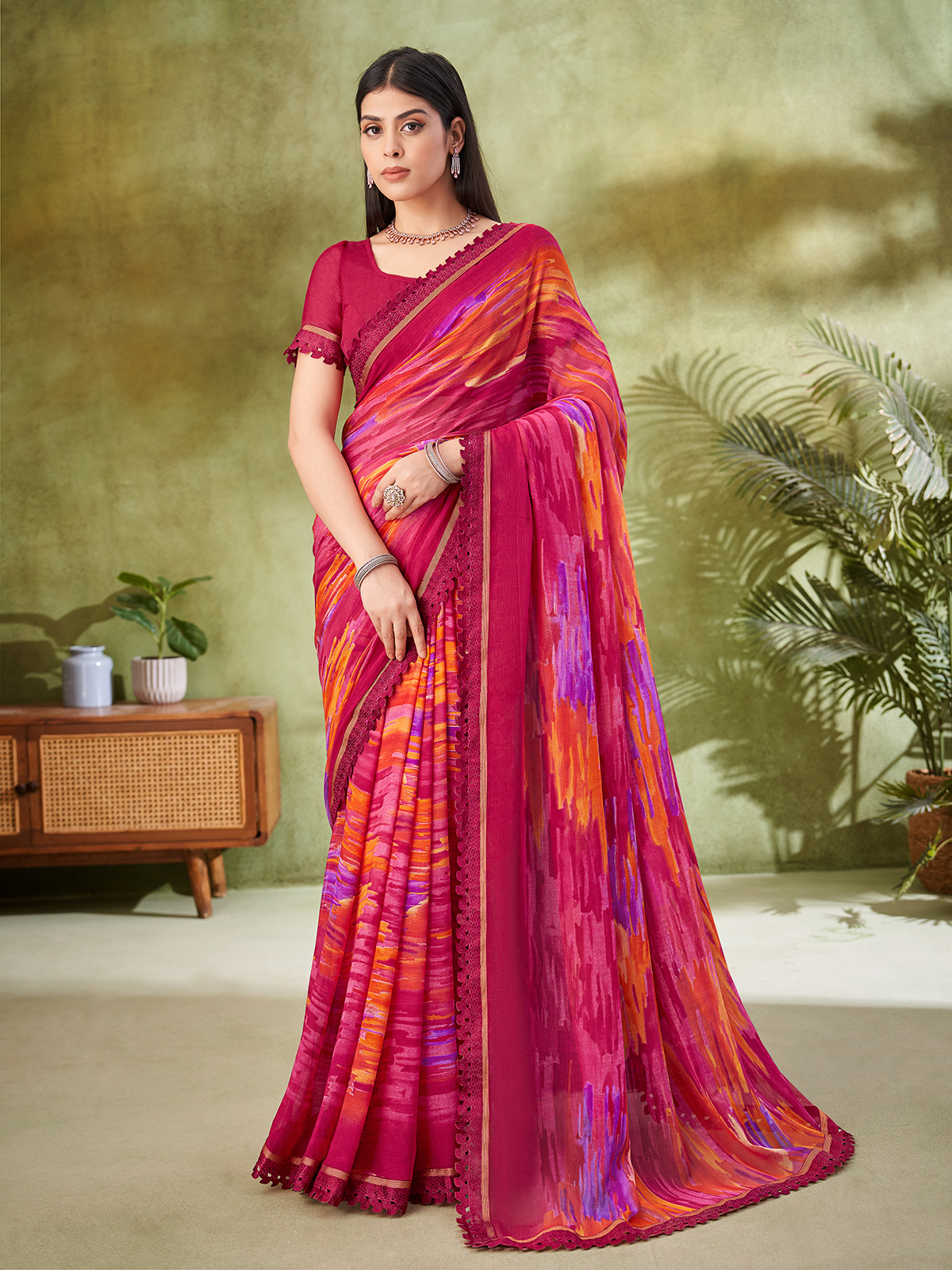 Designed with refined geometric prints and a minimal lace border, this pink georgette saree offers everyday elegance. Its airy drape ensures comfort, while the unstitched blouse makes it suitable for casual wear, puja, and festive occasions.