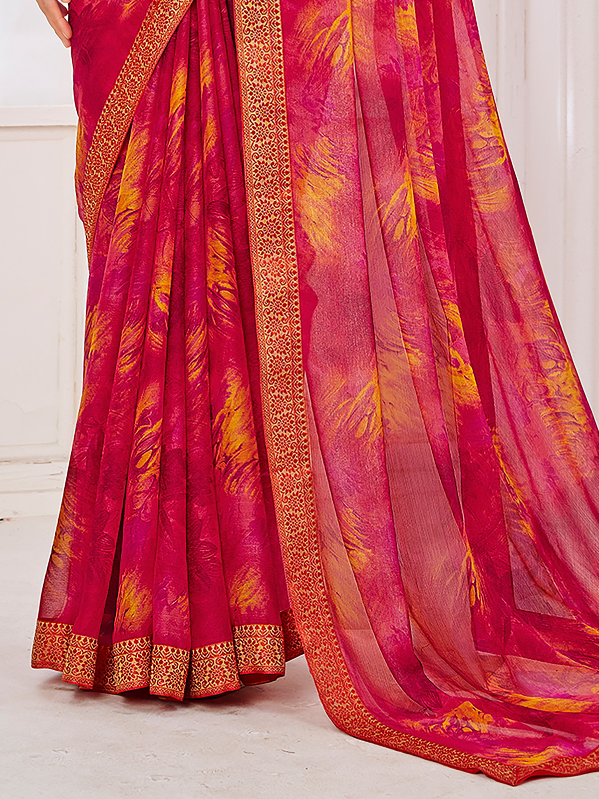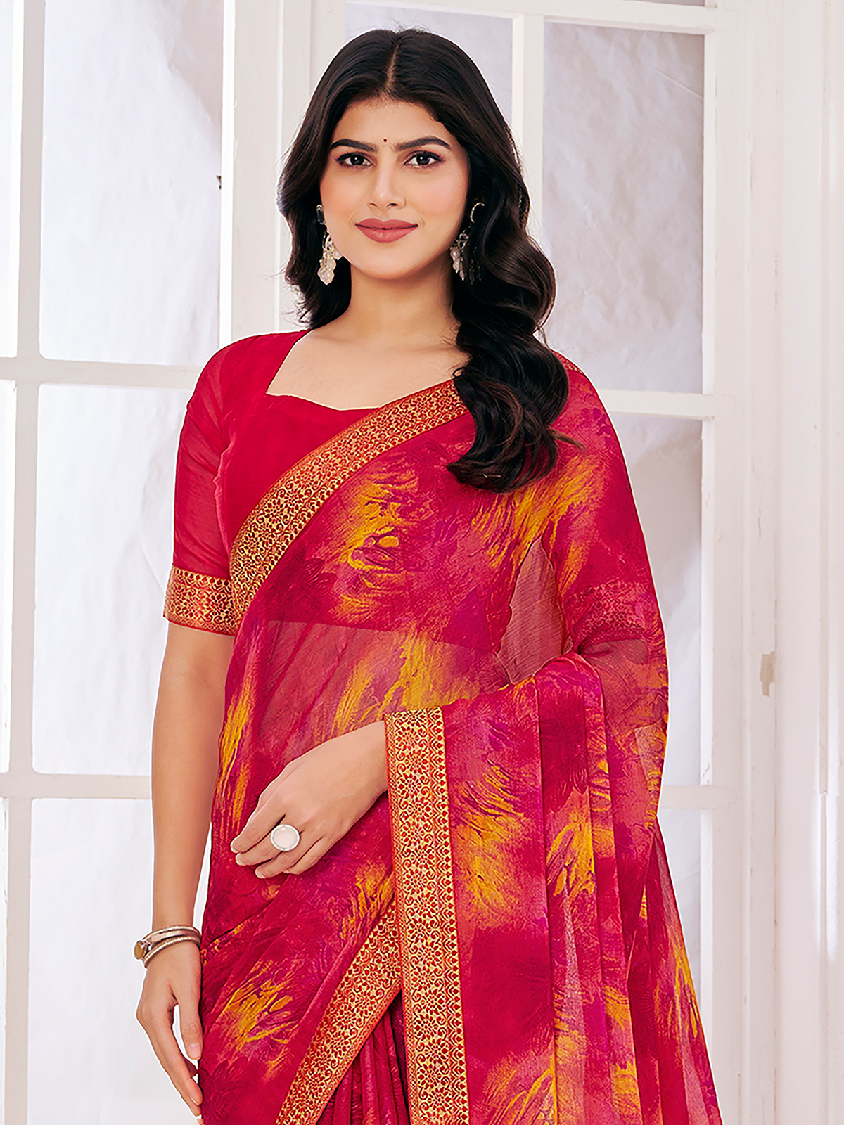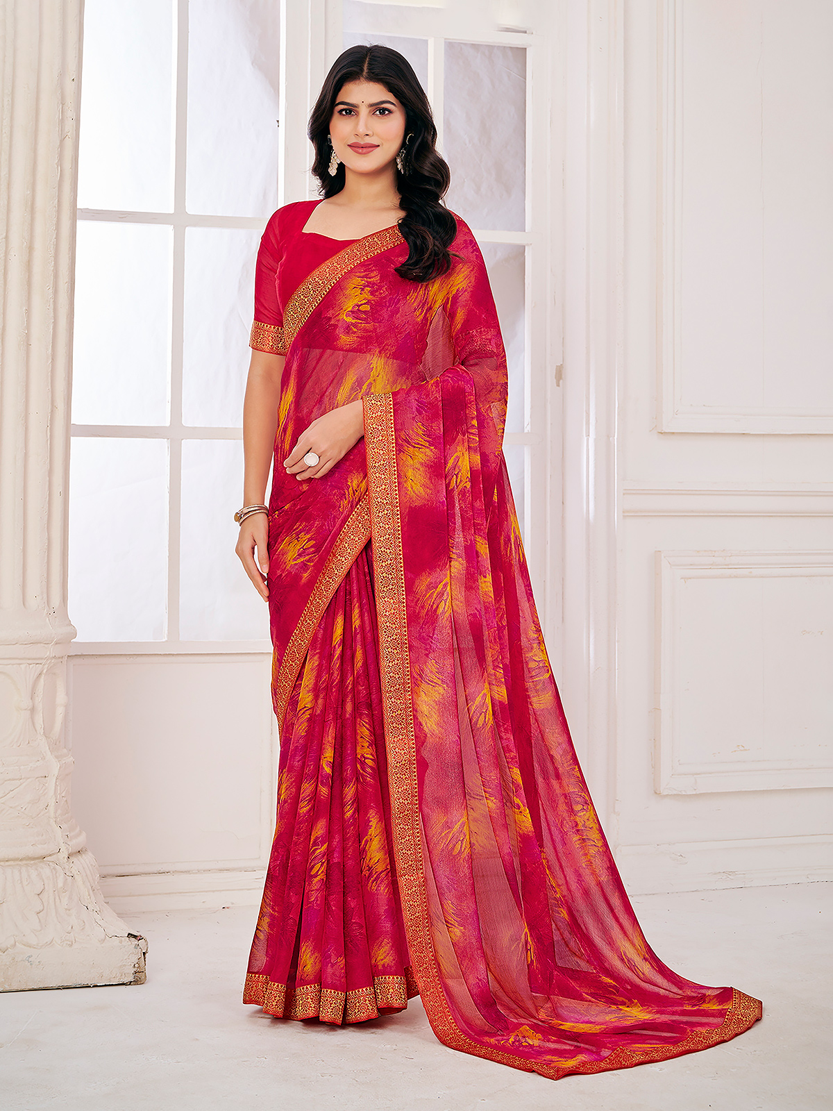 Charming pink georgette saree detailed with elegant zari accents and graceful prints. Its breezy texture provides comfort with refined appeal. Includes an unstitched blouse, making it perfect for casual wear and festive gatherings.