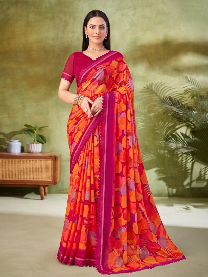 This pink georgette saree features neat geometric prints enhanced with a simple lace border for subtle elegance. Lightweight and easy to drape, it comes with an unstitched blouse, making it ideal for casual wear, puja rituals, and festive occasions.