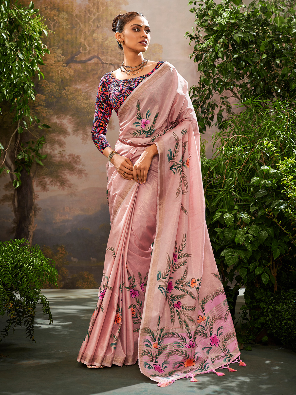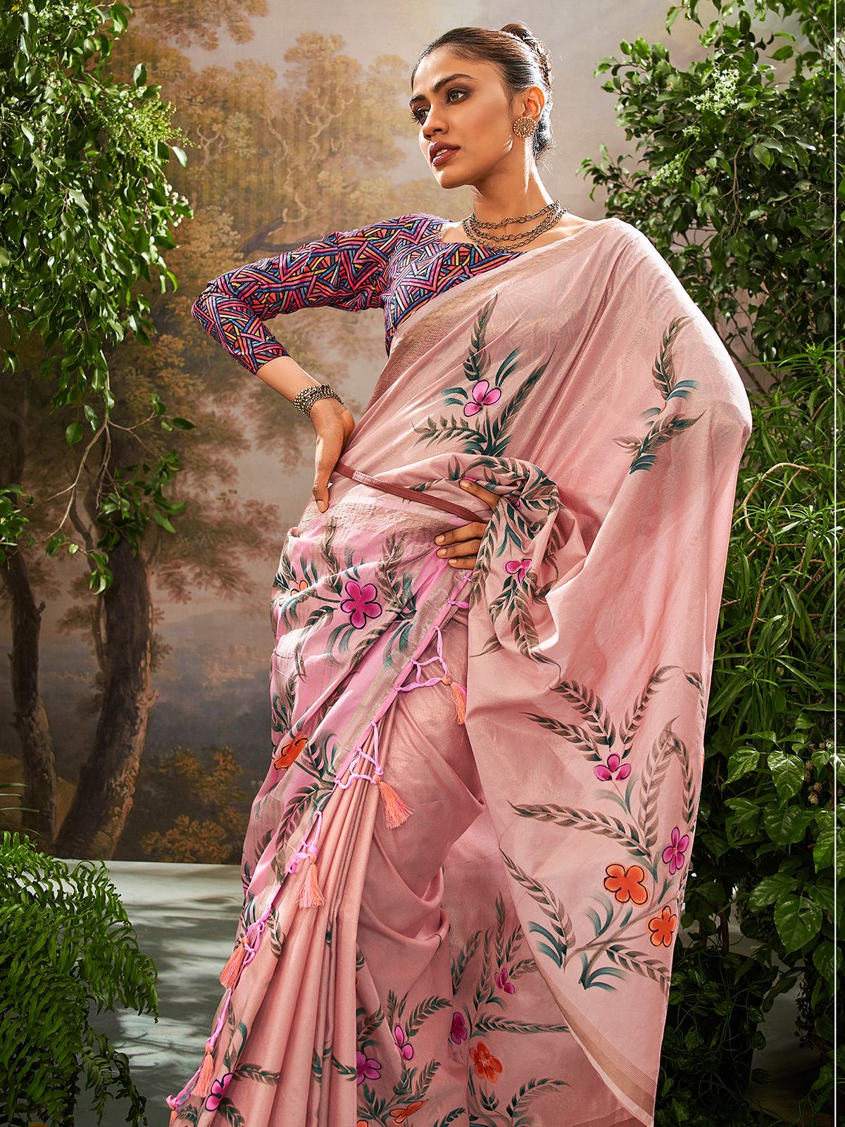 Crafted from trendy linen fabric, this pink saree delivers a lightweight yet festive vibe perfect for celebrations. Adorned with a beautiful floral print and shimmering zari weaving, it radiates elegance. Includes an unstitched blouse piece.