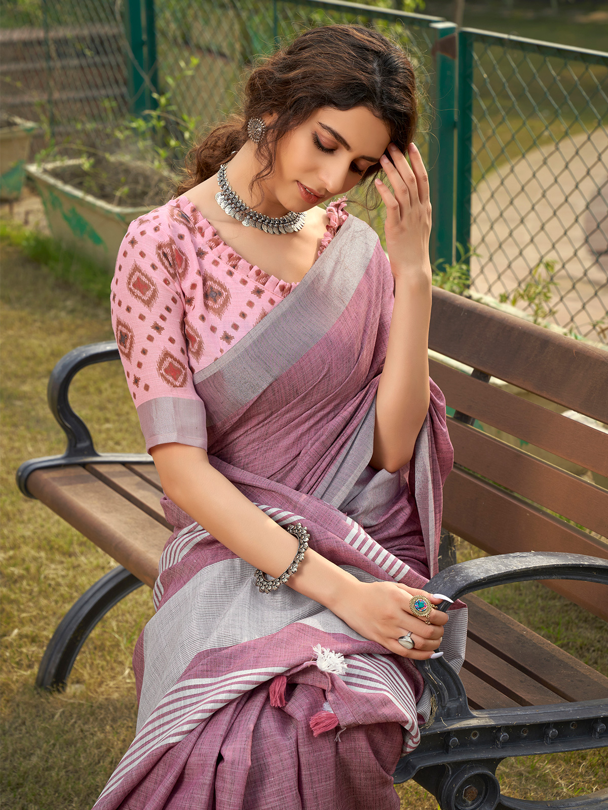 The ultimate statement pink saree for your trendy look. Crafted from soft linen silk fabric with a stunning khadi print, this saree brings the perfect blend of comfort and style to your wardrobe. Comes with a blouse piece.