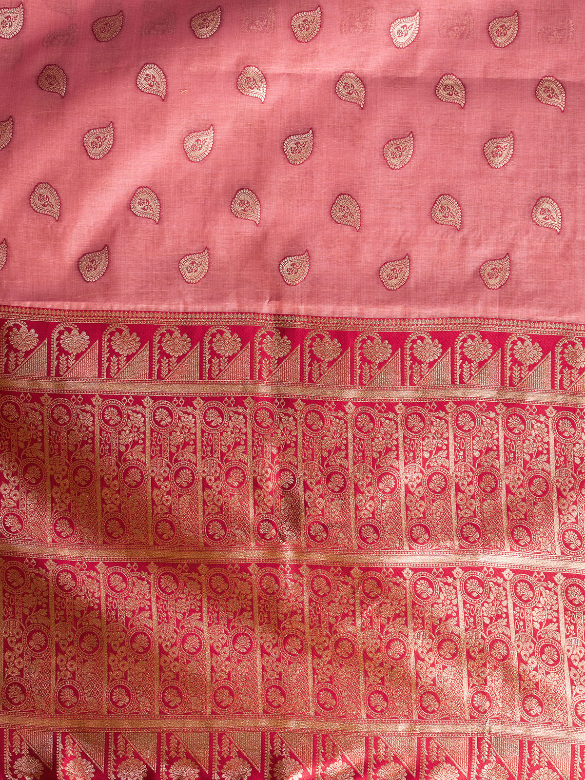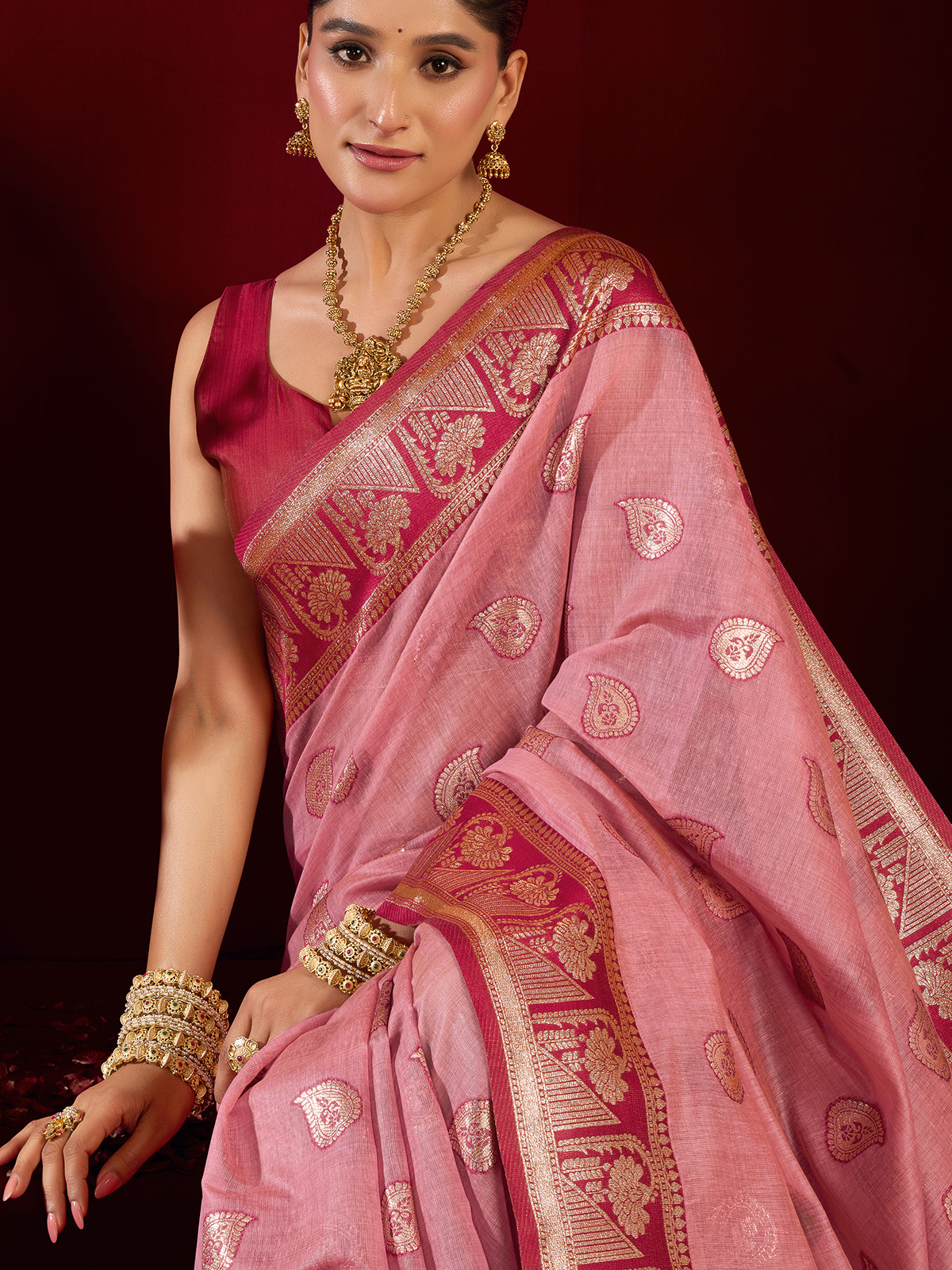 Step into elegance with this pink modal silk banarasi saree woven with delicate zari accents. The airy drape and unstitched blouse offer both comfort and customization, making it ideal for weddings, receptions, and festive occasions filled with grace and tradition.