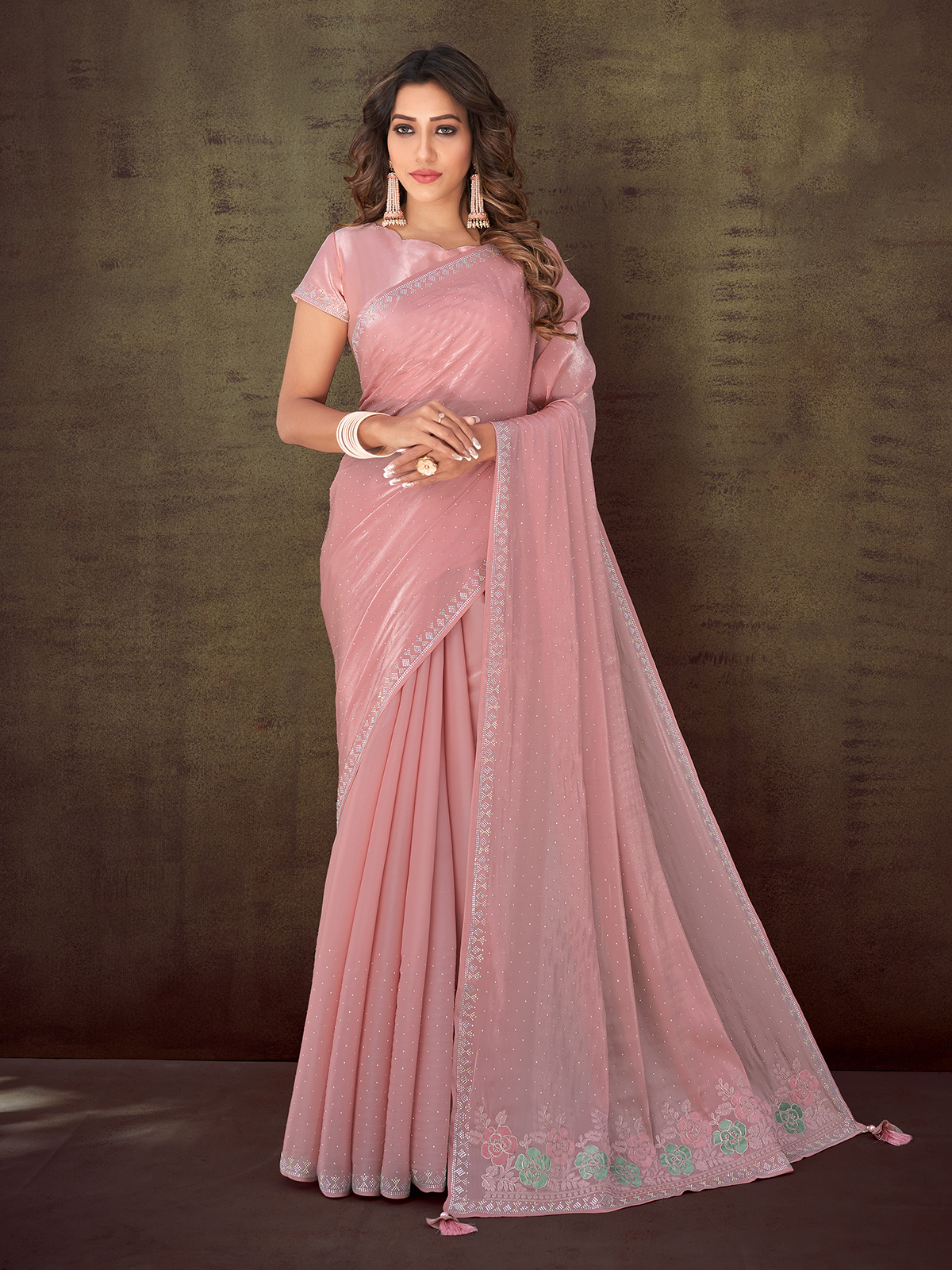 Pink Organza Silk Georgette Embroidered Designer Saree