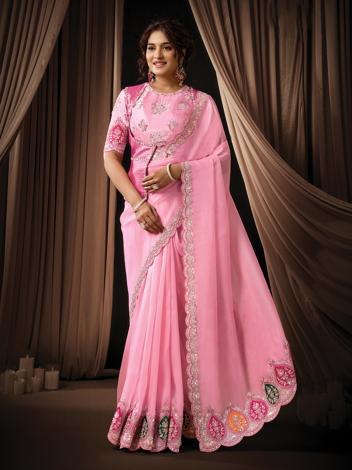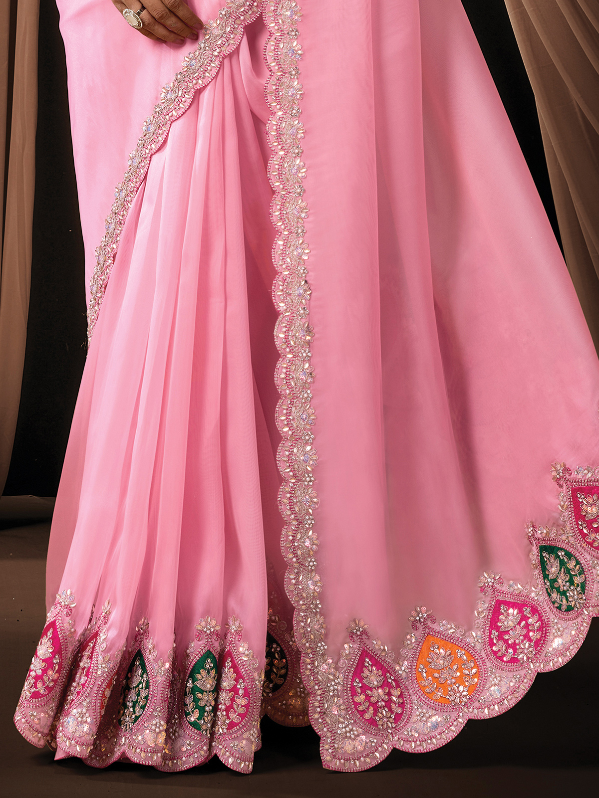 Enhancing delicate feminine charm, this pink organza tissue saree flows with graceful appeal. Adorned with resham, sequins, pearls, and diamond work, it creates a luminous festive look. Perfect for festivals, receptions, and weddings, it is paired with an unstitched embroidered blouse.
