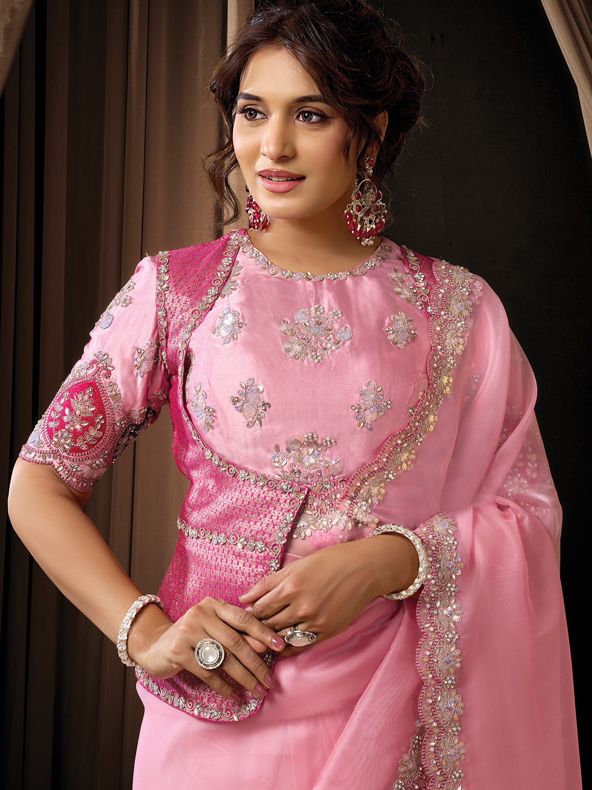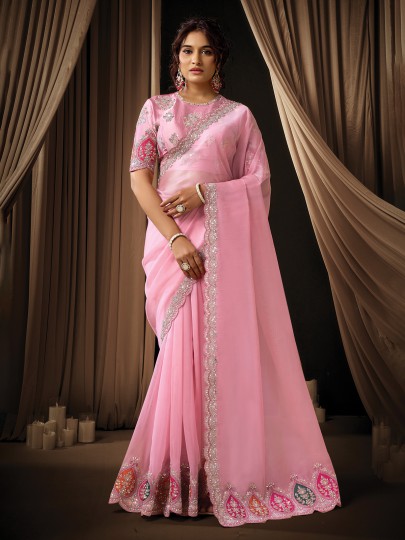 Pink Organza Tissue Saree Designed For Wedding Celebrations