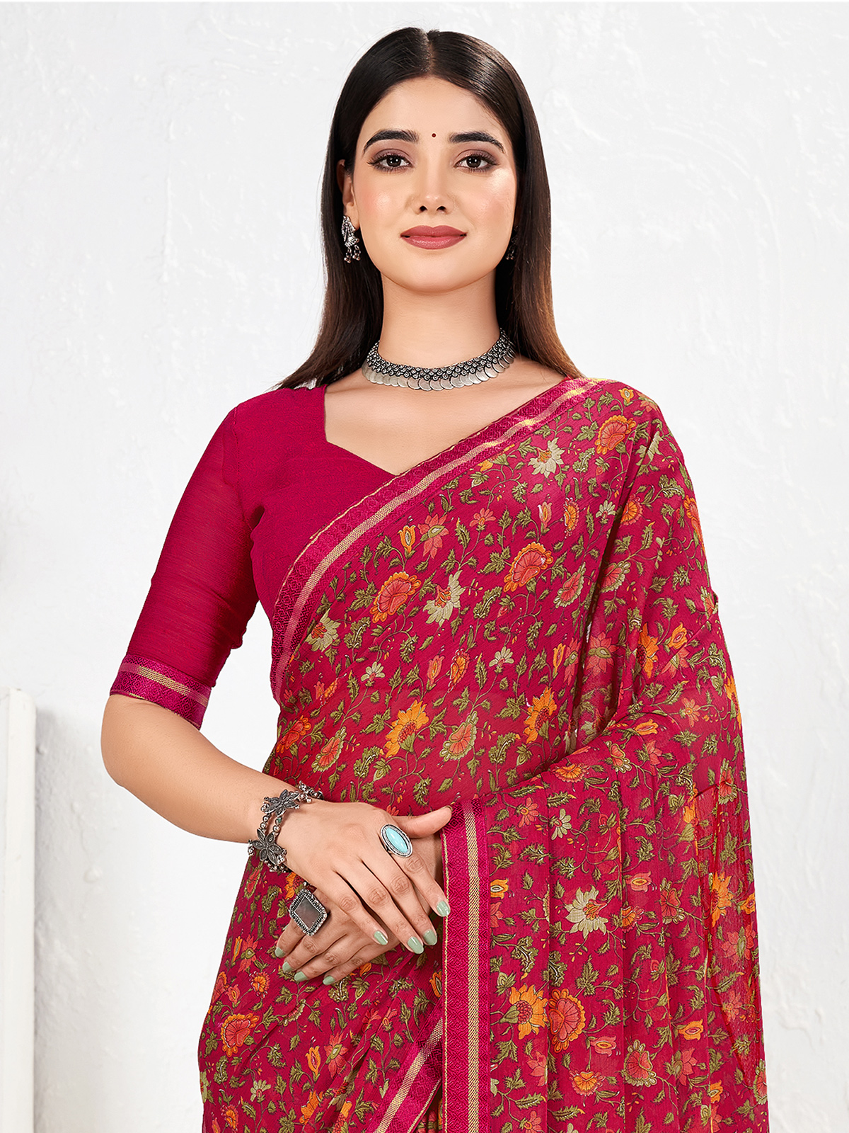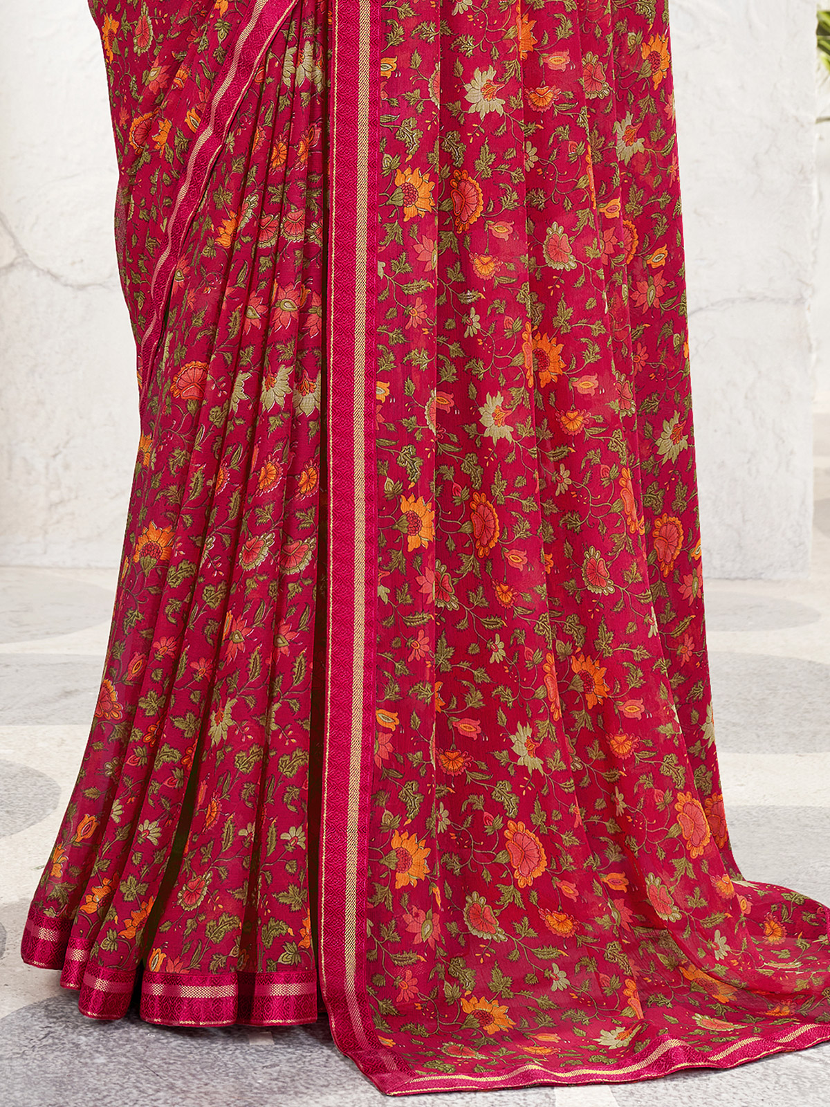 Charming and elegant, this pink georgette saree features fine zari work paired with graceful prints. The flowy fabric adds comfort and style. Paired with an unstitched blouse, it works well for festive celebrations and casual wear.