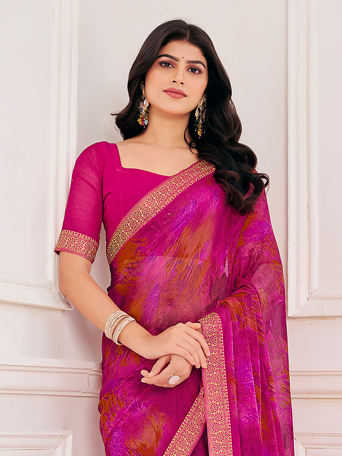 Feminine and graceful, this pink georgette saree is enhanced with delicate zari work and attractive prints. Lightweight and comfortable, it offers an elegant festive appeal. Comes with an unstitched blouse for versatile casual and festive styling.