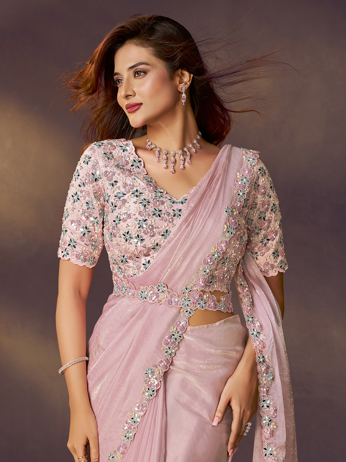Crafted in two tone satin silk, this pink saree blooms with embroidery, sequins, pearls, and diamond artistry. The chic waist belt defines a modern silhouette, making it an enchanting pick for festive soirées and wedding celebrations.