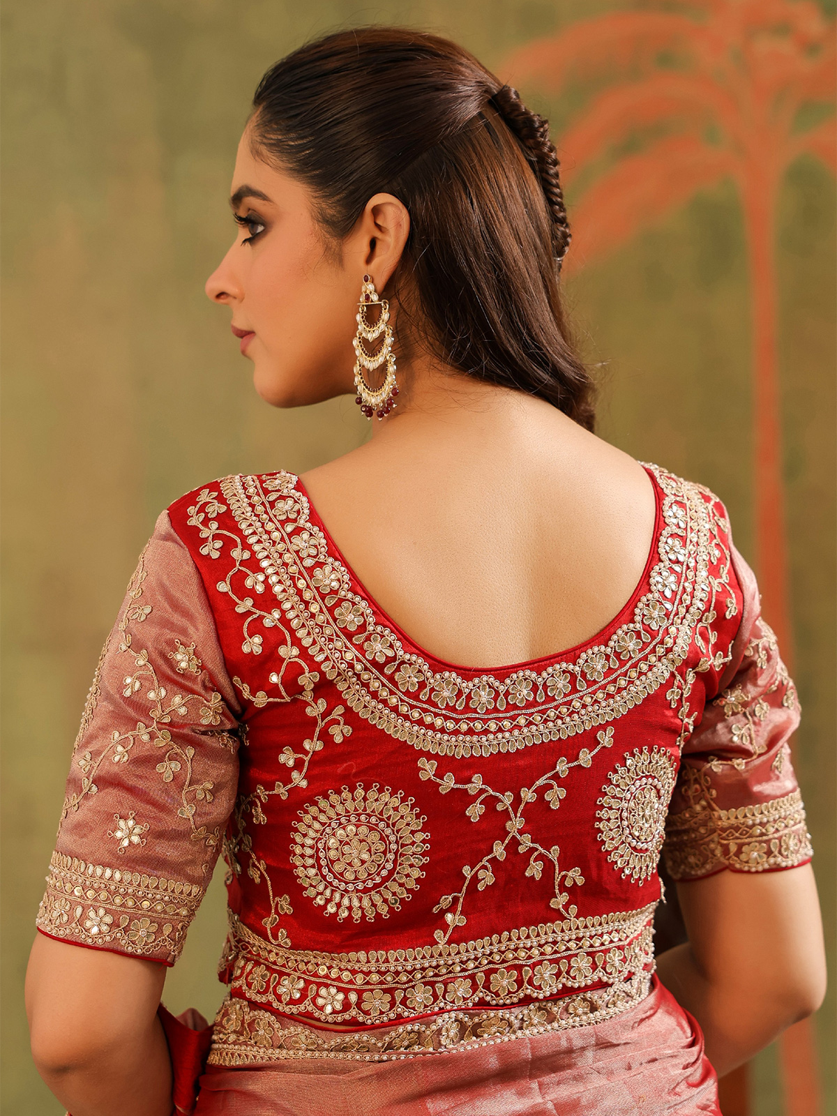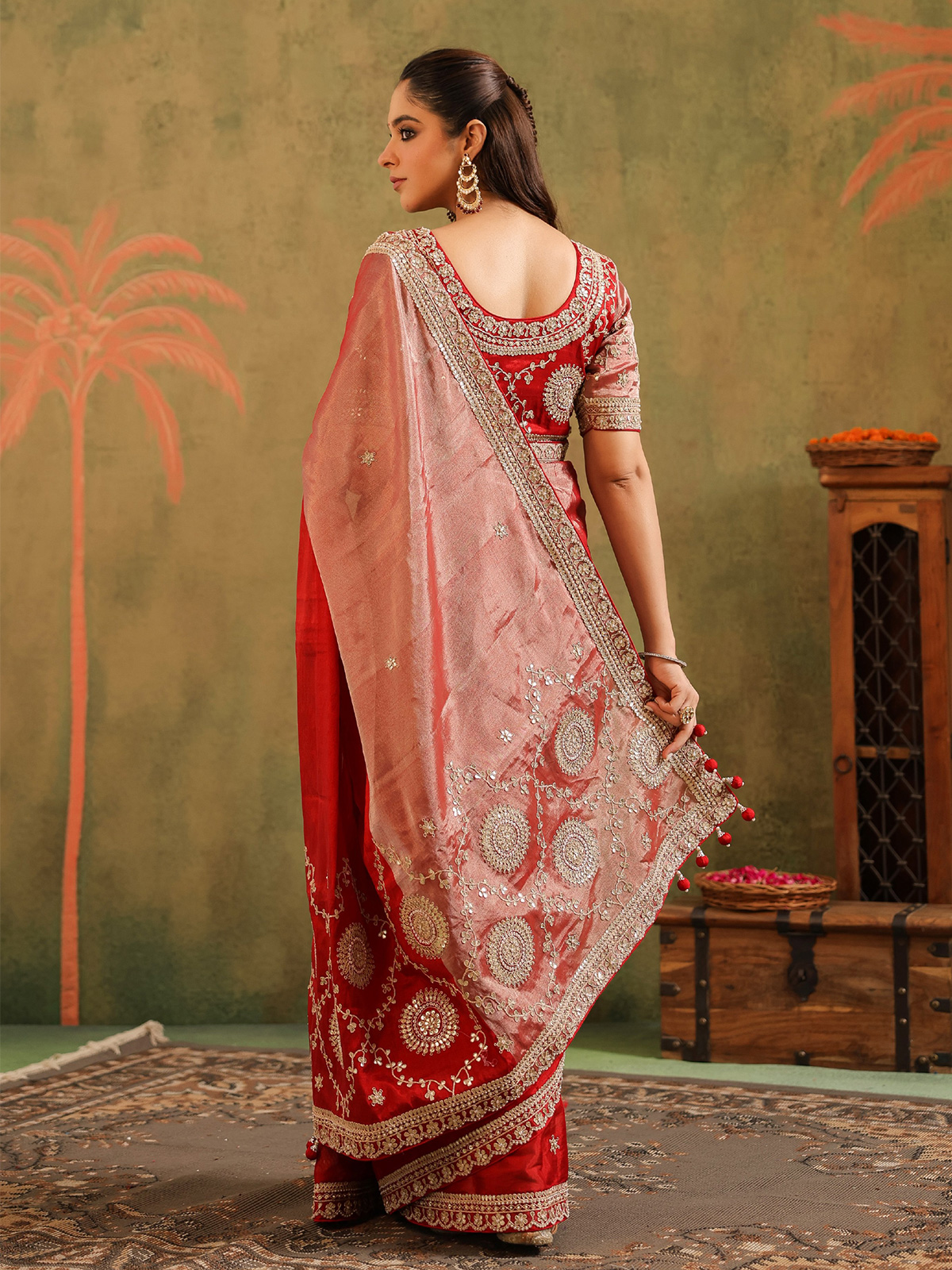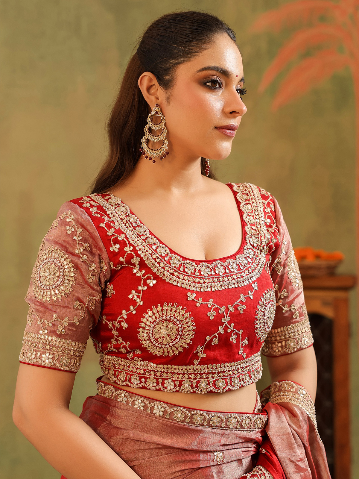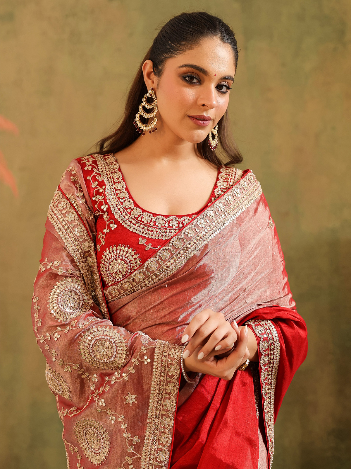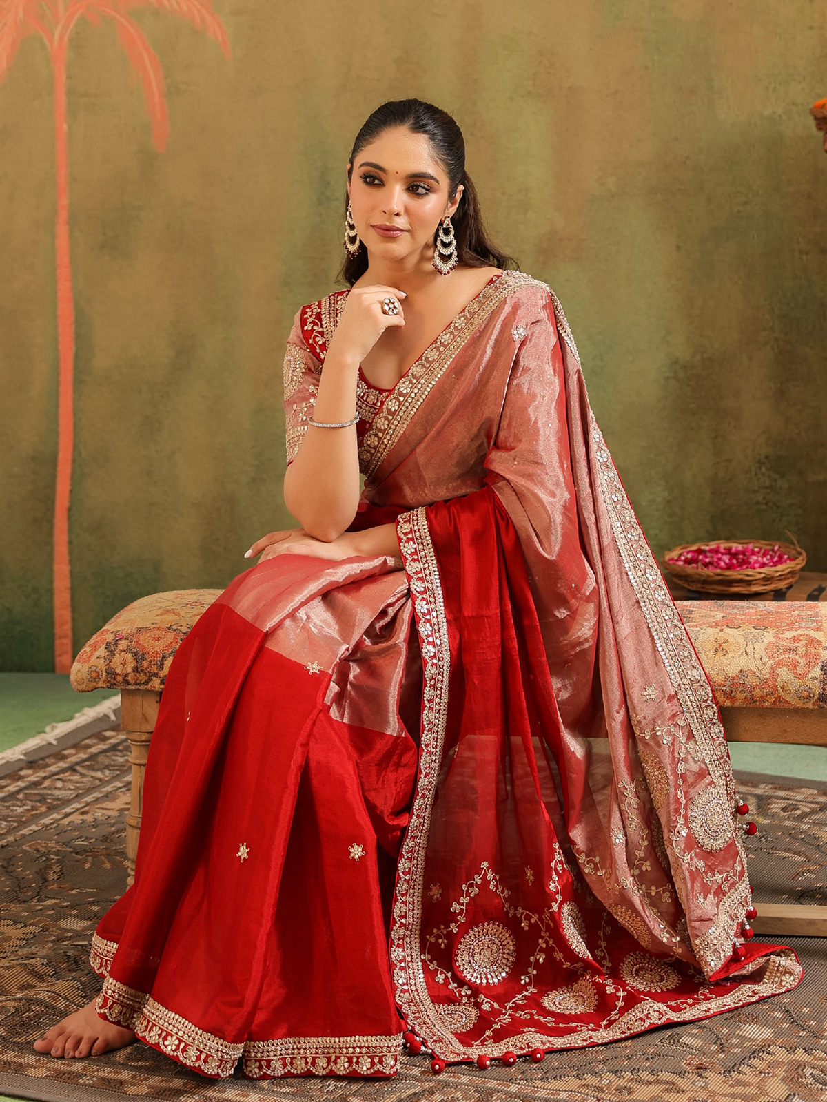 Add royal flair with this pink and red tissue silk saree paired with unstitched blouse. Embellished with gota, sequins, beads, zardosi, and zari, this set is perfect for weddings, receptions, and festive celebrations.