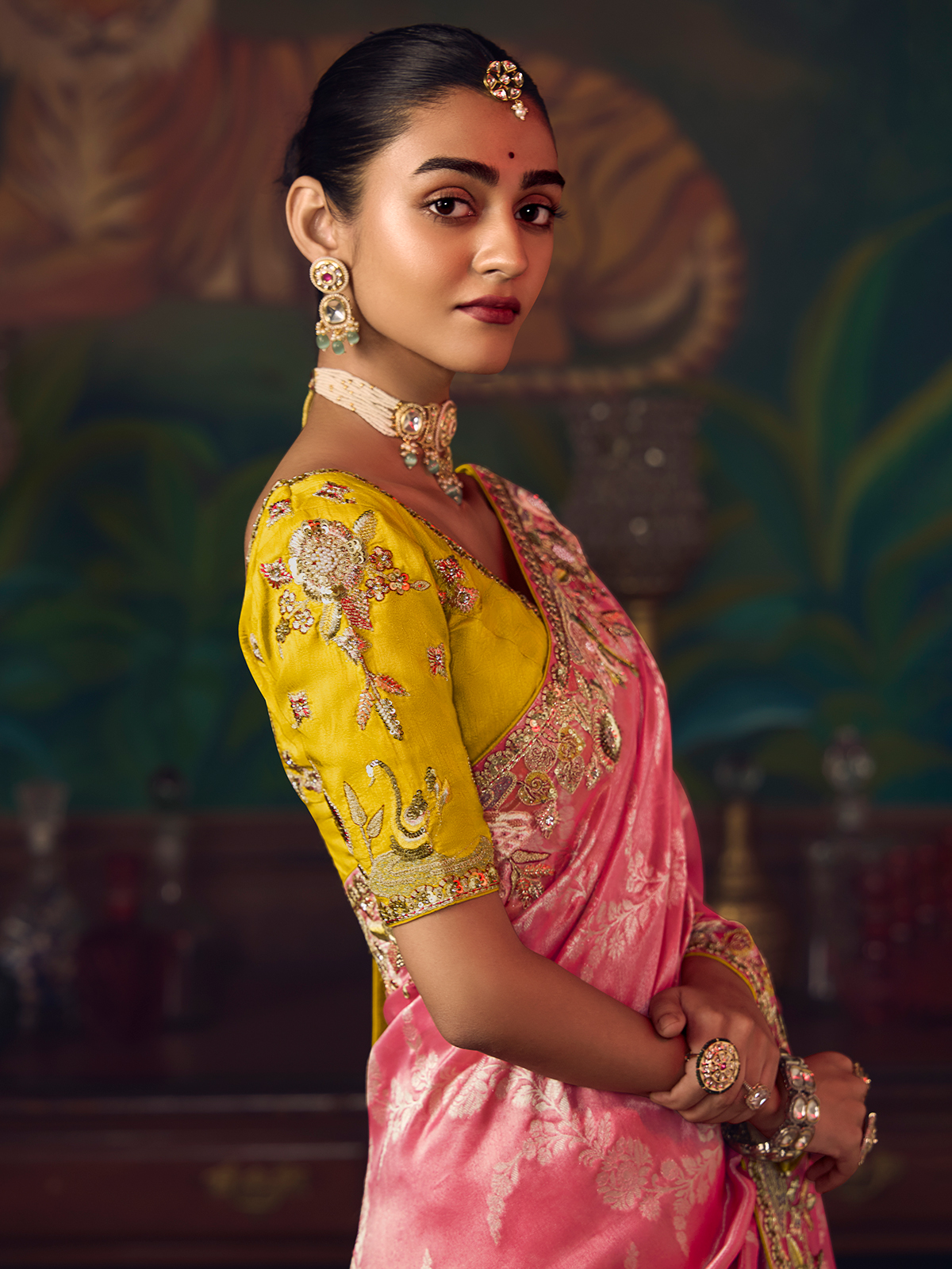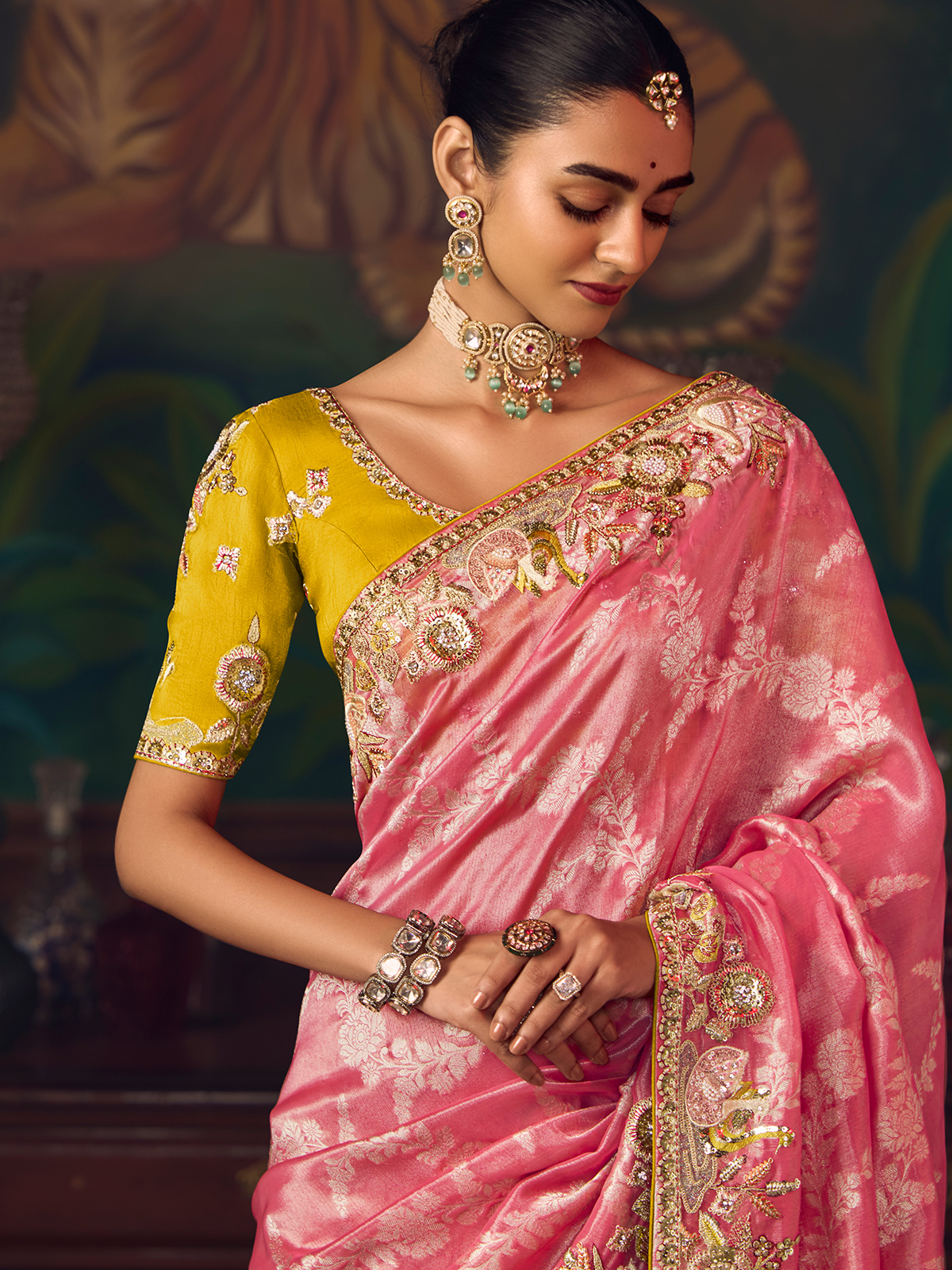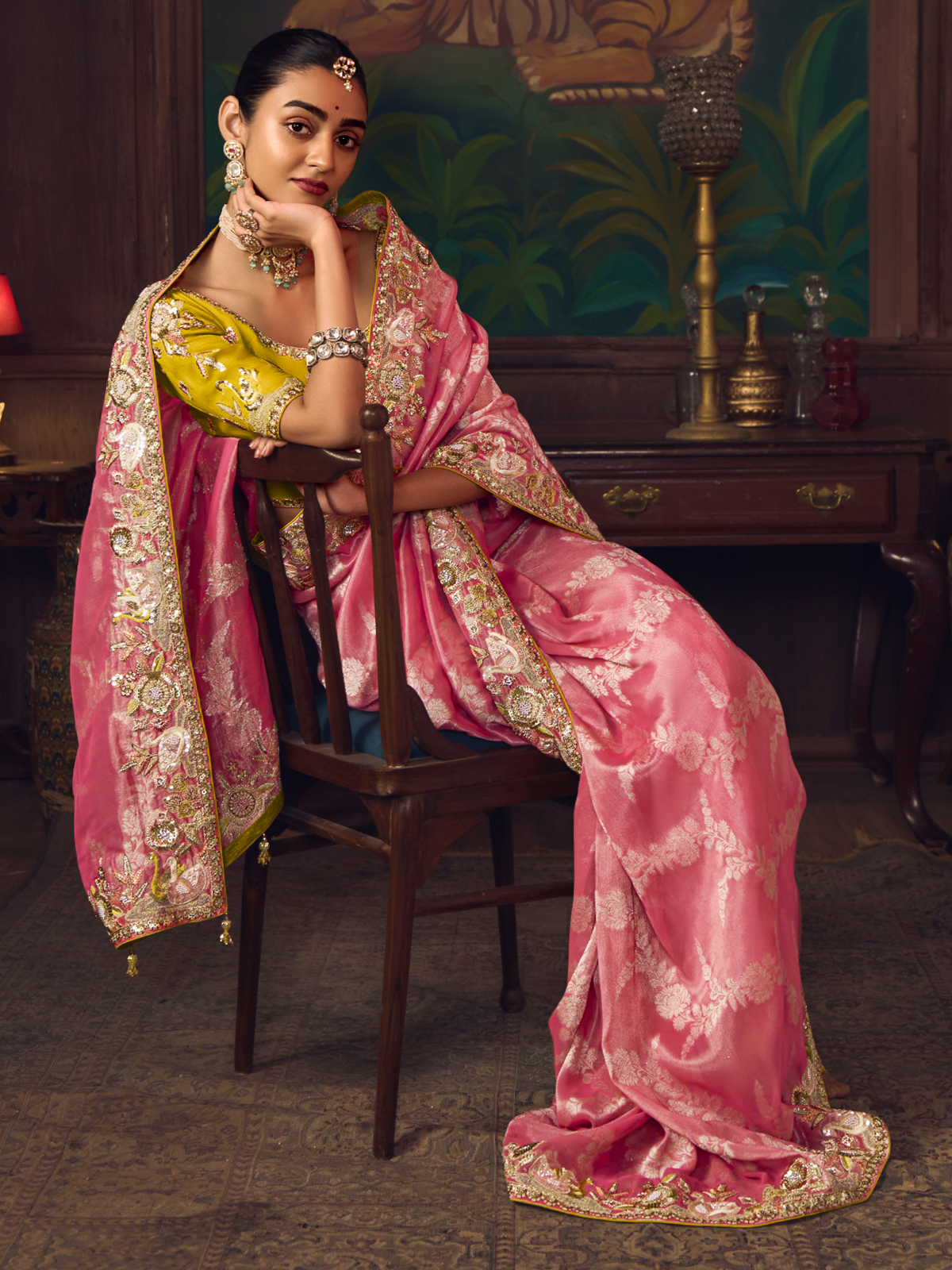 Rendered in classic pink silk saree. Features rich embroidery highlighted by sequins, pearls, diamond accents and zari work. Paired with a contrast unstitched blouse piece, it is a timeless choice for weddings, festive celebrations and reception occasions.