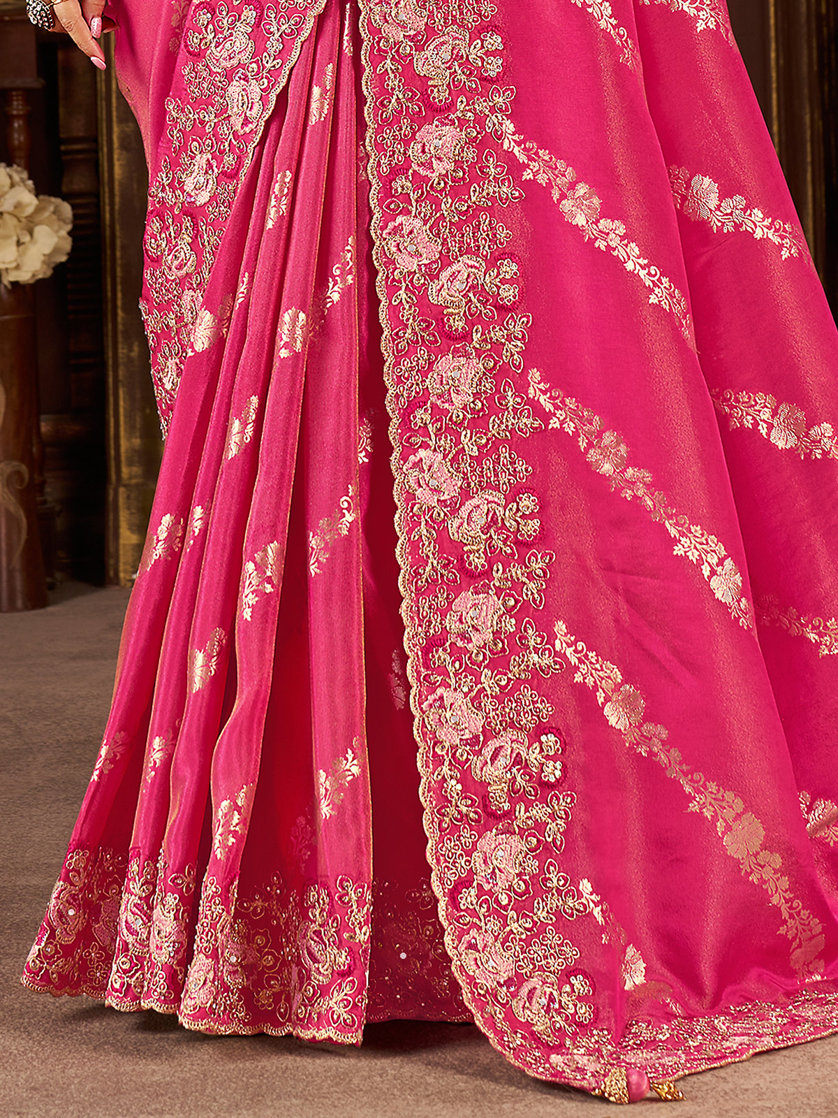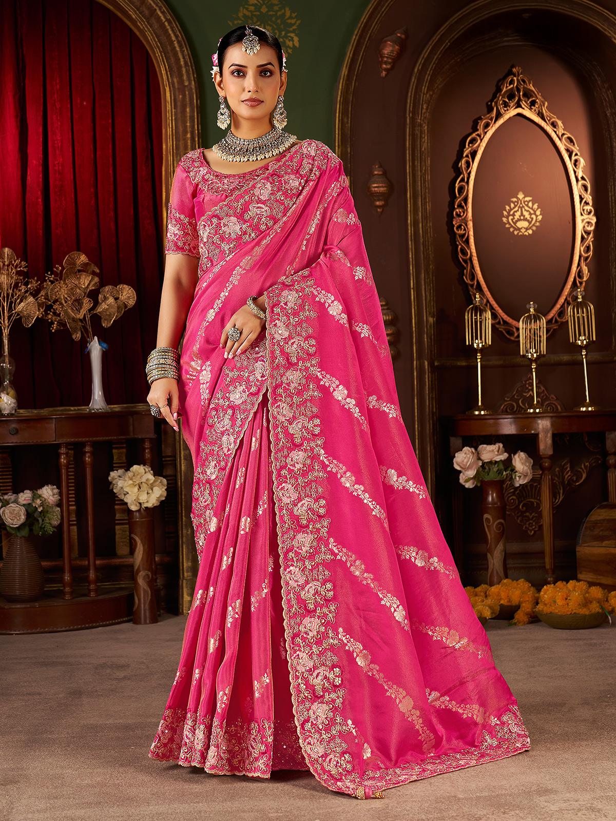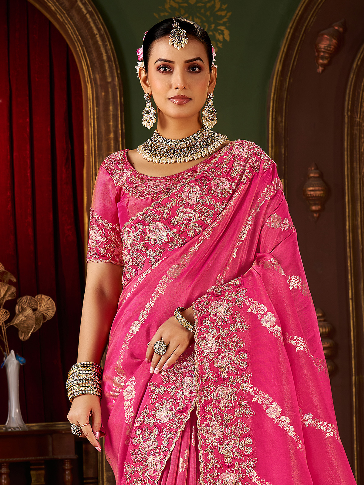 Designed in a graceful pink hue, this soft silk saree features embroidery with sequins, thread, stone, zardosi, and zari work. Completed with an unstitched blouse piece, it is ideal for weddings and festive occasions.