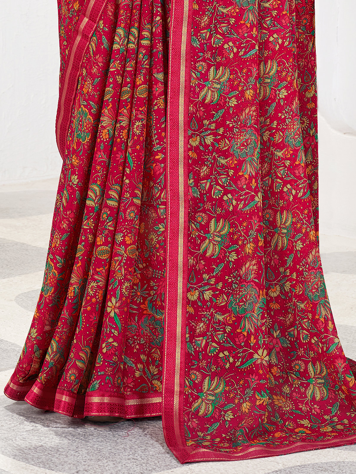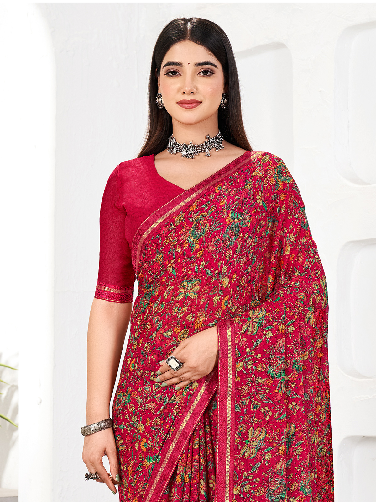 Designed in soft georgette, this pink saree showcases subtle zari work blended with traditional prints. The flowy texture adds elegance and comfort. Comes with an unstitched blouse, ideal for festive and casual wear.