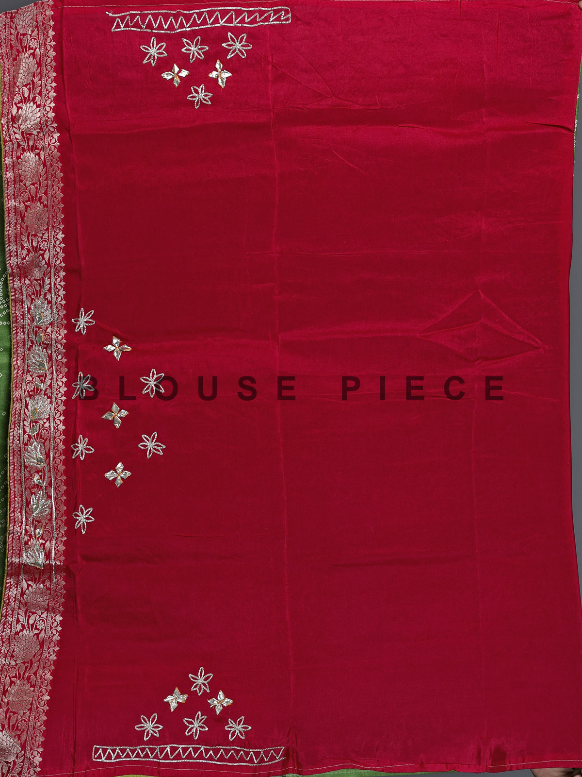Fresh and soothing pista green bandhej silk saree captures the beauty of heritage prints. Enhanced with shimmering gota and zari detailing. It creates a refined festive look. Ideal for weddings, mehendi and sangeet. It includes an unstitched blouse piece to style with effortless grace.