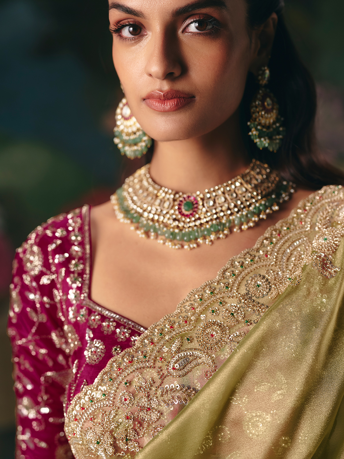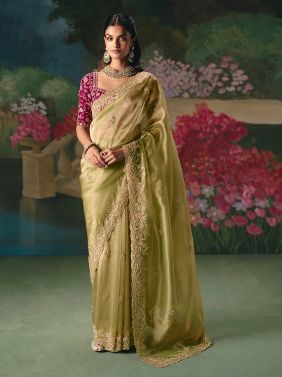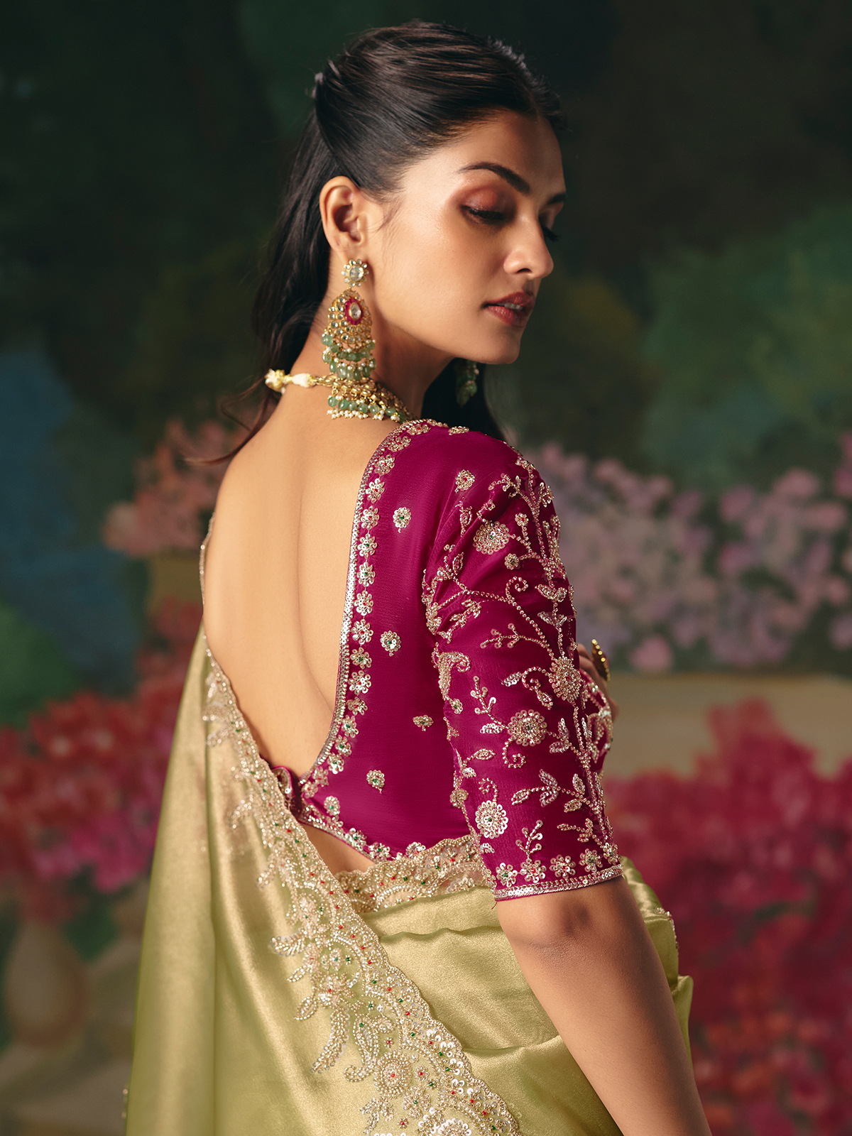Crafted in refreshing pista green chinon silk saree includes a heavy work contrast blouse decorated with cutdana, beads and sequins work. The soft flow of the saree complements the ornate blouse design. An ideal choice for weddings, receptions, sangeet and festive occasions.