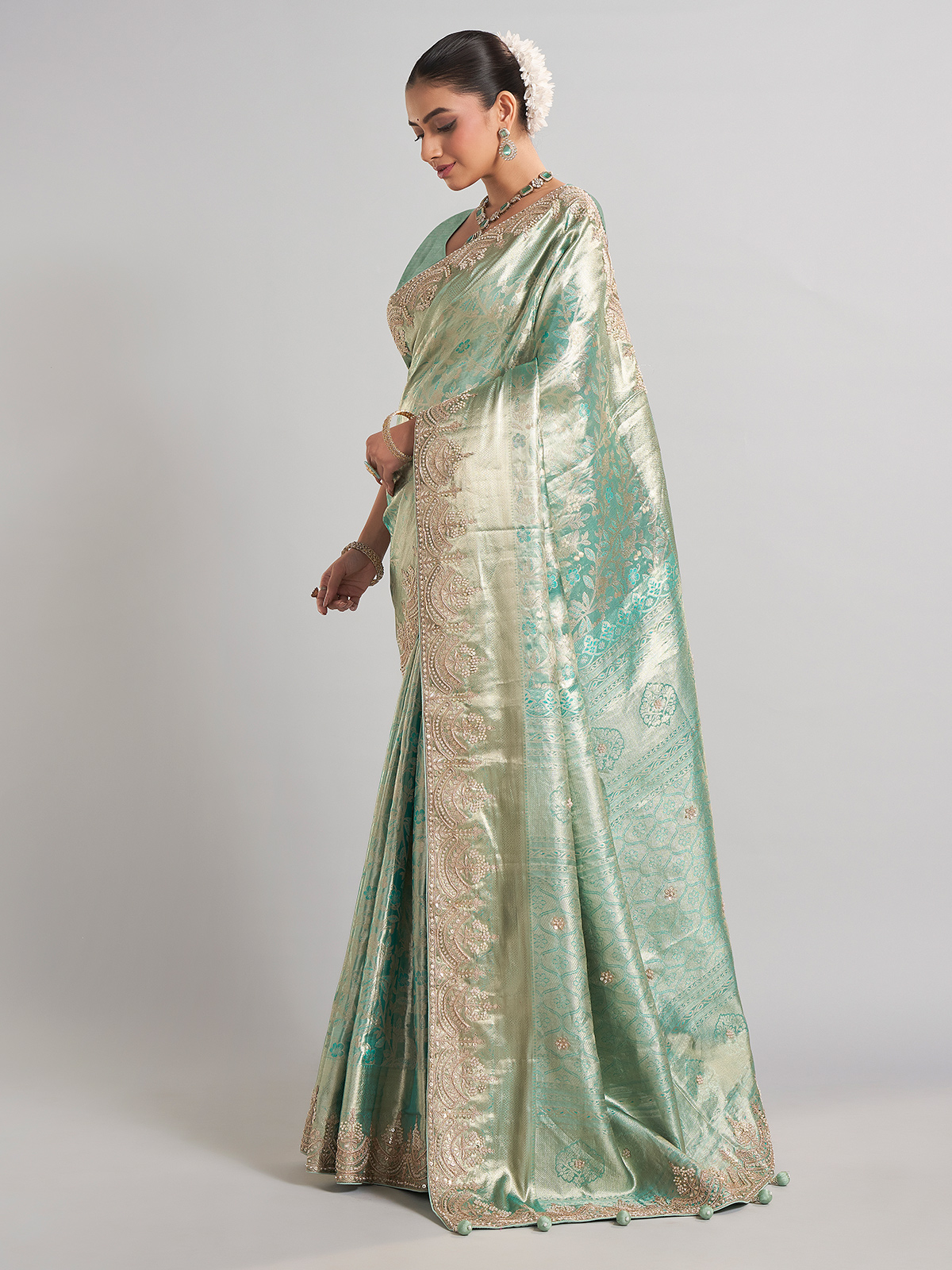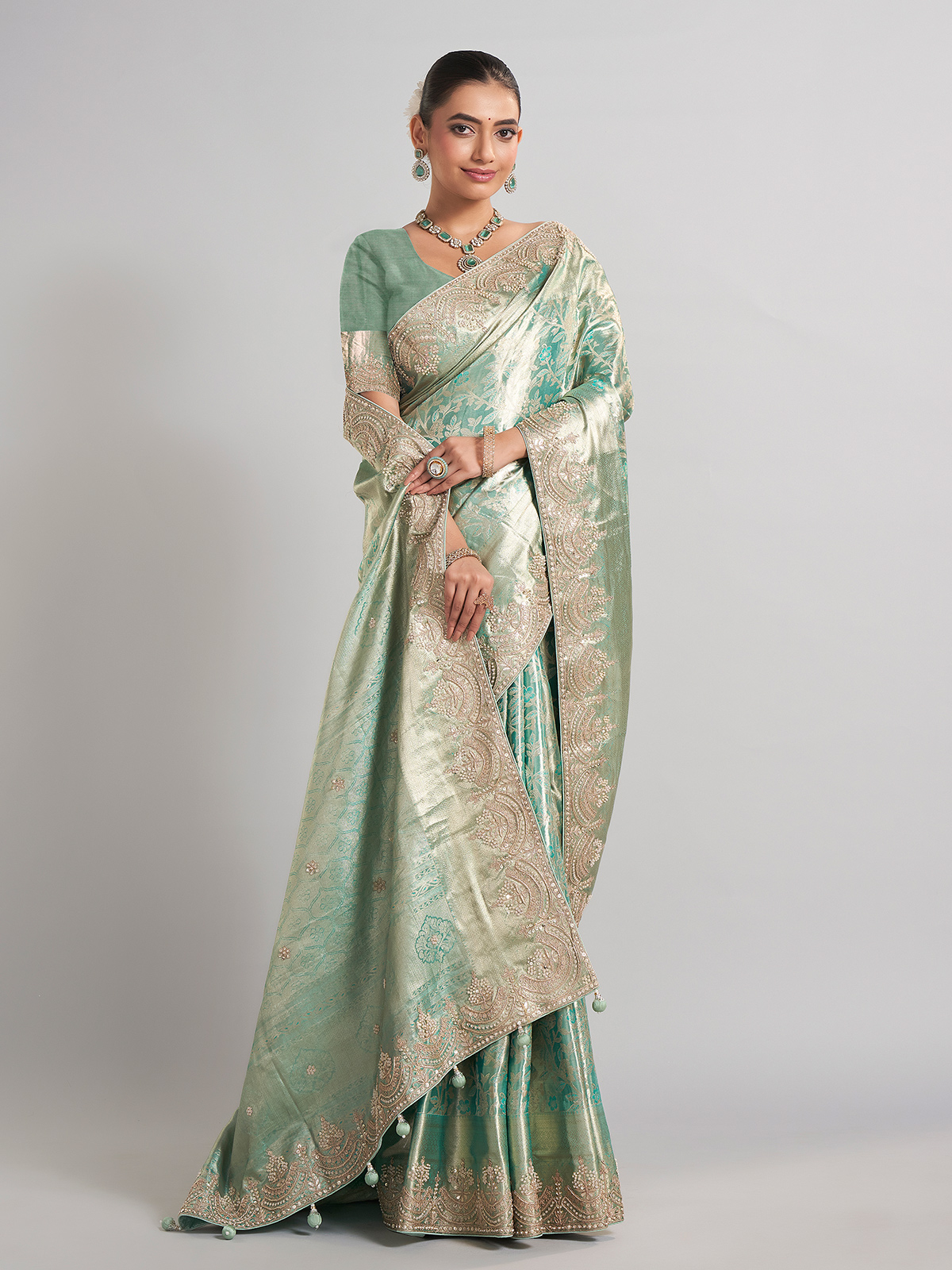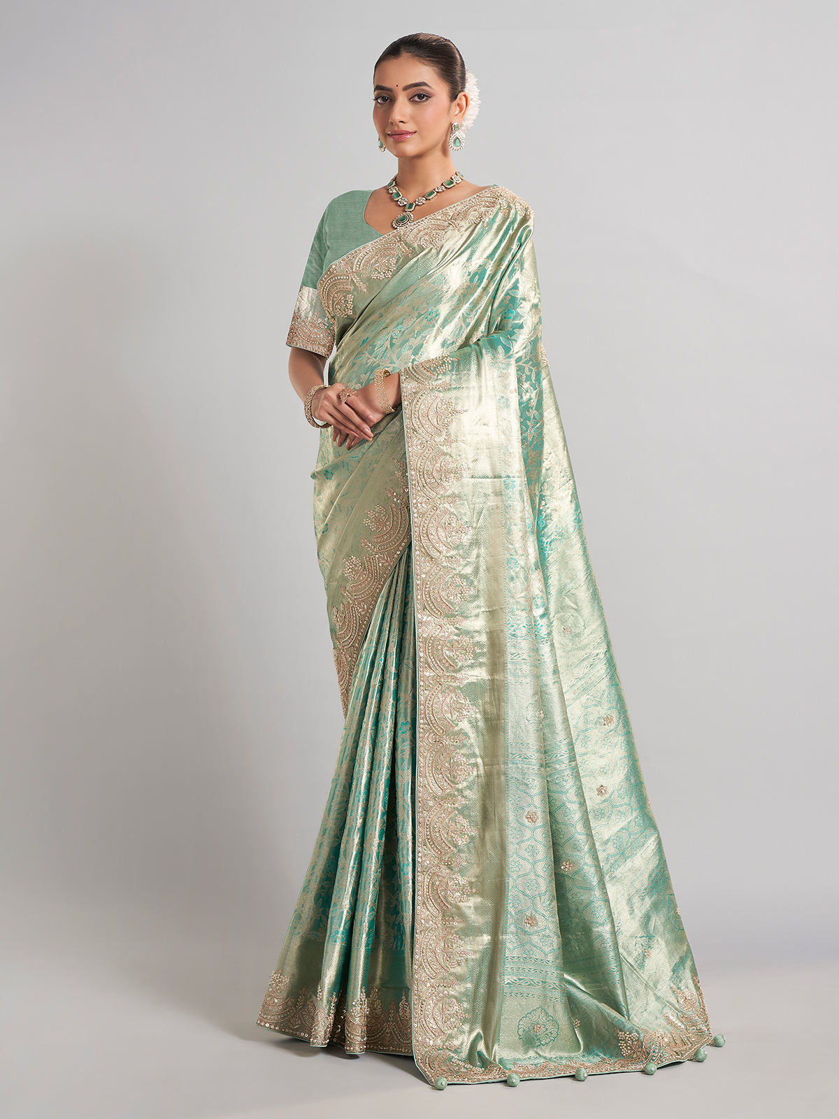 This pista green kanjivaram silk saree is a harmonious blend of tradition and artistry, featuring zardosi, sequins, beads, and cutdana work. Ideal for wedding events, it includes an unstitched blouse piece for a customized finish.