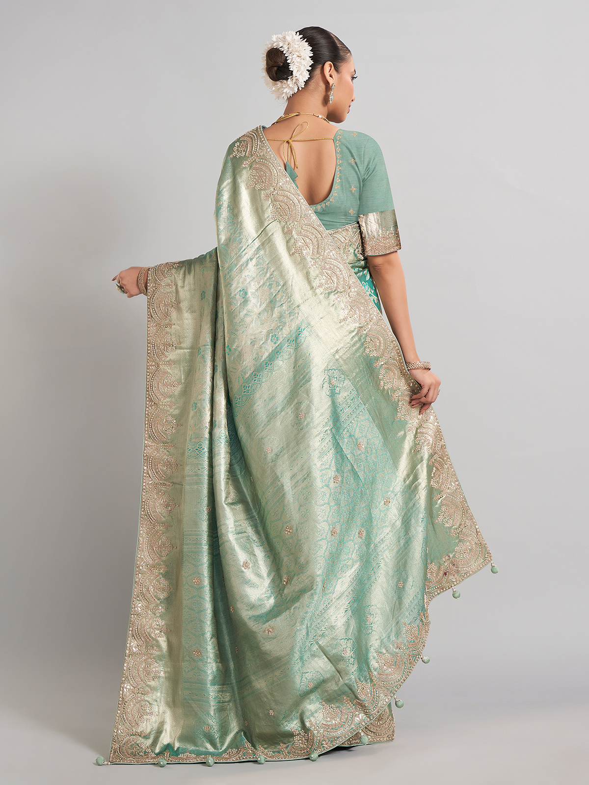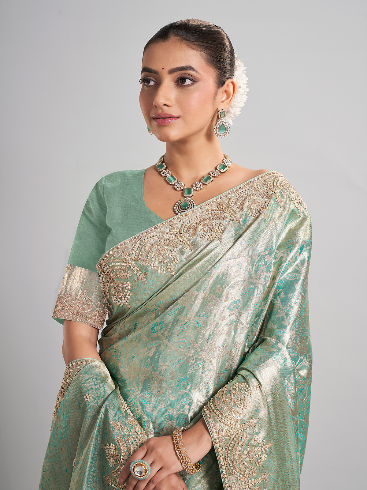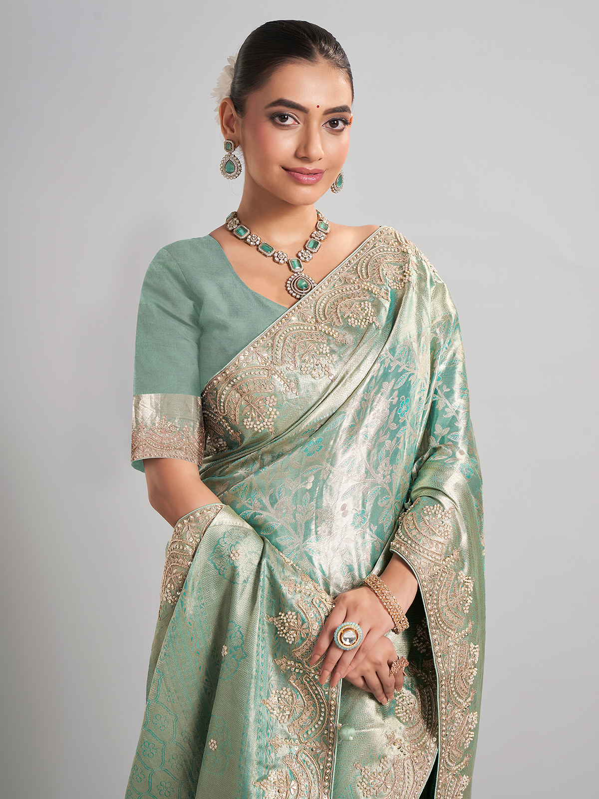 This pista green kanjivaram silk saree is a harmonious blend of tradition and artistry, featuring zardosi, sequins, beads, and cutdana work. Ideal for wedding events, it includes an unstitched blouse piece for a customized finish.