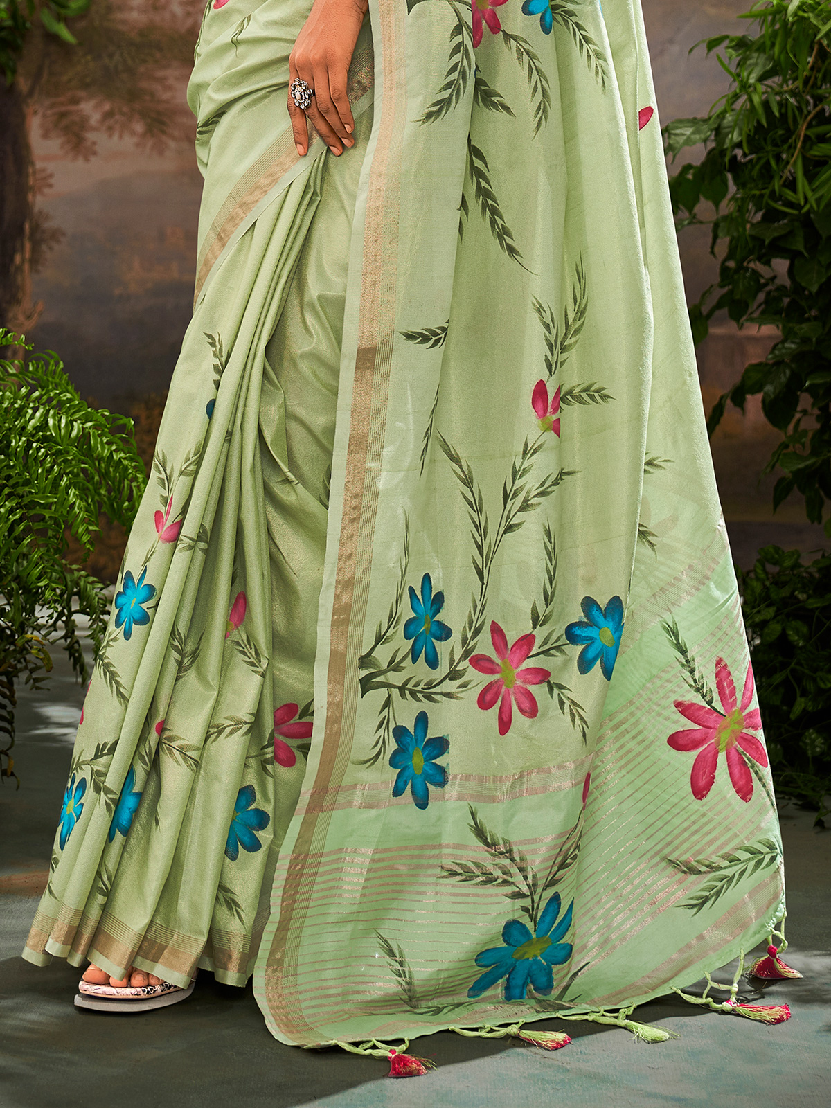 Pista Green Linen Saree With Floral Print