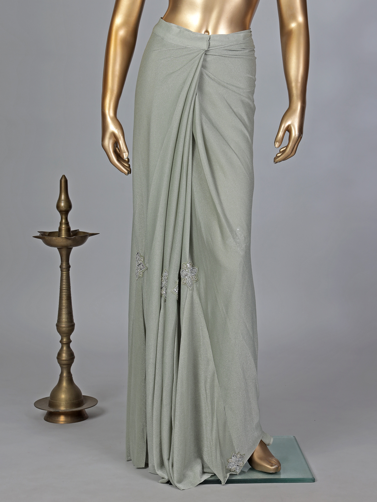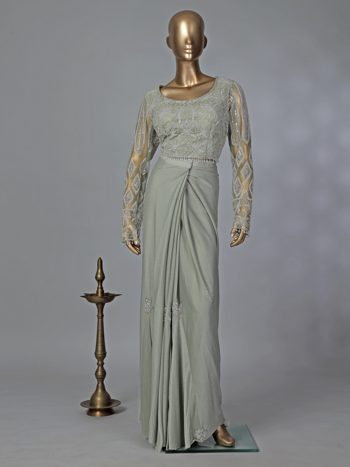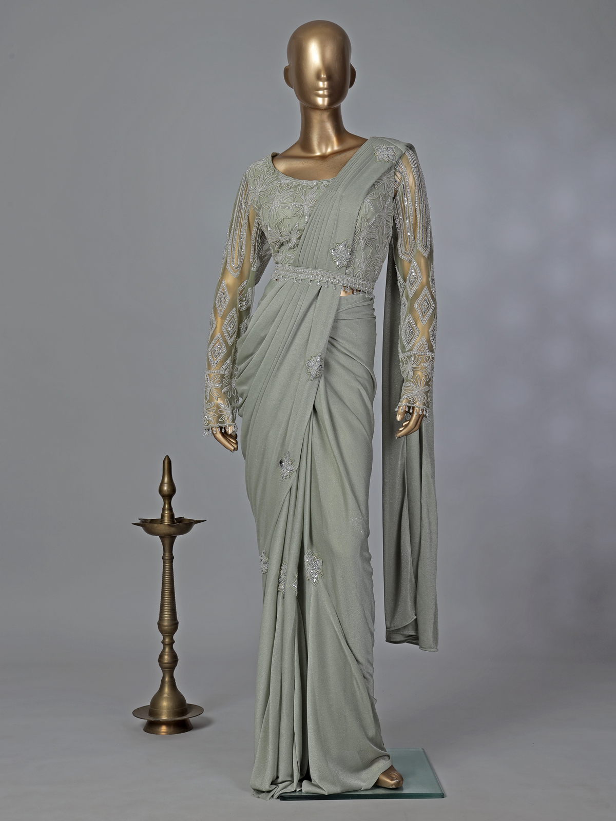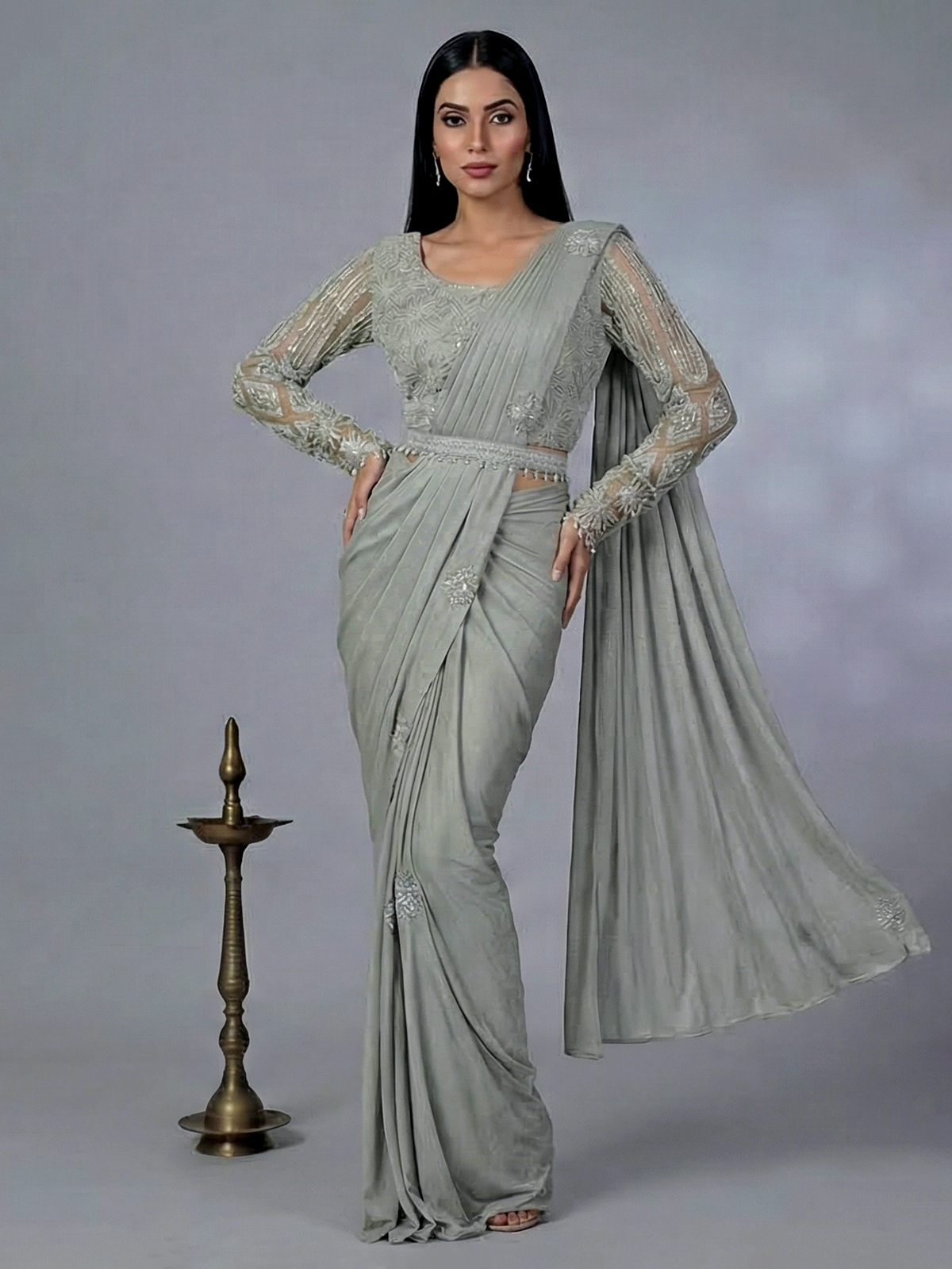 Fresh and elegant, this pista green lycra ready-to-wear saree captures soft festive beauty. The round neckline full-sleeve blouse is adorned with cutdana, stones, and bead work that creates a gentle shimmer. The belt accentuates the waistline, perfect for weddings and festive gatherings.