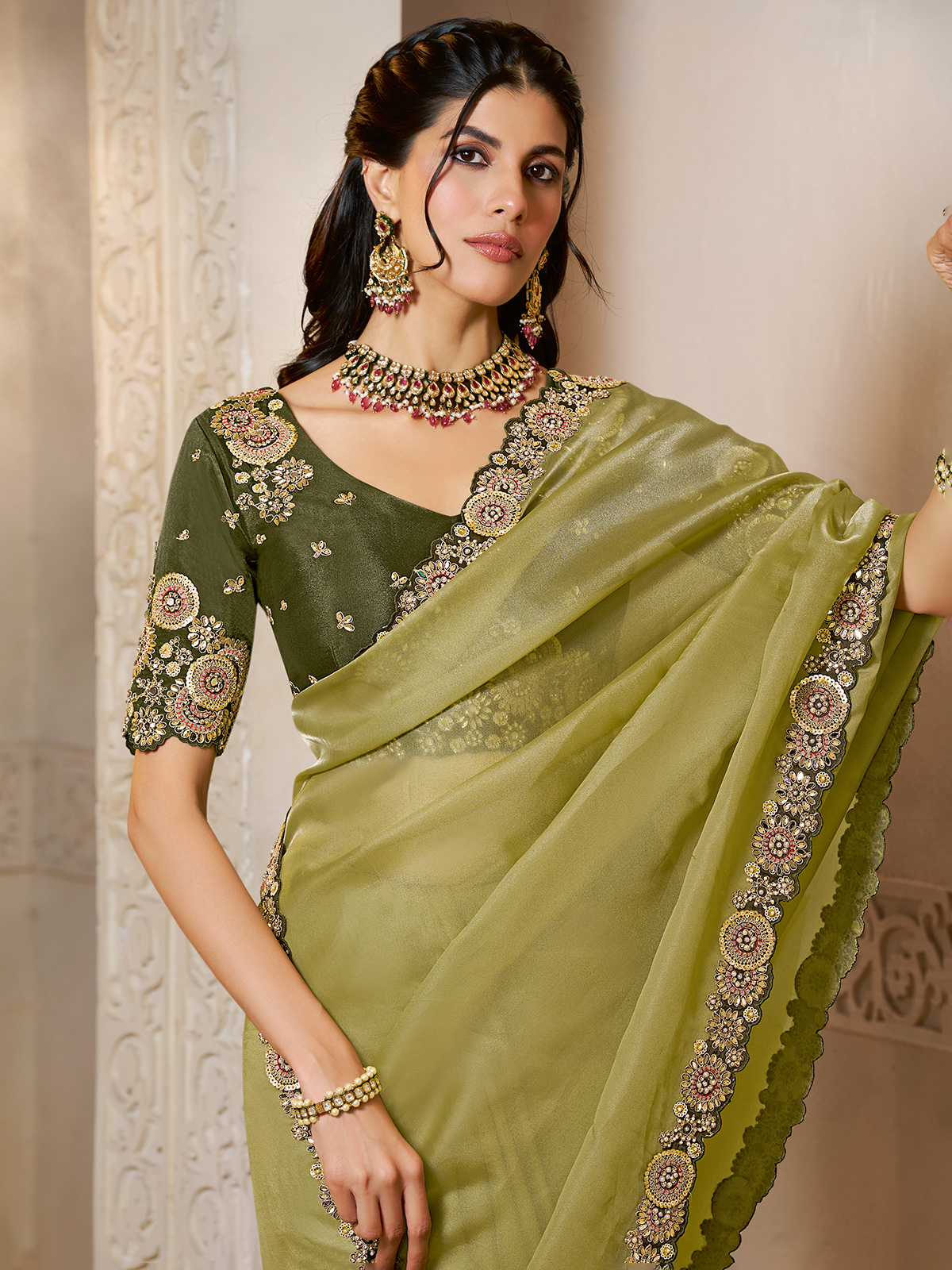 Draped in pista green organza satin, this saree dazzles with embroidery, mirror, diamond, and pearl details. Its airy elegance makes it ideal for mehendi, festive gatherings, or daytime celebrations. Comes with an unstitched blouse piece for easy customization.