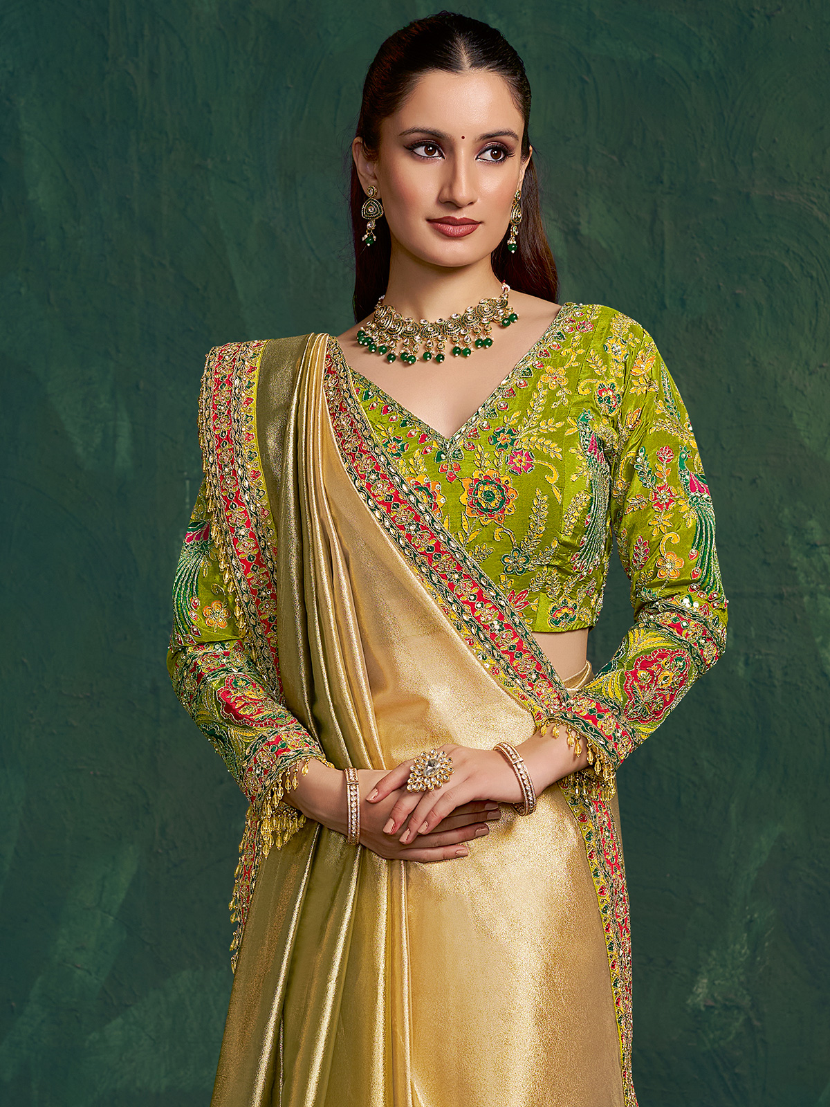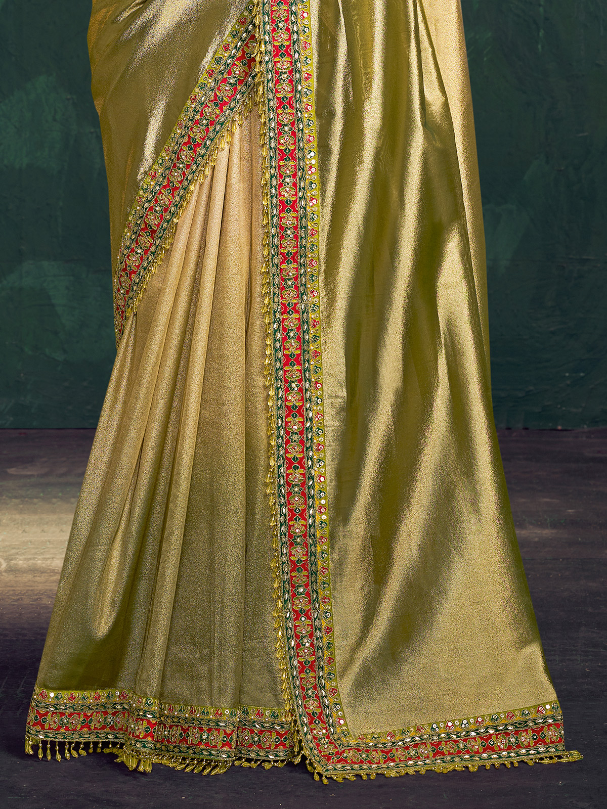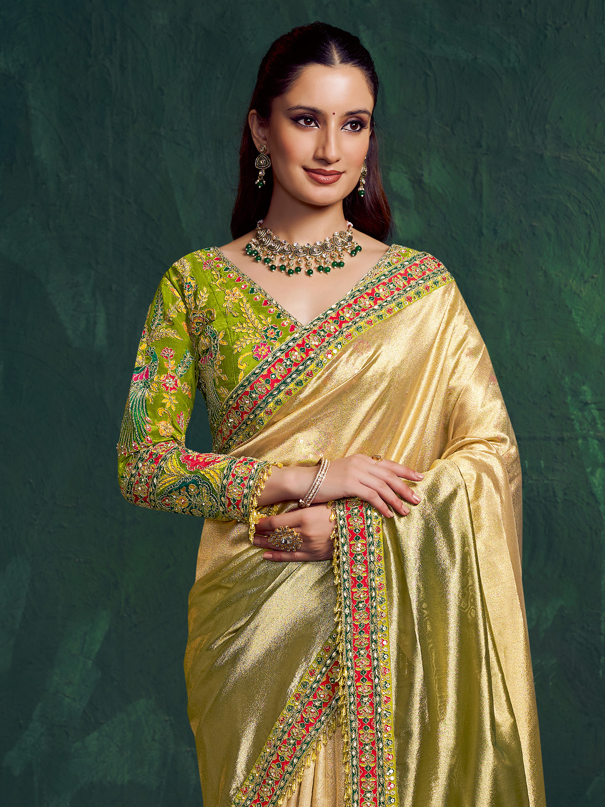 Styled in elegant shaded pista green kora zari tissue silk, this saree is enhanced with embroidery, sequins, cutdana and pearl detailing. The luminous texture creates a refined drape. Paired with a contrast unstitched blouse piece, it suits weddings, receptions, festive gatherings and sangeet celebrations beautifully.