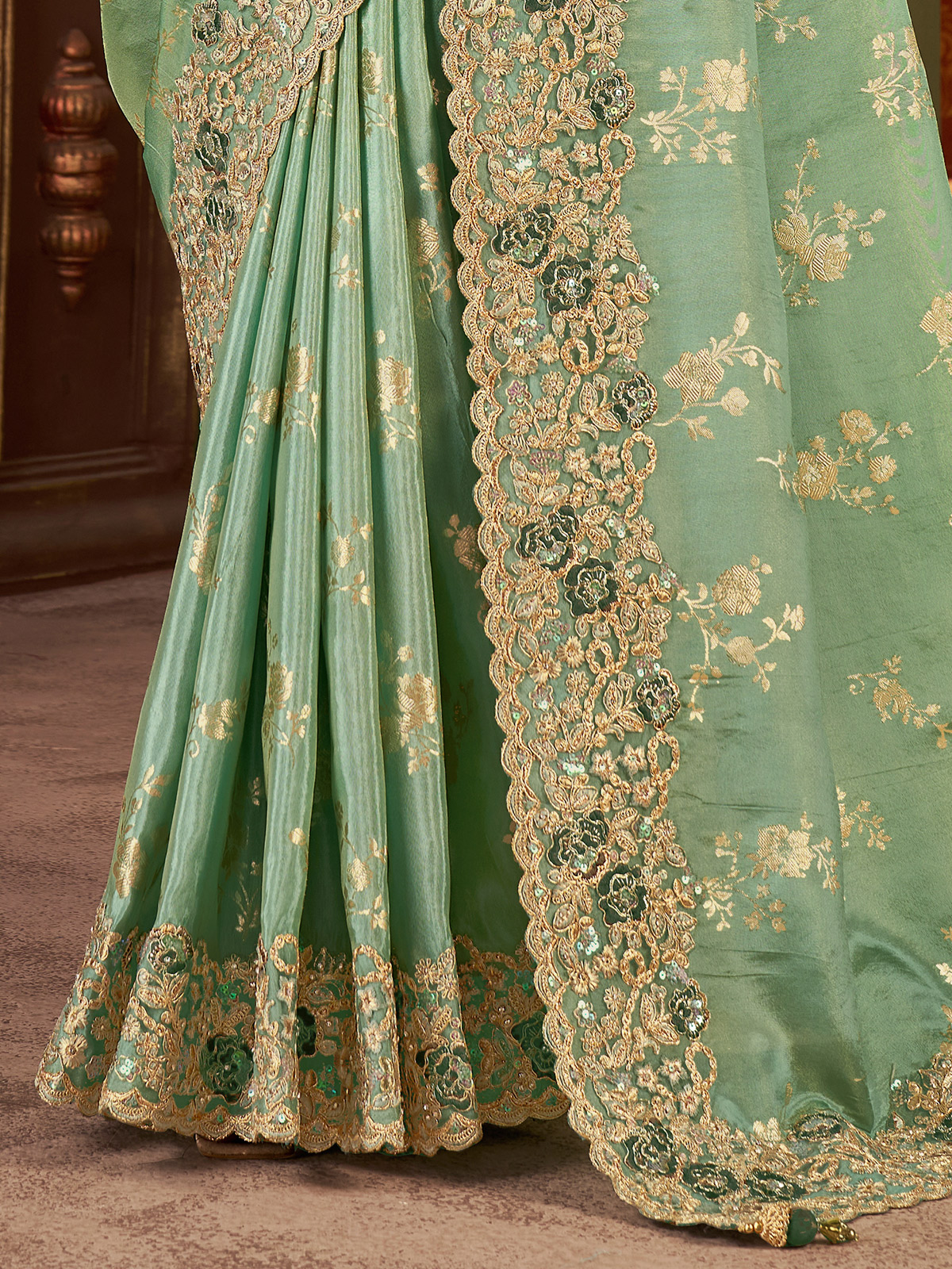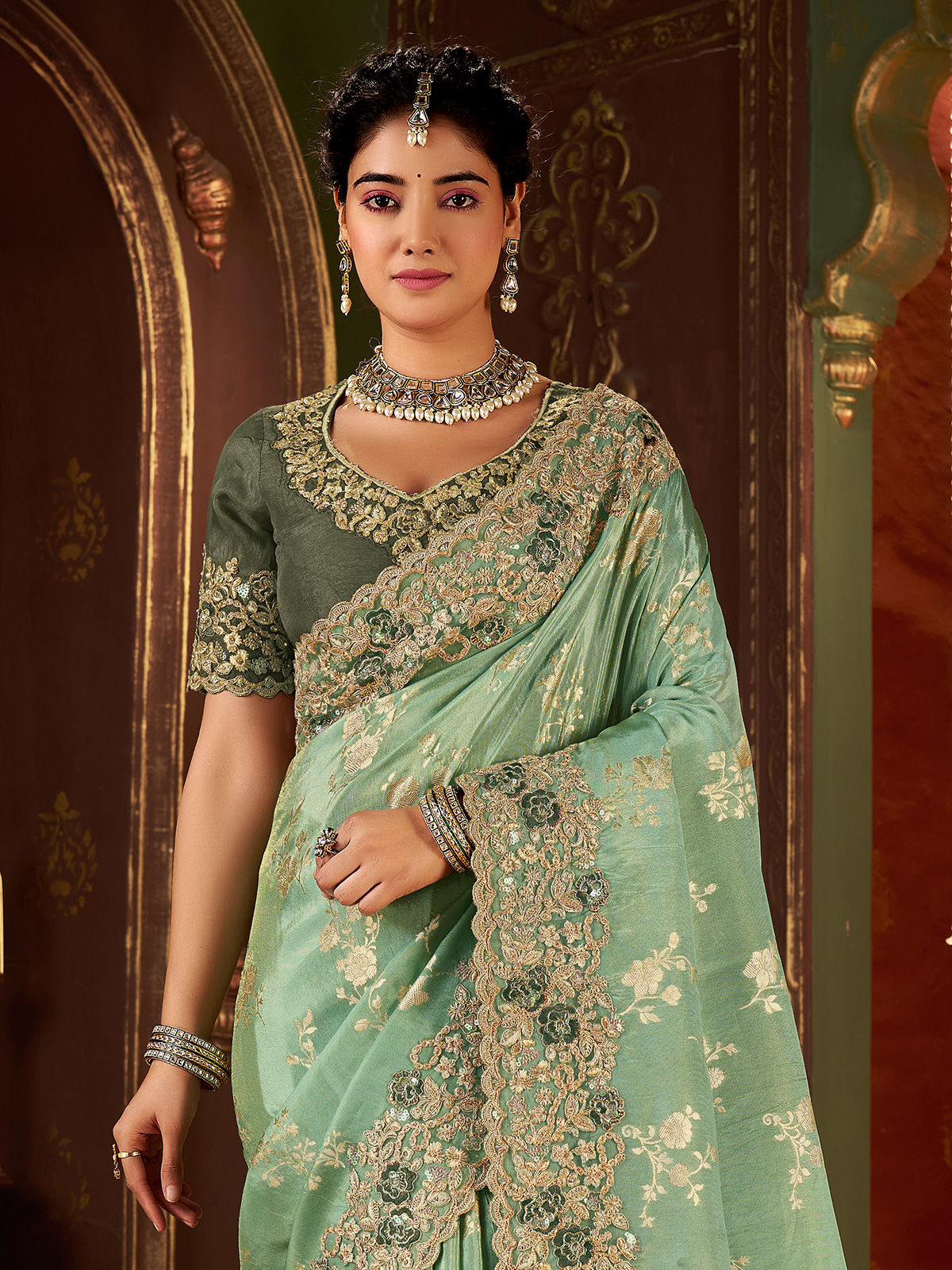 This pista green soft silk saree is beautifully detailed with embroidery, sequins, thread, stone, zardosi, and zari work. Finished with a contrast unstitched blouse piece, it is perfect for weddings, sangeet, receptions, and festive gatherings.