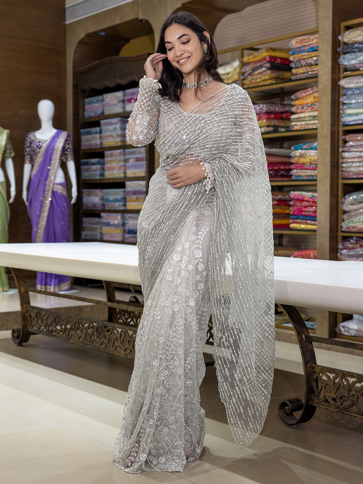 Soft as a morning mist, this pista net saree glows with delicate allure. Its sequins, cutdana, and bead embellishments shimmer like dewdrops across a dreamy expanse. Paired with a readymade blouse, it is a graceful pick for weddings and receptions that call for effortless sophistication.