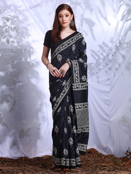 Embrace understated style with this black and blue Bhagalpuri silk saree. Crafted for comfort and elegance, it showcases a refined print and includes an unstitched blouse piece.