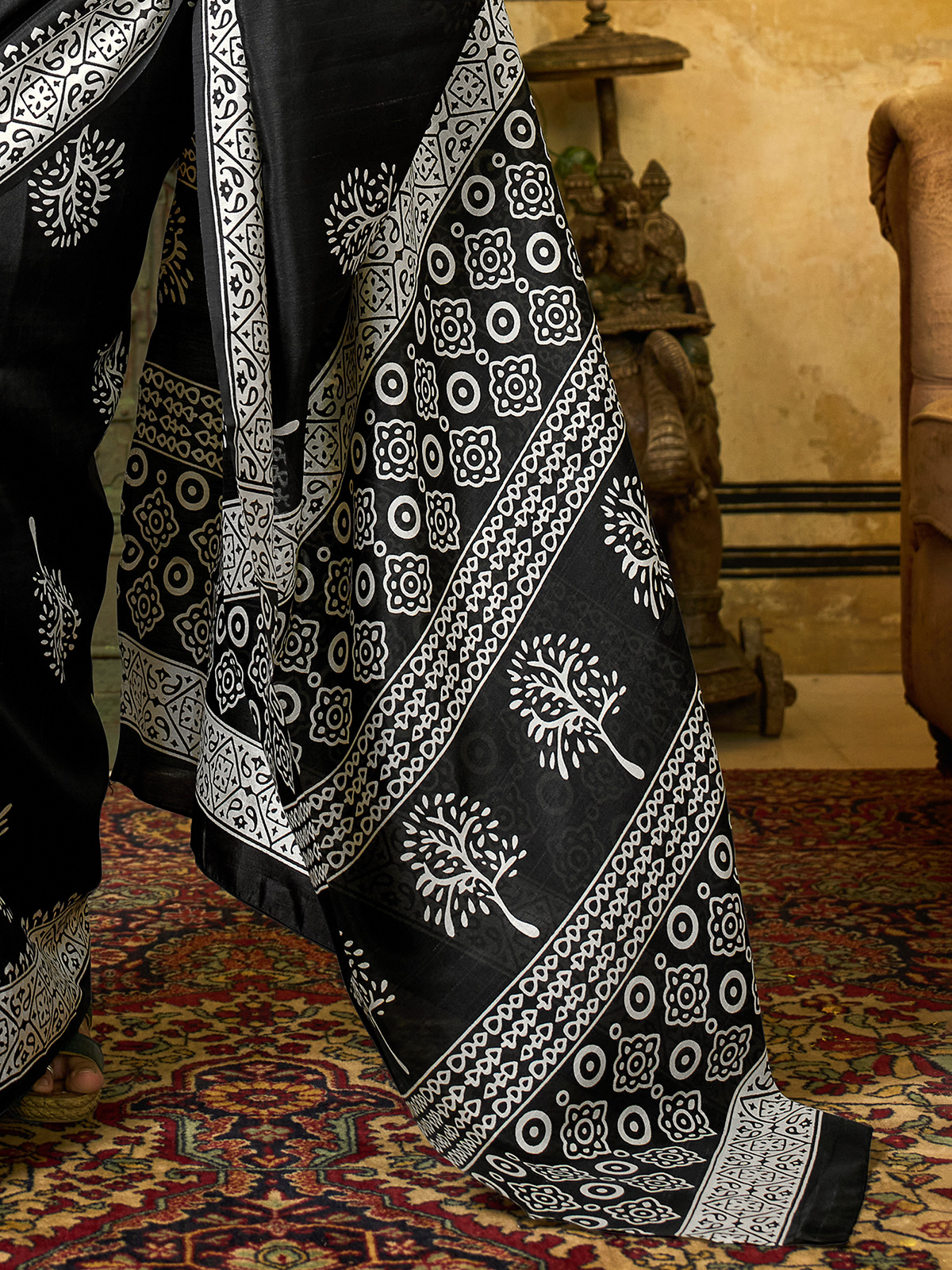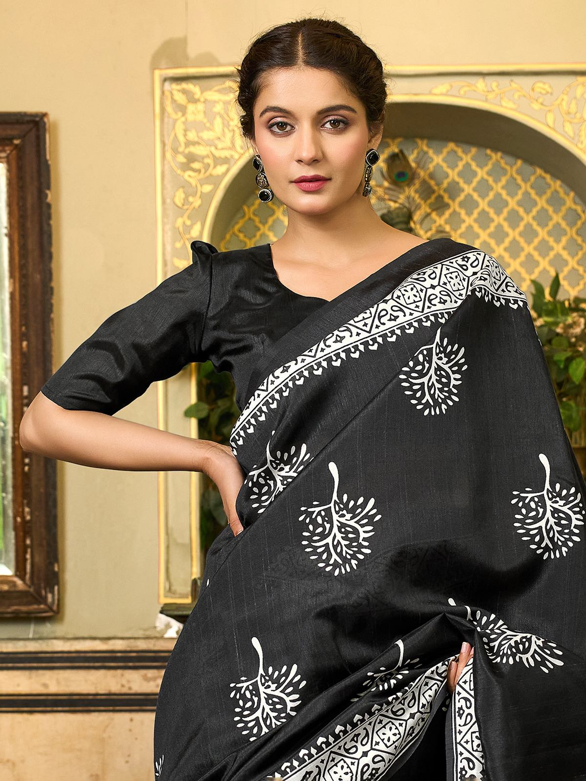 Exude timeless elegance in this rich black Bhagalpuri silk saree. Its eye-catching printed pattern and smooth texture make it a standout choice for any occasion. Comes with an unstitched blouse piece for added versatility.