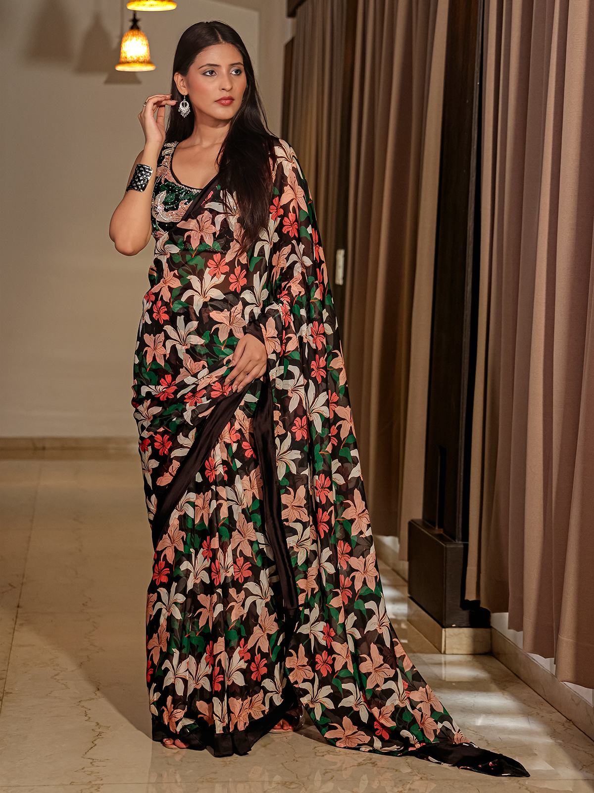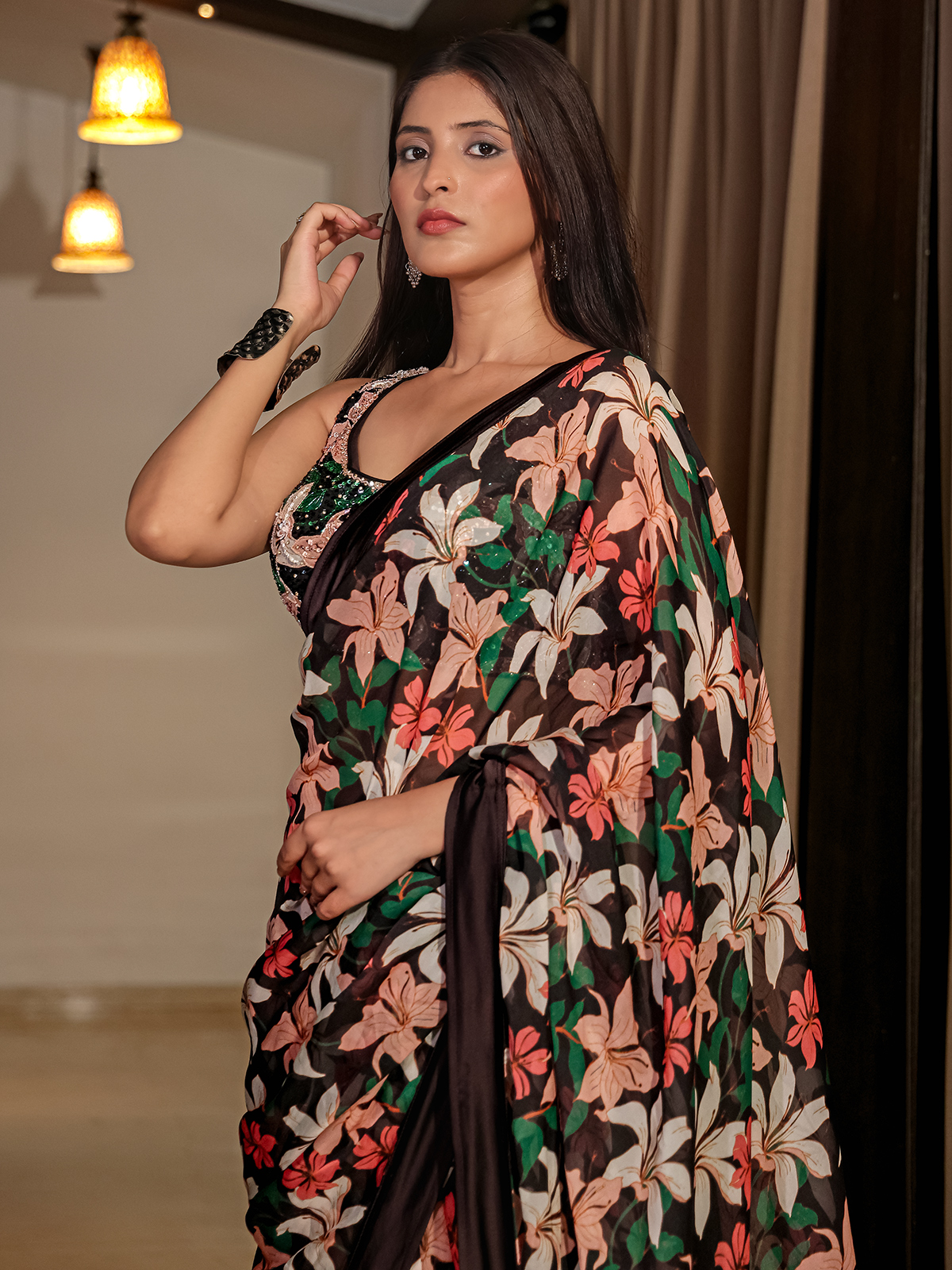 Make a lasting impression at any special event with this stunning black georgette saree, adorned with graceful floral motifs and intricate handwork. Embellished with delicate cutdana, shimmering stones, sequins, and pearl accents, this saree beautifully merges classic elegance with a modern edge. Perfect for festive gatherings or evening parties, it comes paired with a stylish pre stitched blouse for a refined, ready to wear look.