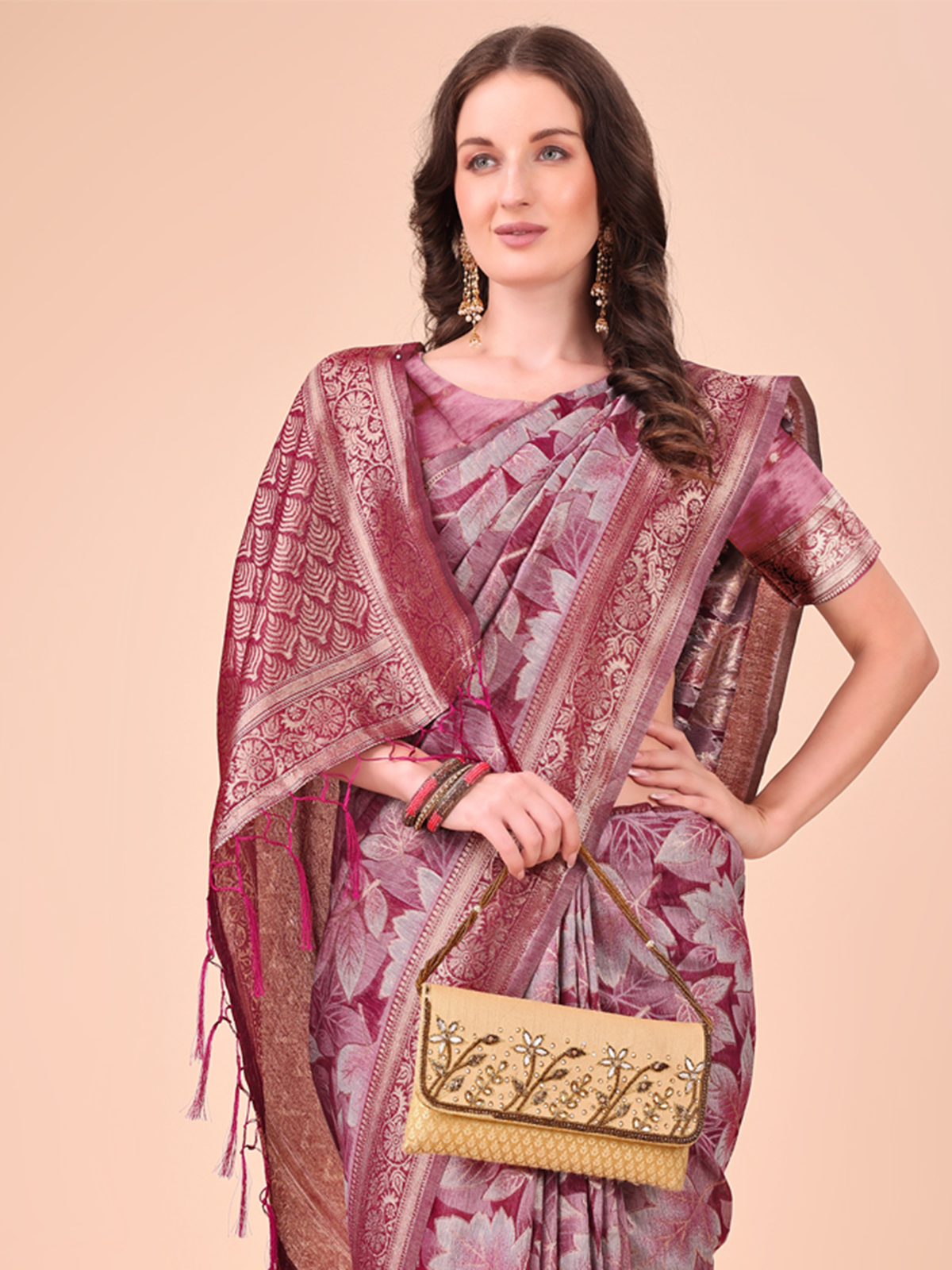 Drape yourself in festive elegance with this maroon cotton silk saree, highlighted by beautiful prints and rich zari weaving. The luxurious texture and subtle sheen make it ideal for celebrations. Comes with an unstitched blouse to tailor your perfect traditional ensemble.