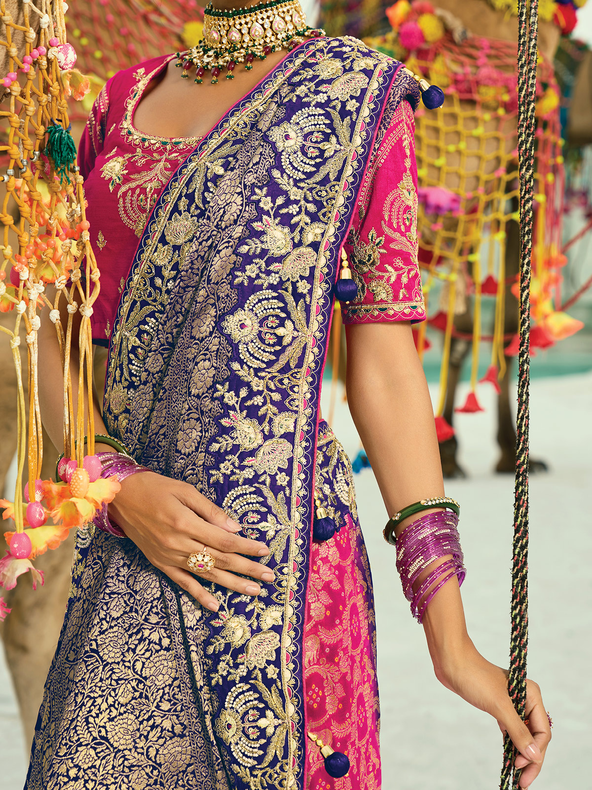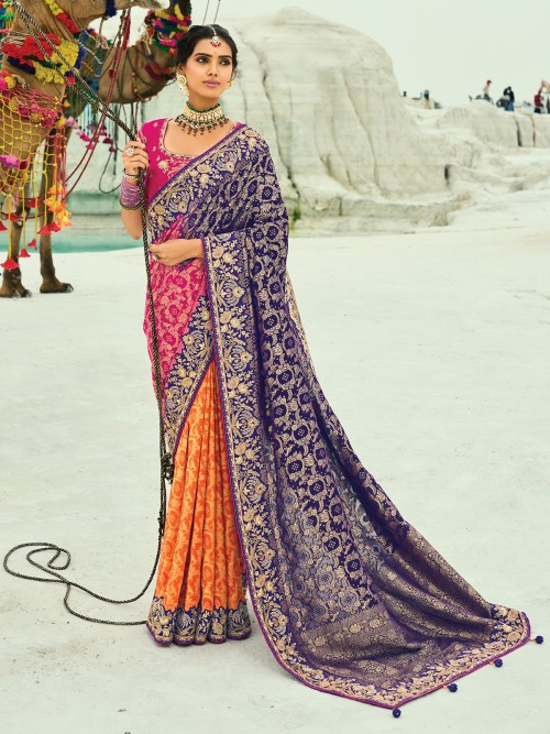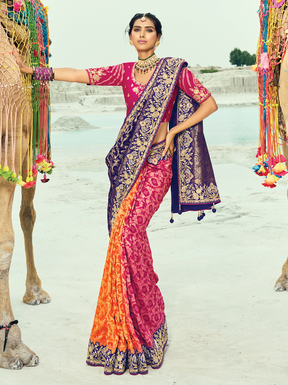 This purple and rani Bandhej georgette saree glistens with resham, sequins, zari, pearls, cutdana, and zardosi embellishments. Perfect for weddings and festive gatherings, it exudes timeless beauty and sophistication, paired with an unstitched blouse piece.