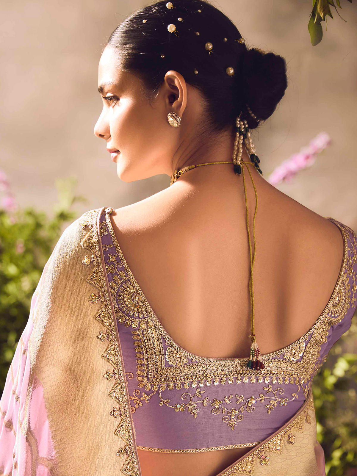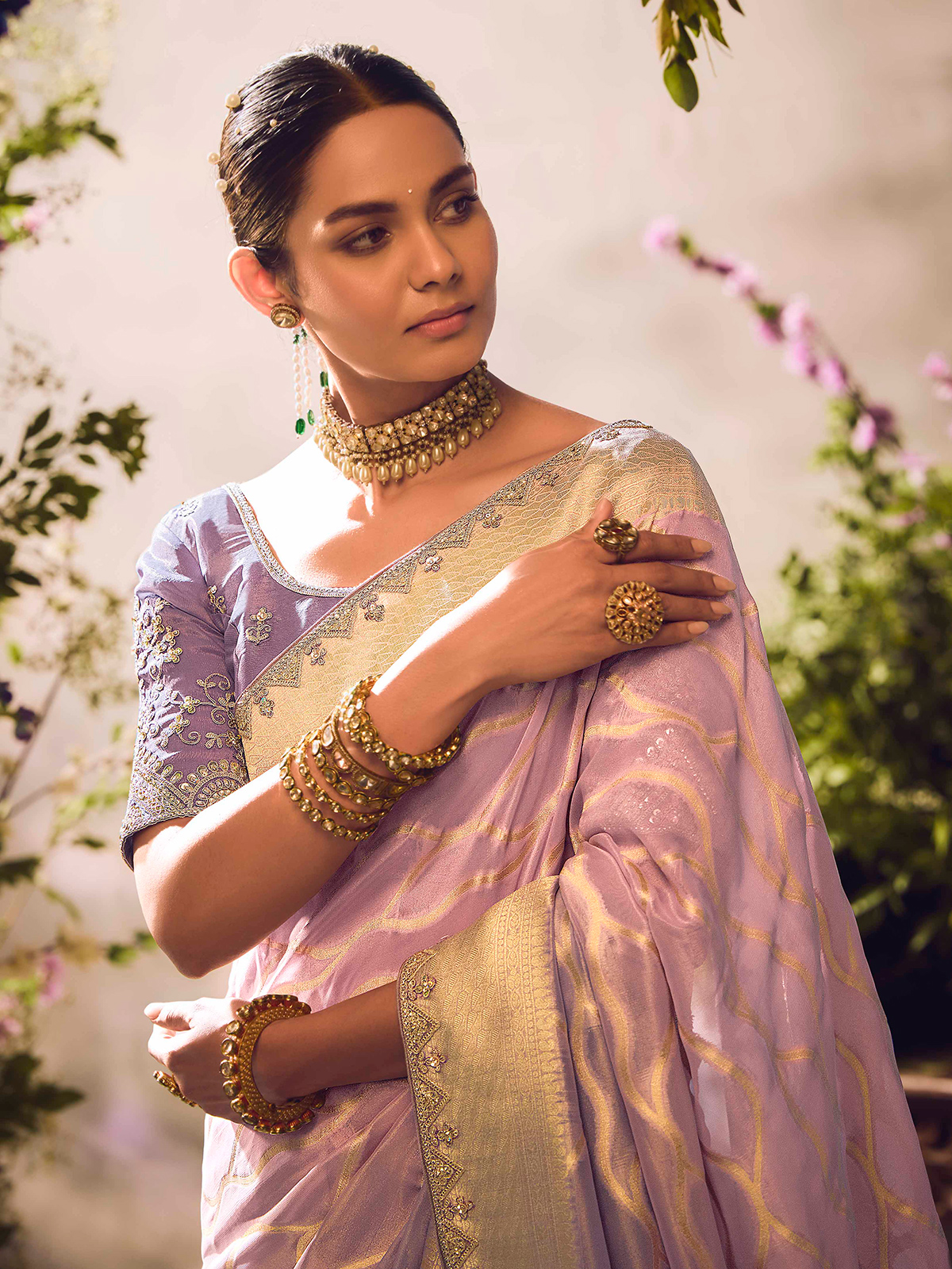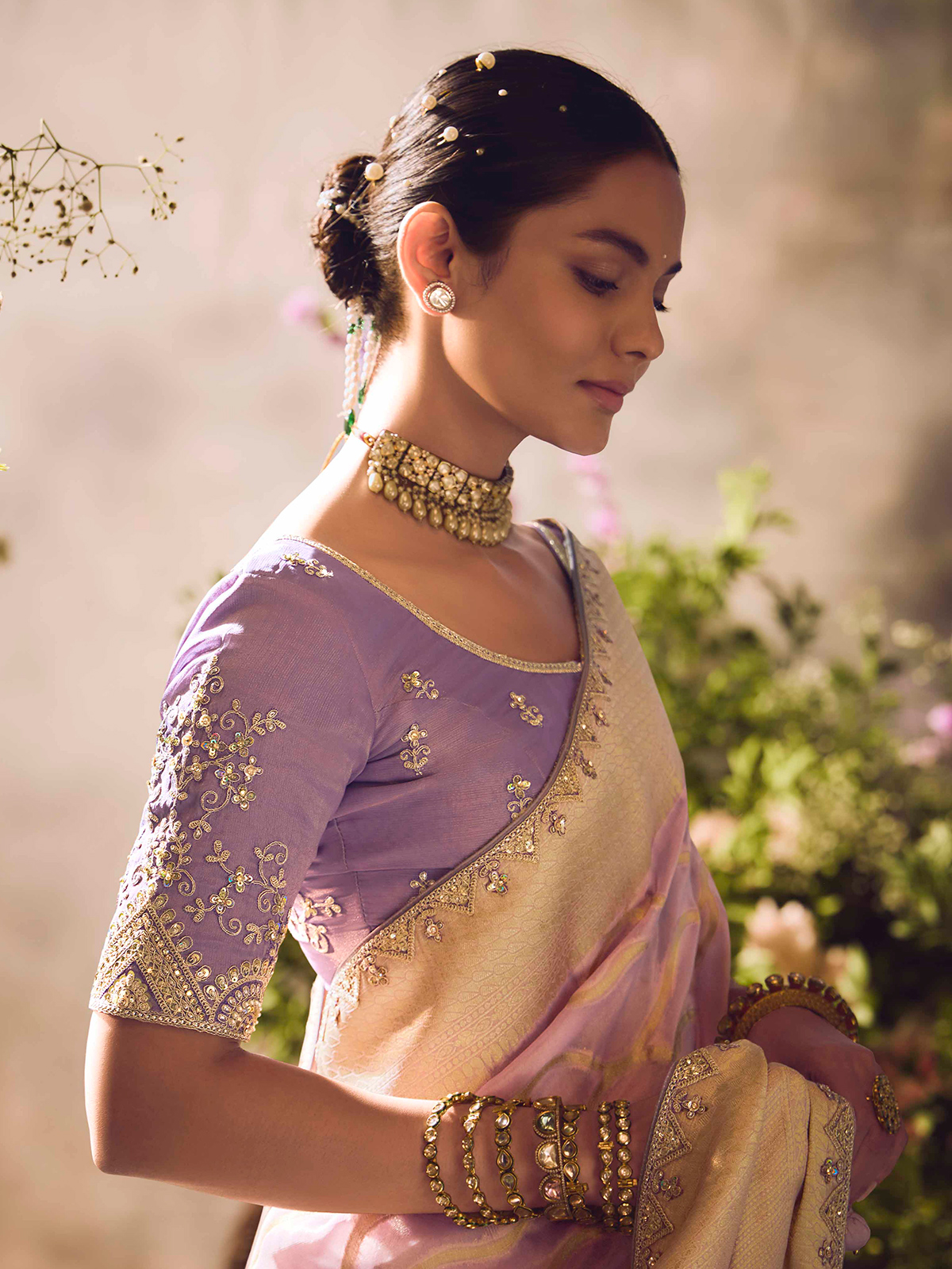 Elevate your festive wardrobe with this purple Banarasi tissue saree featuring detailed zari, resham, zardosi, sequins and stone embellishments. Perfect for weddings and celebrations, it comes with an unstitched blouse piece, allowing you to customize a stunning traditional look.