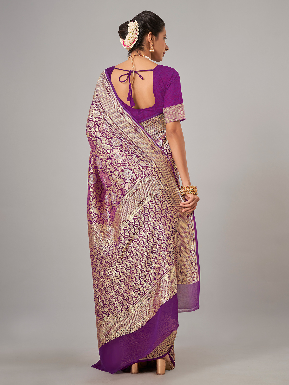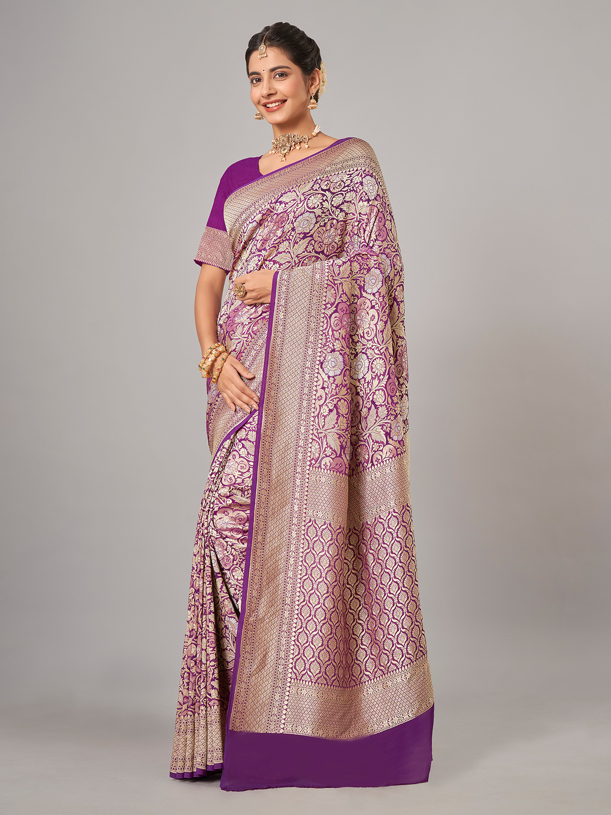 Elevate your look this wedding season with this purple banarsi silk saree showcasing exquisite zari weaving. A blouse piece is included for a complete ensemble.