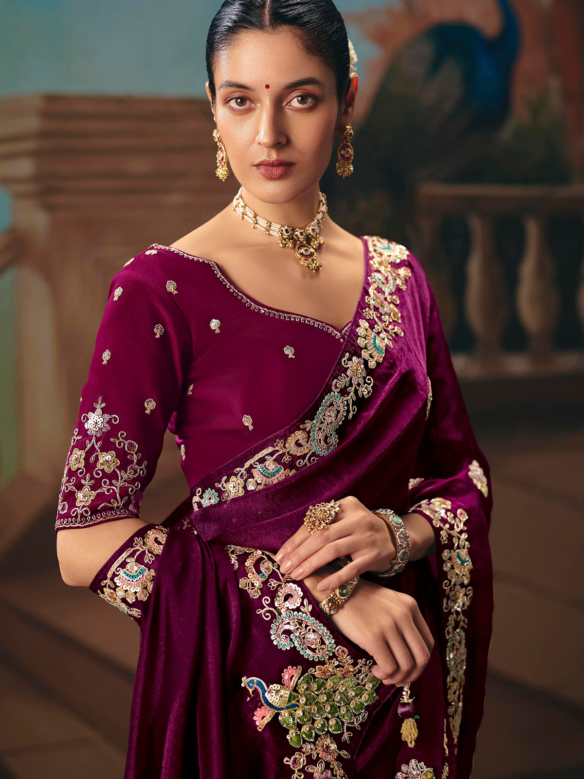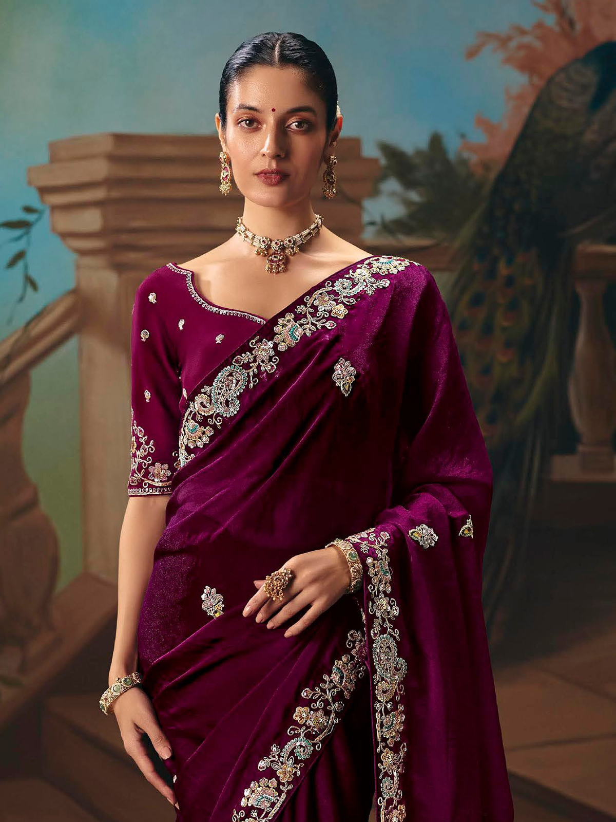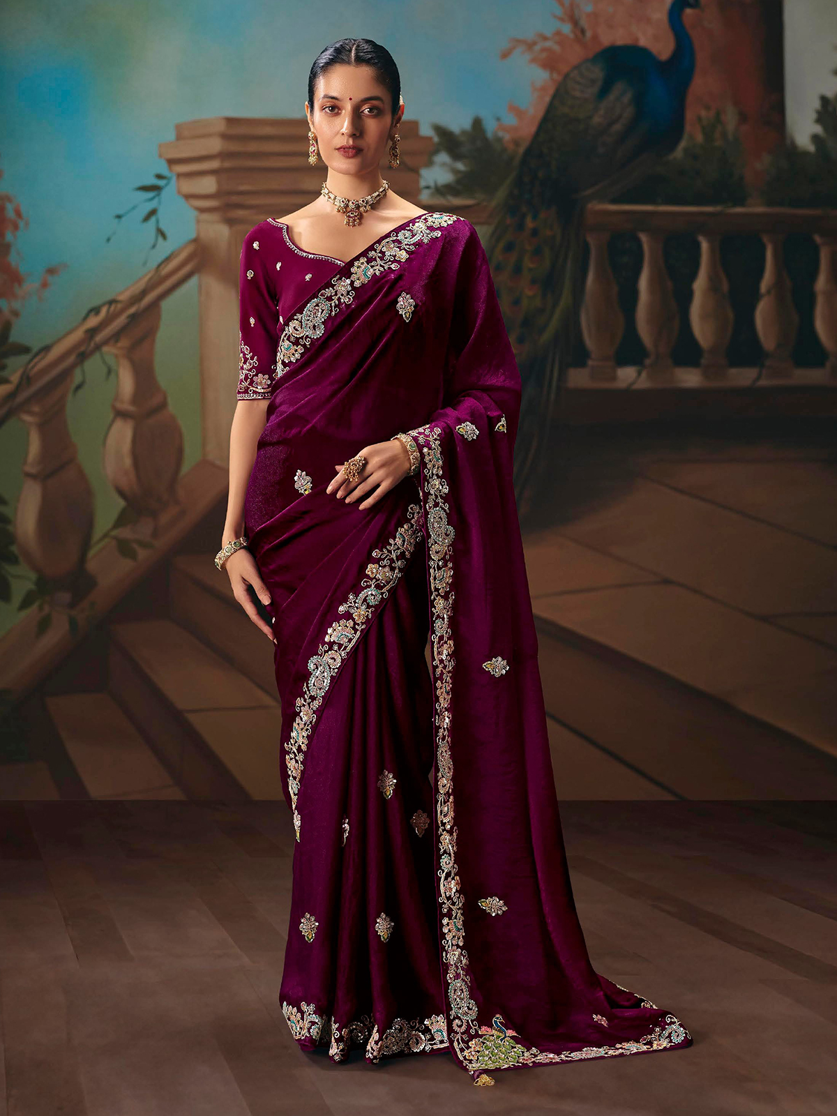 This elegant purple chiffon silk saree features delicate butti work highlighted with embroidery, resham, diamond and sequin accents. Lightweight and fluid, it comes with an unstitched blouse piece, making it perfect for weddings, festive occasions, sangeet events and receptions.
