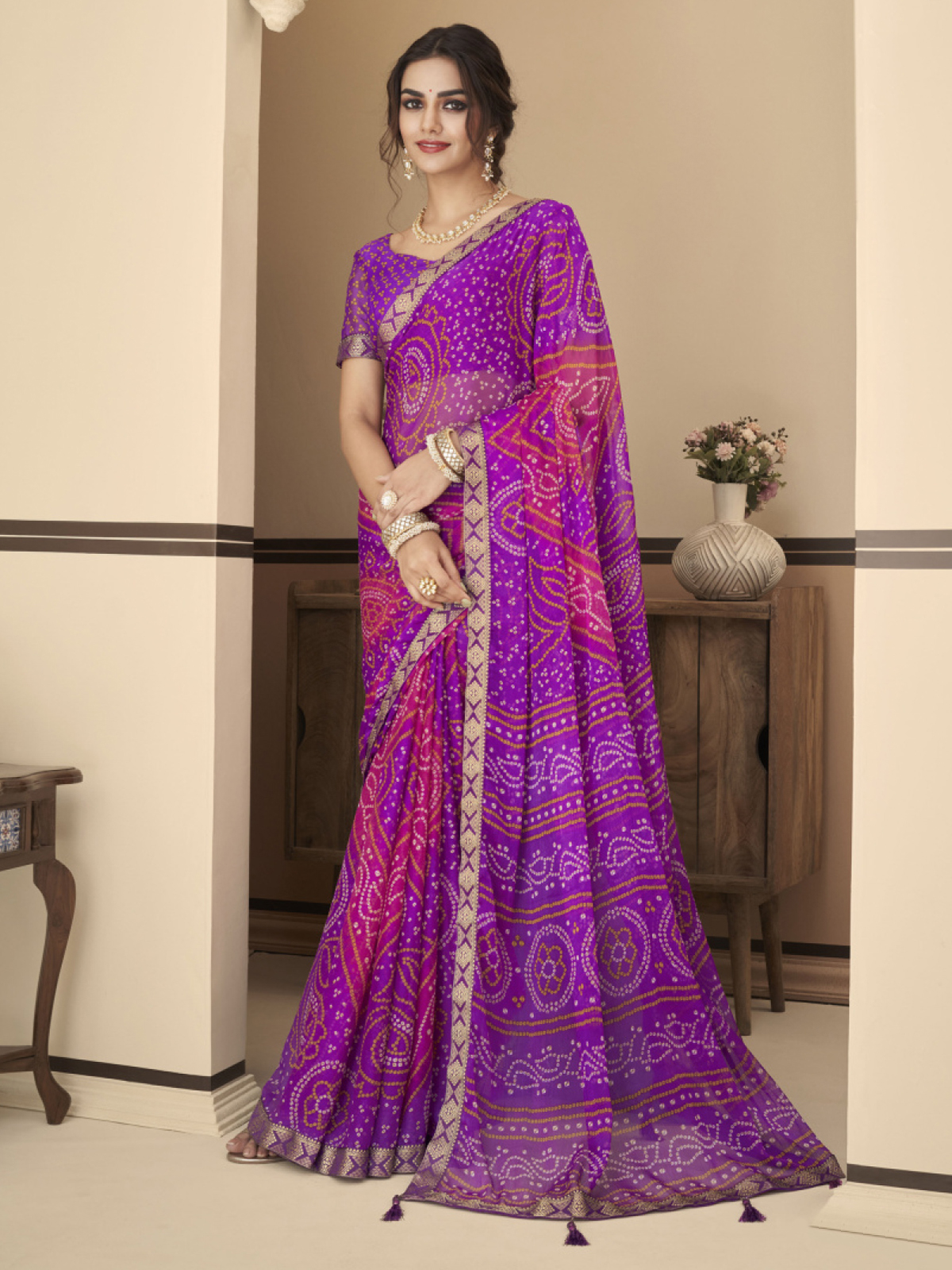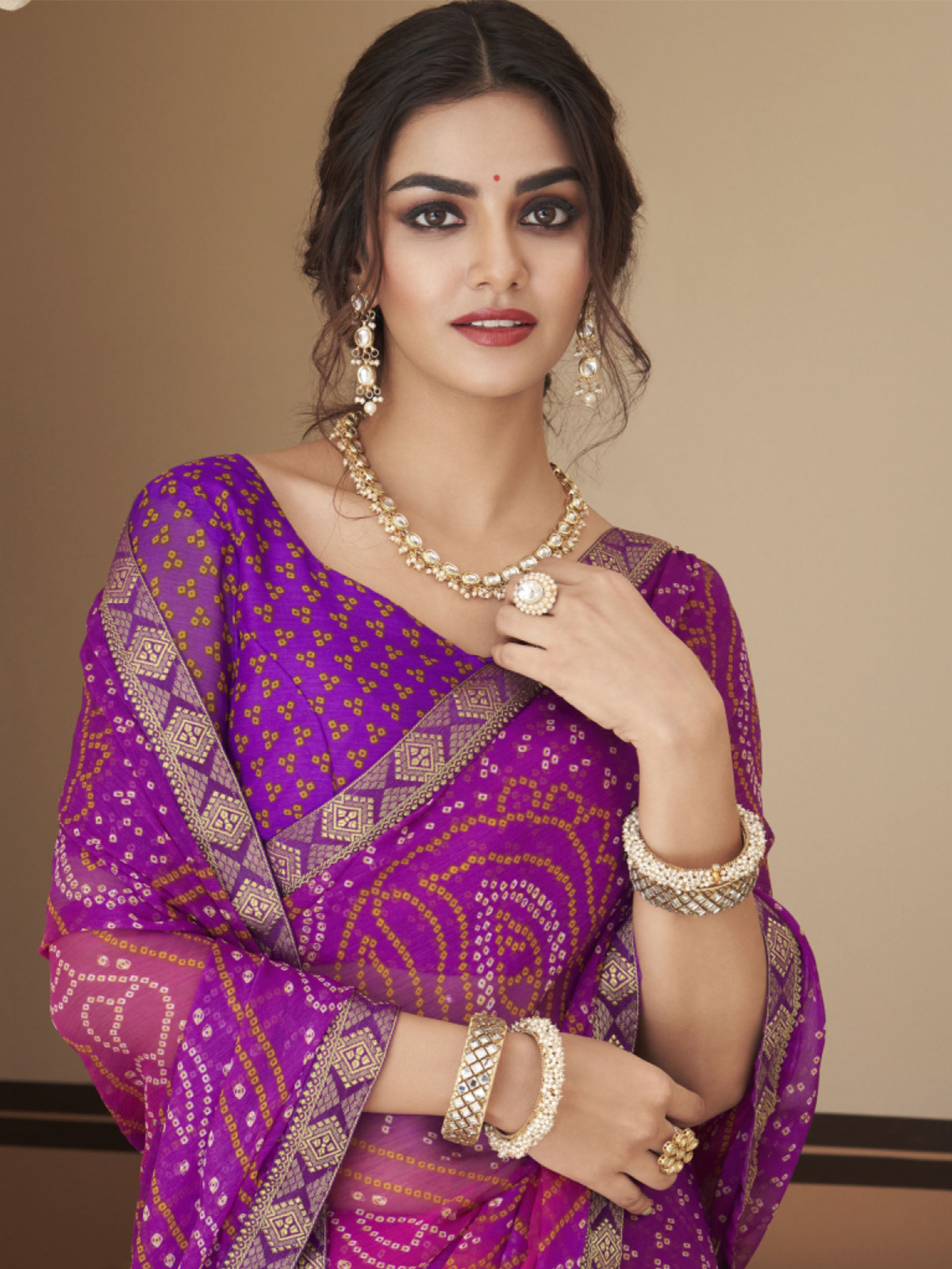 Embrace tradition with a purple bandhej printed chiffon saree, perfect for a touch of ethnic charm.