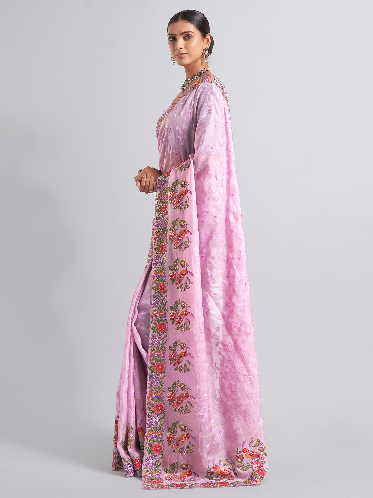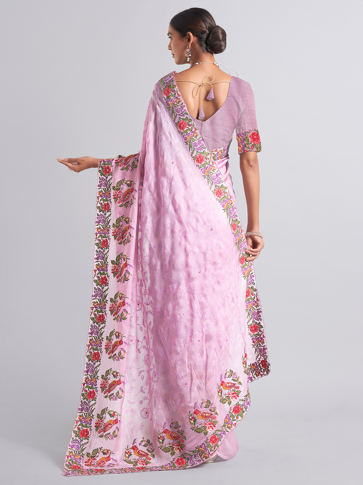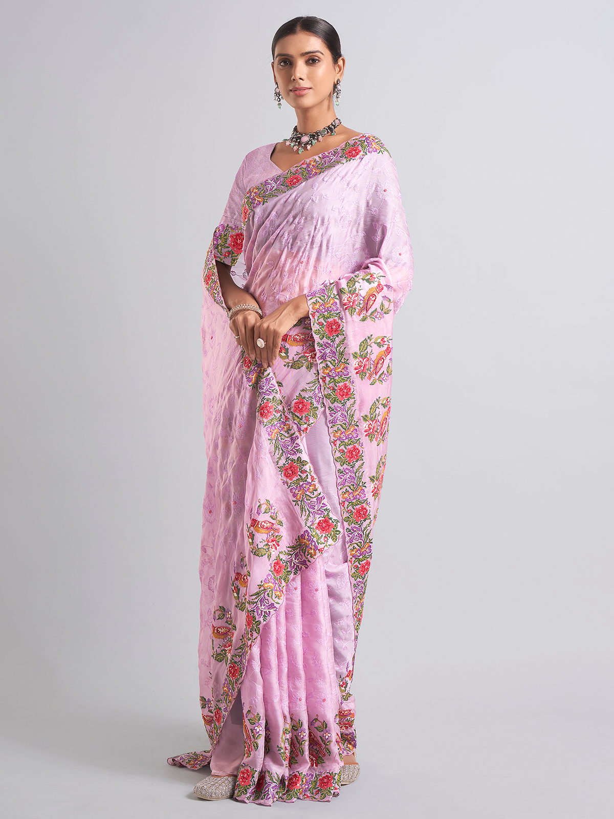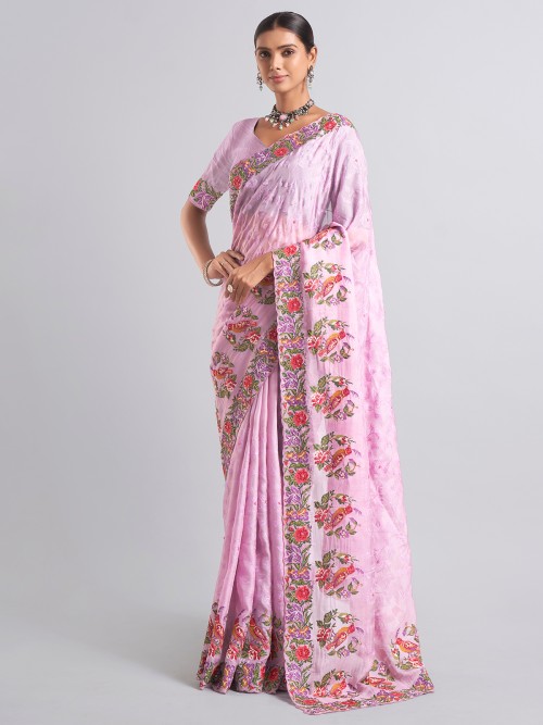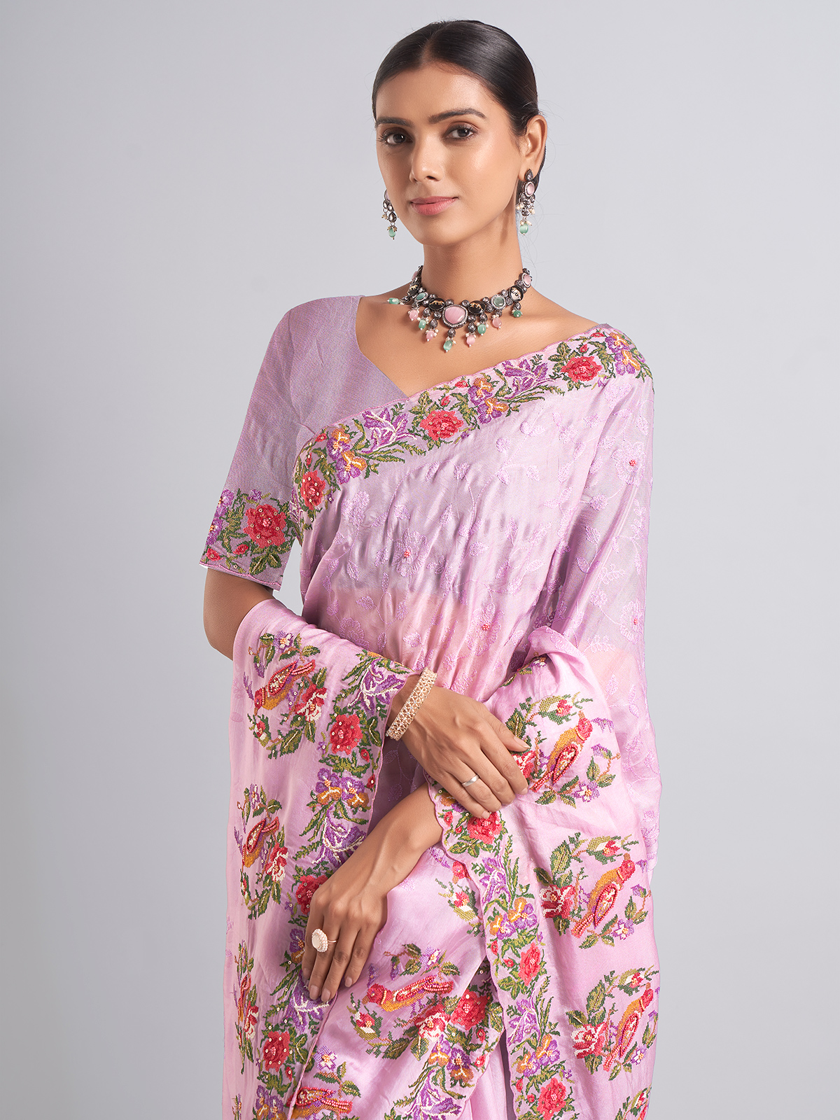 Elevate your elegance with the purple saree, adorned with beads, sequins, thread and embroidery work. The chiffon fabric adds a touch of sophistication, and it comes with an unstitched blouse.