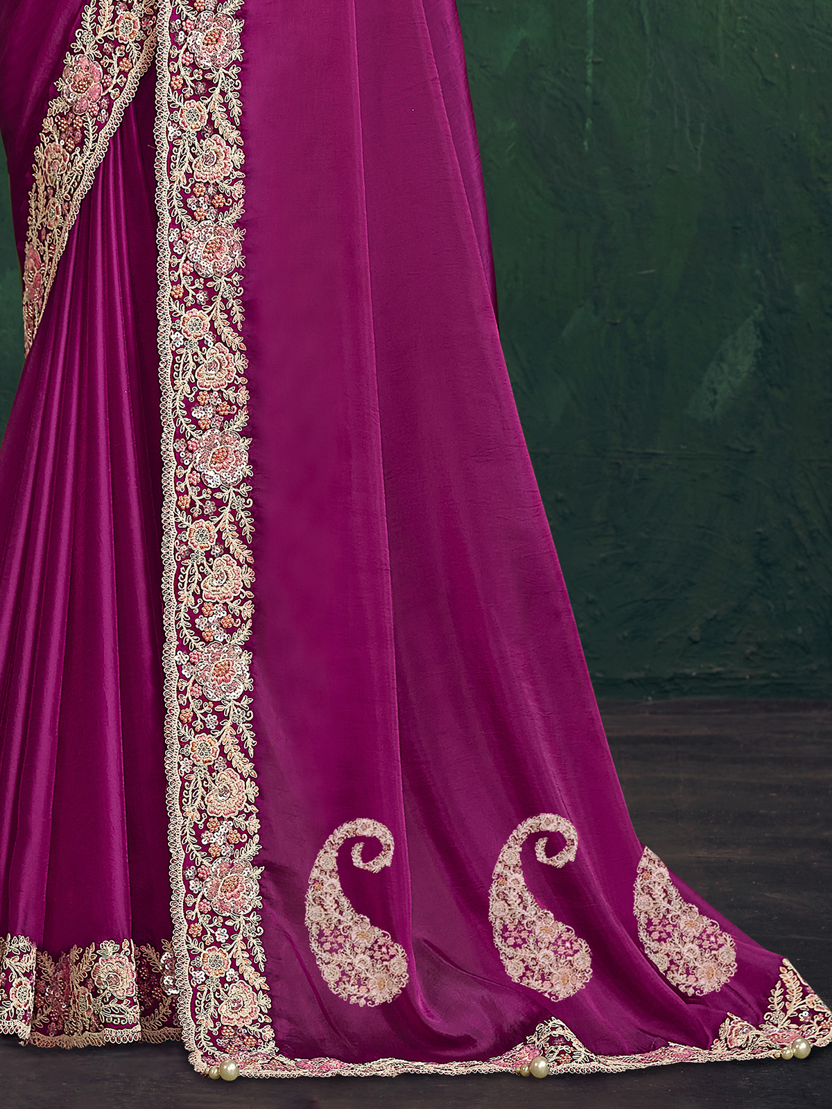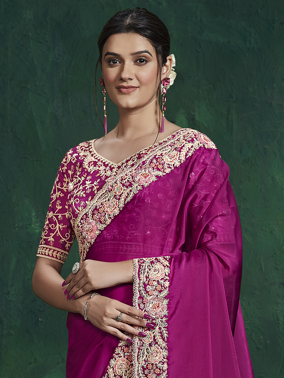 Rendered in rich purple crepe georgette silk saree. Showcases embroidery, sequins, stones and diamond accents for elegant sparkle. The lightweight drape ensures effortless grace. Paired with an unstitched blouse piece, it is perfect for weddings, receptions, sangeet and festive occasions.