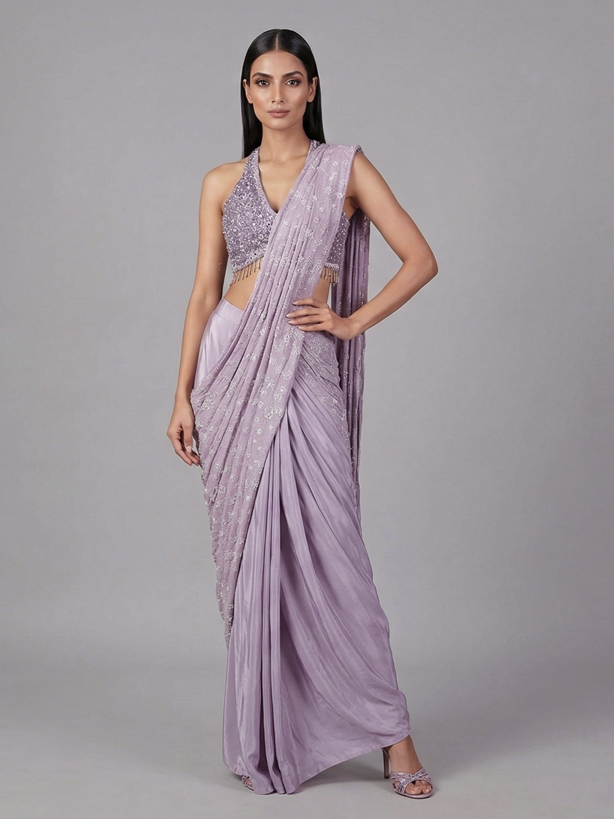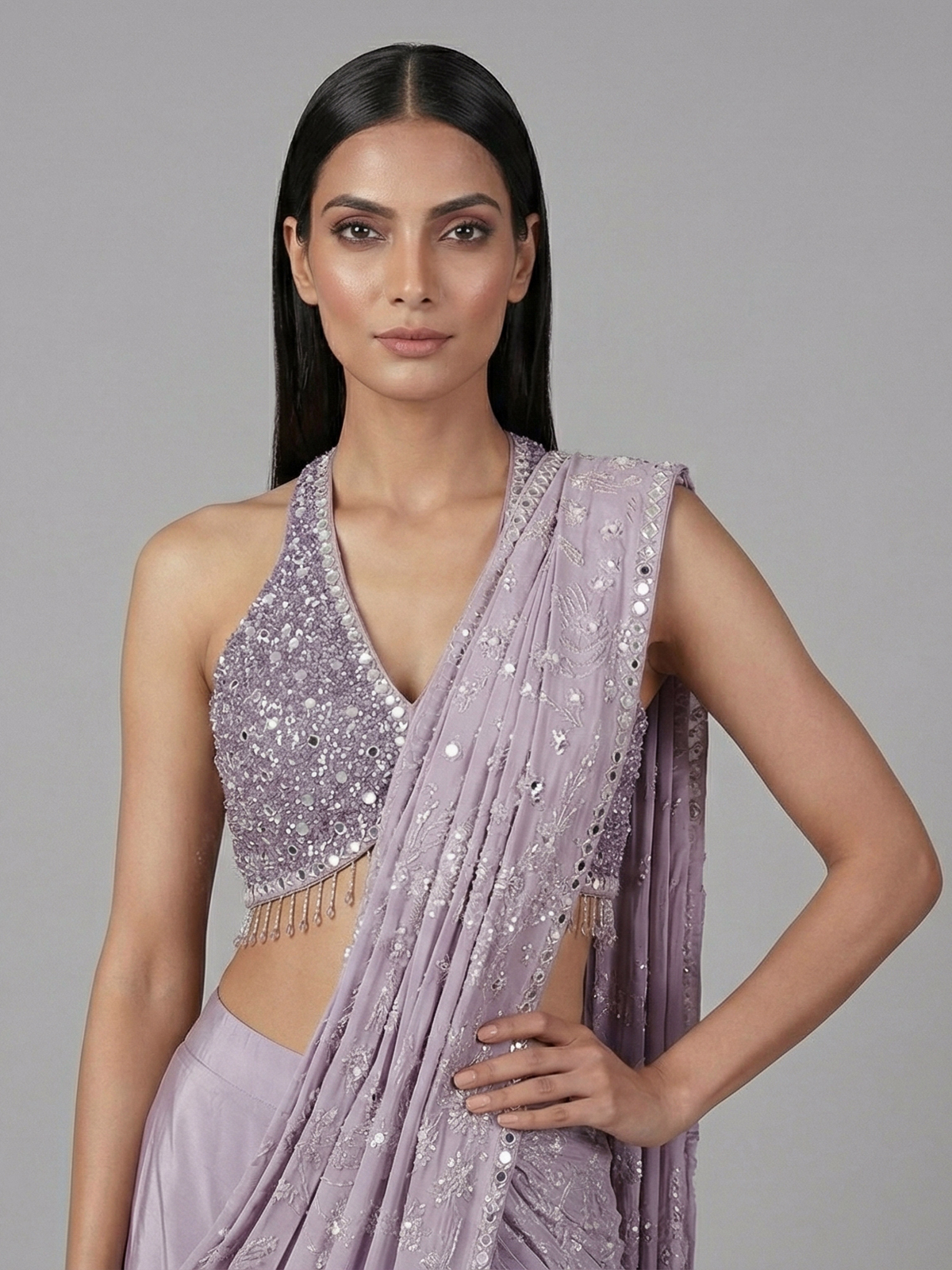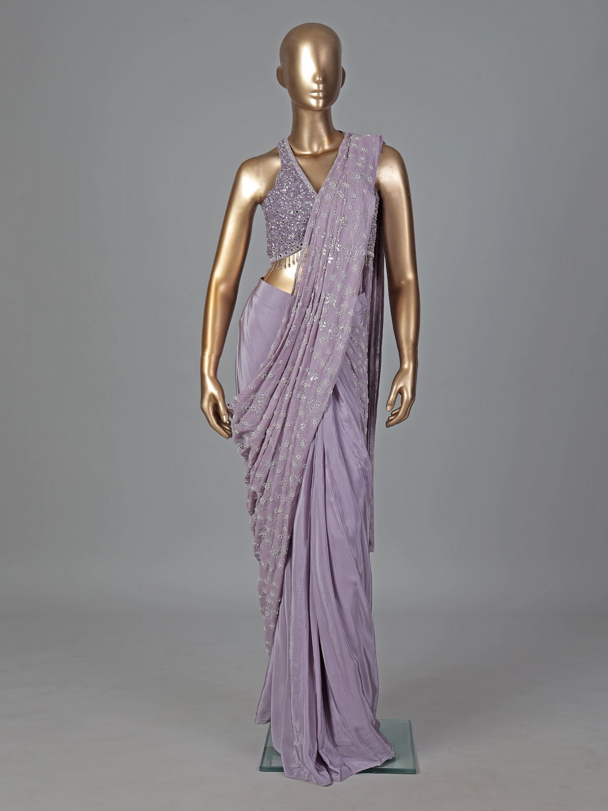 Vibrant purple hues bring festive brilliance to this crepe silk ready to wear saree. Adorned with embroidery, thread, sequins, cutdana, mirror and stone embellishments. It offers rich texture and shine. Perfect for weddings, receptions and parties. It captures bold elegance with refined grace.