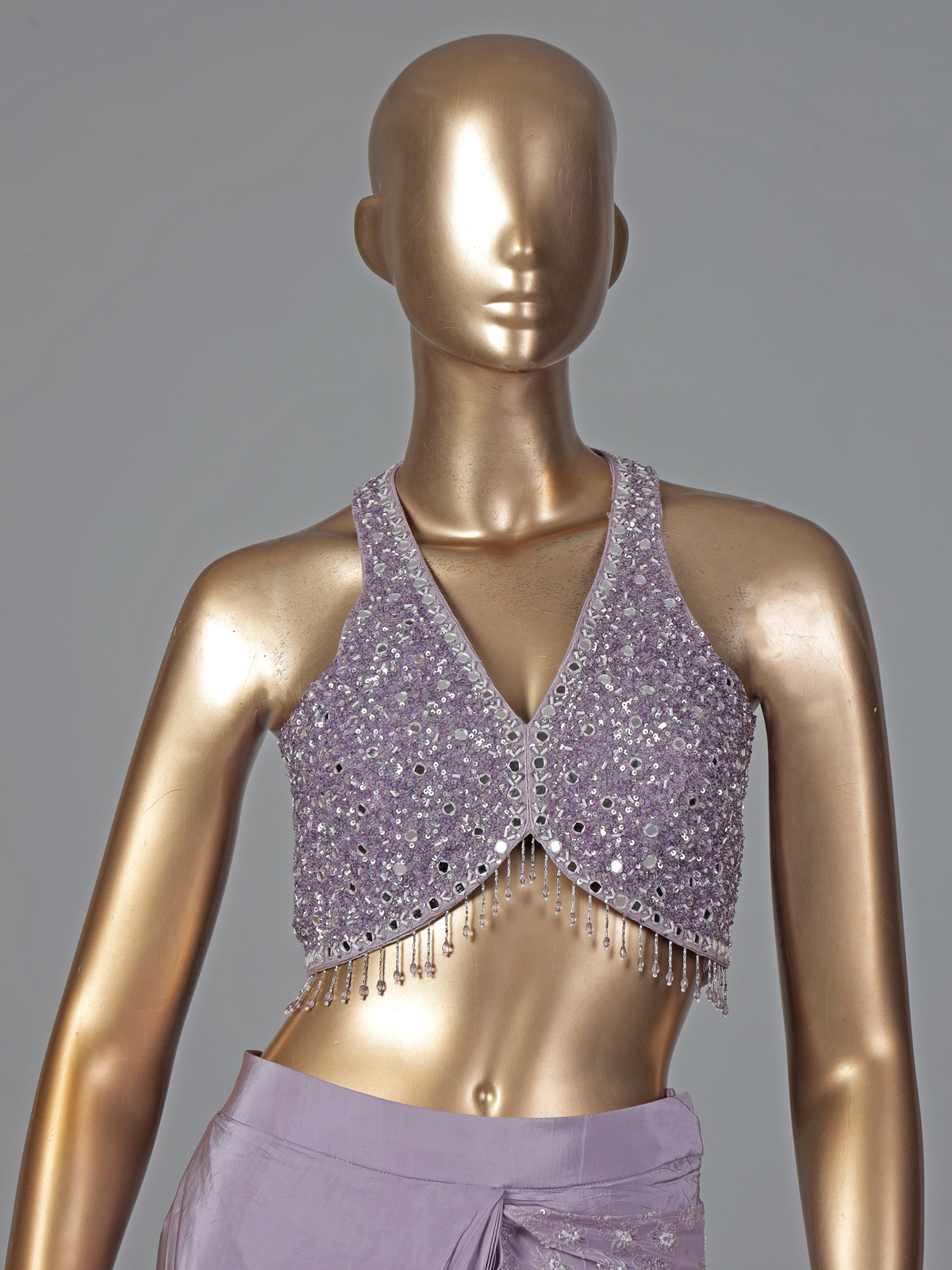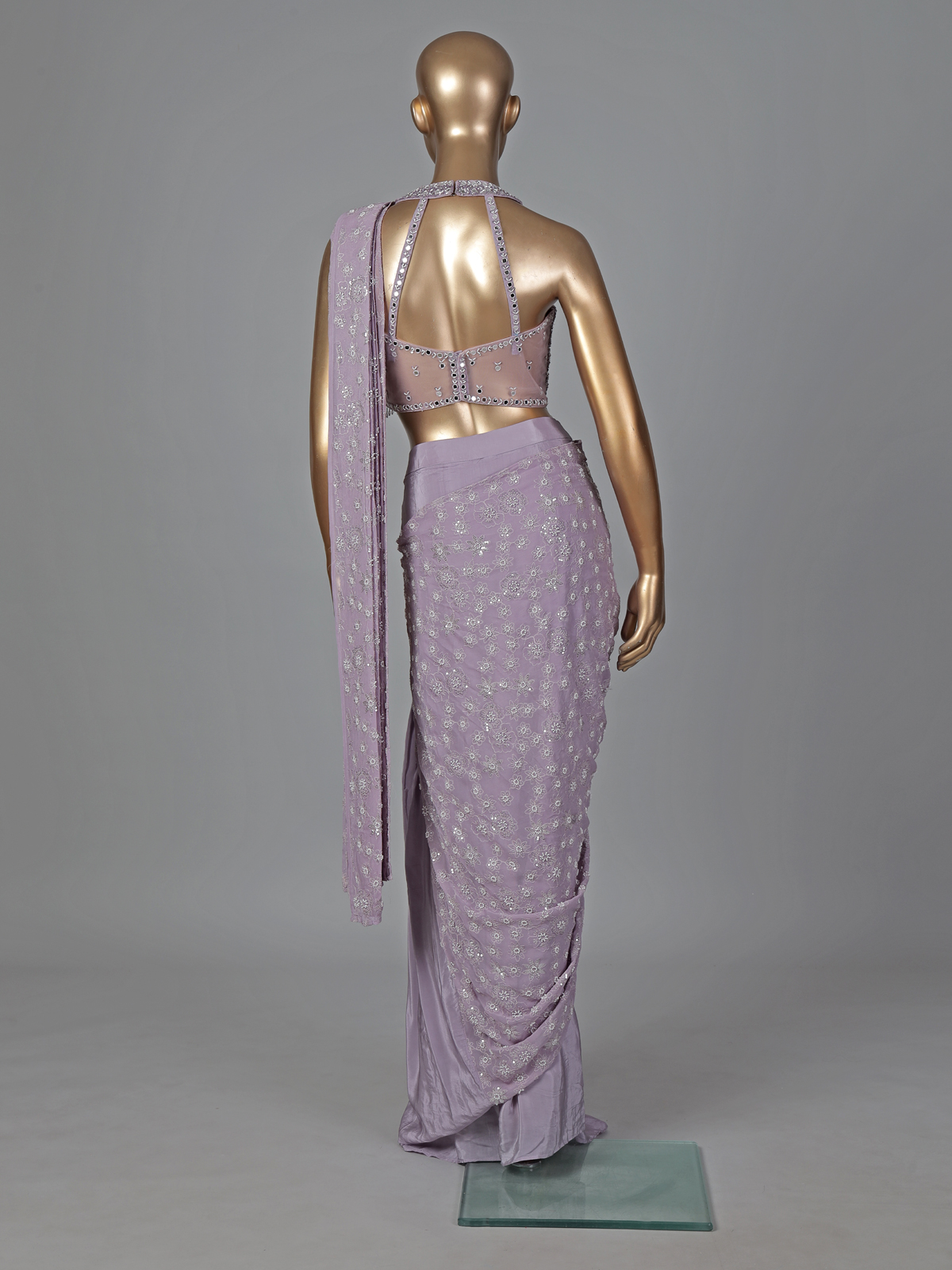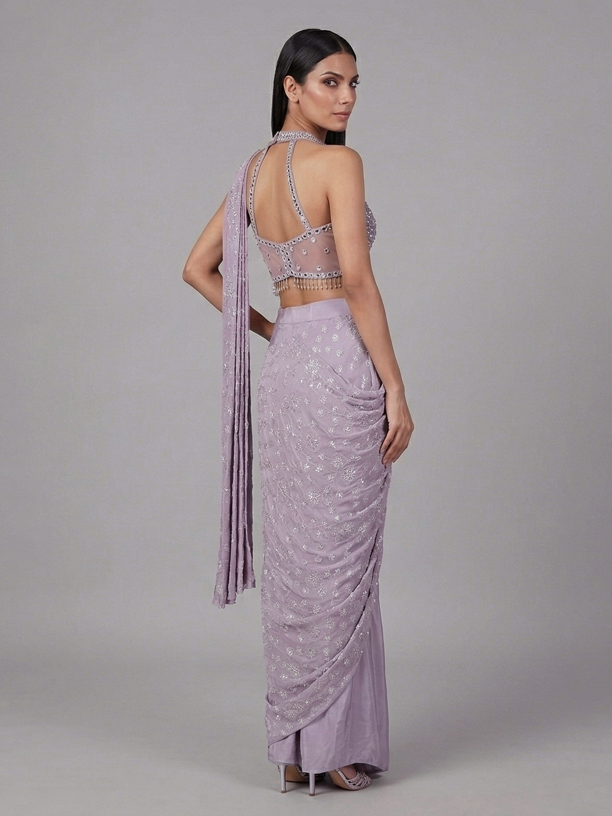 Vibrant purple hues bring festive brilliance to this crepe silk ready to wear saree. Adorned with embroidery, thread, sequins, cutdana, mirror and stone embellishments. It offers rich texture and shine. Perfect for weddings, receptions and parties. It captures bold elegance with refined grace.